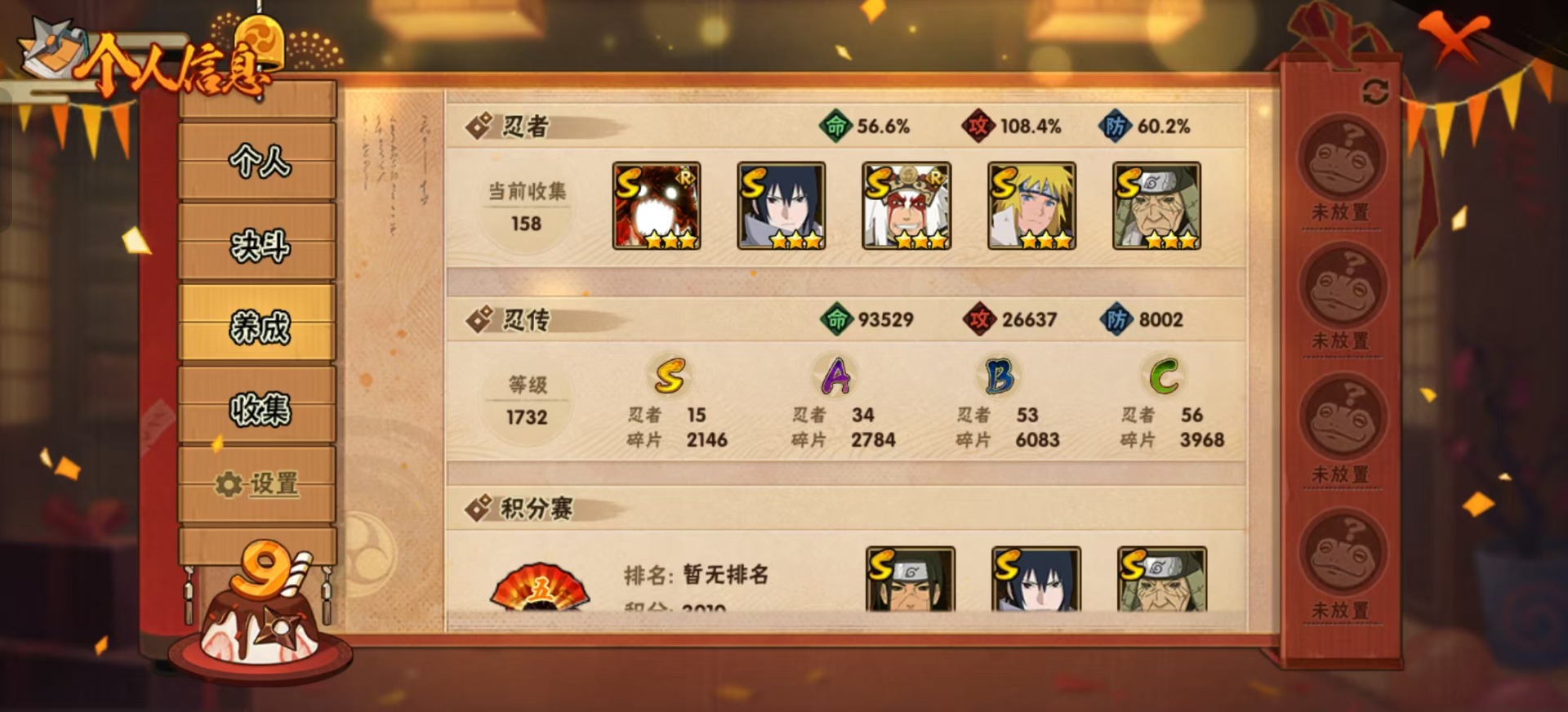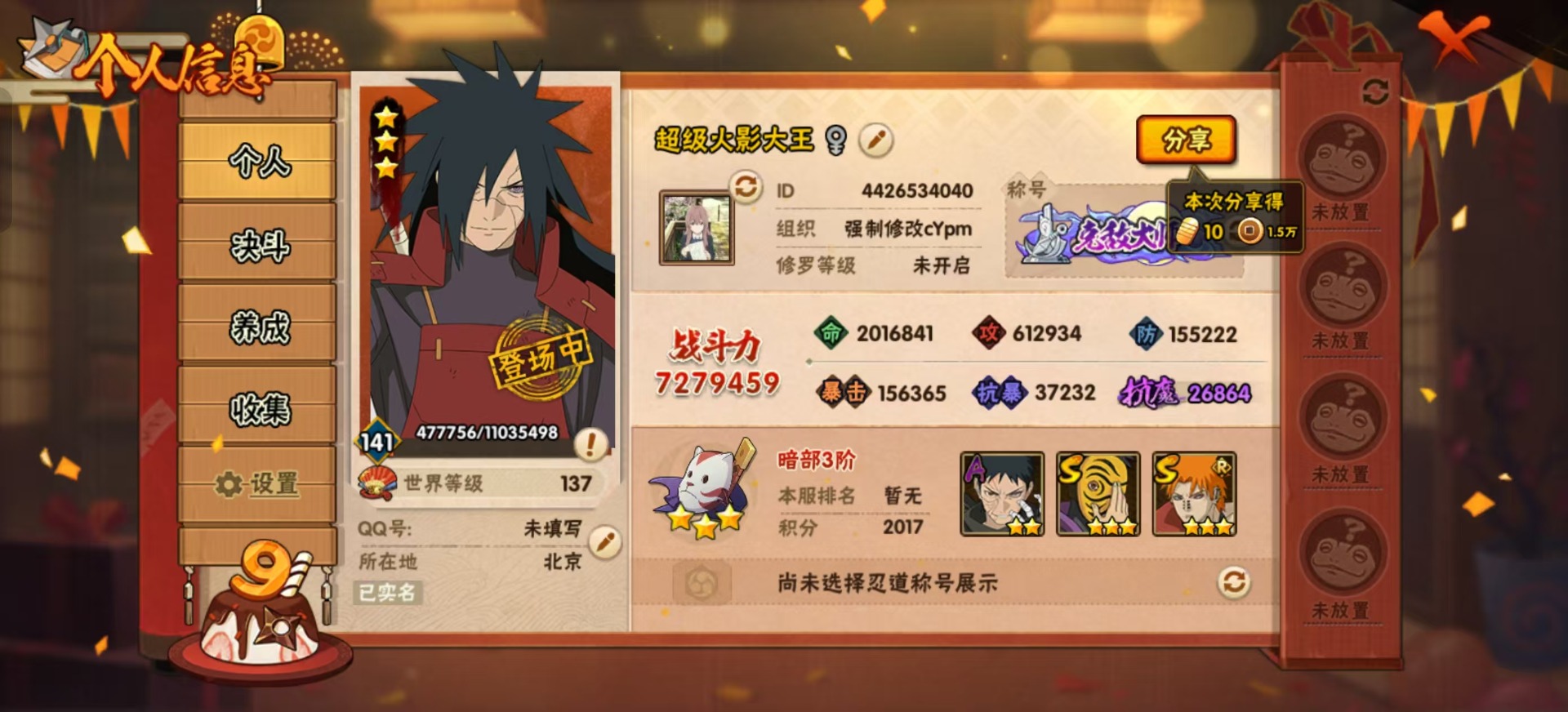 [12223950]V13 15S忍 34A忍 17通灵 727.9W战力 可二次 可修改实名 优质装备:熊猫,千手柱间「秽土转生」,罗砂「四代目风影」,宇智波鼬「秽土转生」,佩恩·天道「超」,猿飞日斩「秽土转生」,神秘面具男,神秘面具男 「红夜之刃」,宇智波佐助「永恒万花筒」,千手柱间·木叶创立,宇智波斑「秽土转生·解」,漩涡鸣人 「暴怒·第六尾」 S级忍者:自来也 「舞之豪杰」,宇智波鼬 「须佐能乎」,佩恩「天道」,波风水门