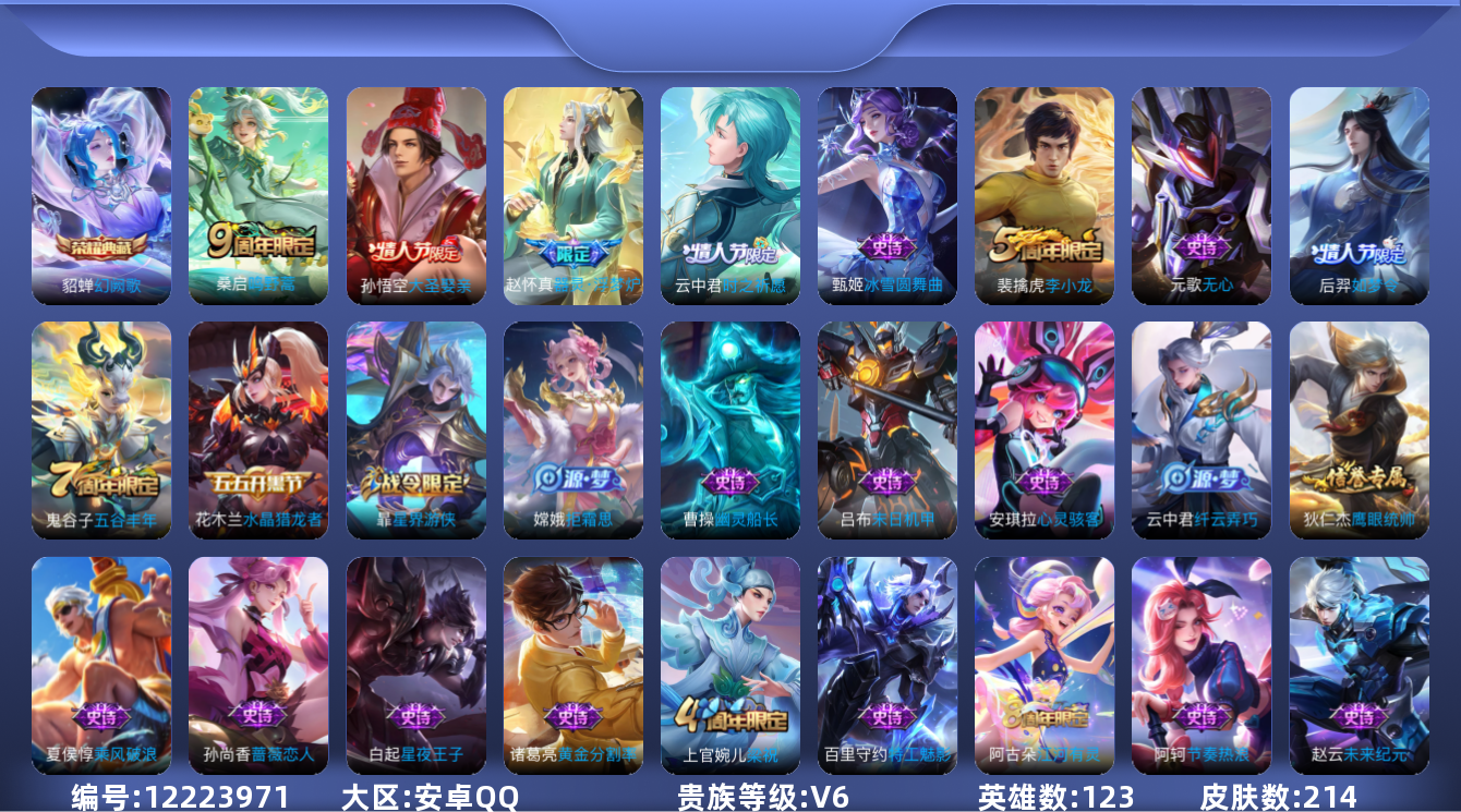 [12223971]V6 1典藏 1传说 123英雄 214皮肤 可修改实名 优质装备:幻阙歌(貂蝉典藏) 珍宝阁皮:蔷薇恋人,玩趣恶龙 限定皮:逐霄战戟,鸣野蒿,高山流水,五谷丰年,梁祝,天狼溯光者,李小龙,如梦令-后羿,大圣娶亲,时之祈愿-云中君 史诗皮:器灵·浮梦炉,黄金分割率,特工魅影,冰冠公主,江河有灵,百解令(蒙犽),偶像歌手,末日机甲-吕布,节奏热浪,水果甜心,天才门将,星夜王子,心灵骇客,功夫厨神,德古拉伯爵,暗隐猎兽者,幽灵船长,鬼剑武藏,舞动绿茵,纤云弄巧,拒霜思,缤纷独角兽,乘风破浪,逐浪之夏,水晶猎龙者,金属风暴,圣诞狂欢,鹰眼统帅,王者之锤,无心,未来纪元-赵云