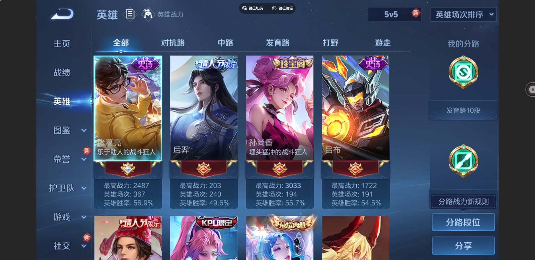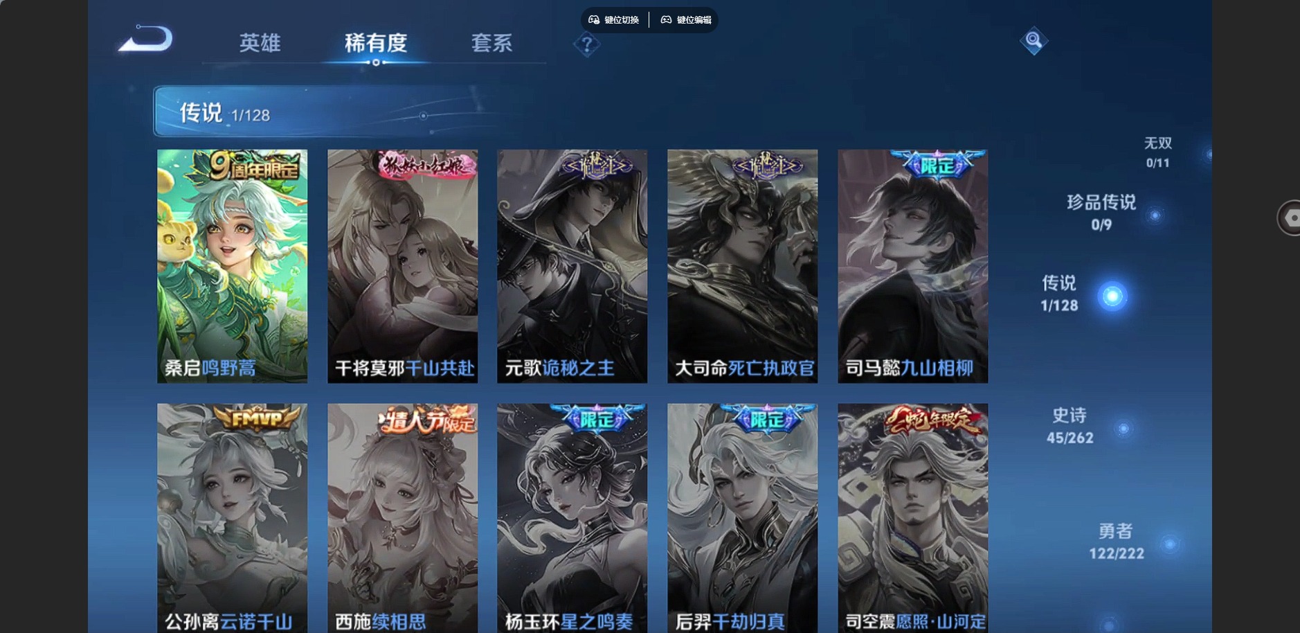 - [12145547]V7 7传说 122英雄 261皮肤 可修改实名 优质装备:地狱火,仲夏夜之梦(大飞蛾),山海·炽霜斩(李信年限),琥珀纪元铠,琥珀纪元马超 珍宝阁皮:万物之道,优雅恋人,蔷薇恋人 限定皮:逐霄战戟,鸣野蒿,至尊宝,魔法小厨娘,高山流水,五谷丰年,游园惊梦,梁祝,逐梦之翼,李小龙,永曜之星,猪悟能,青春决赛季,美猴王,山海·玄木吟(马可年限) 史诗皮:化蝶舞,怒海争锋,埋骨钱,芈月浮光幕影,紫霞仙子,苍穹之光,白龙吟,黄金分割率,特工魅影,千年之狐,江河有灵,魅语,蒙恬荣光圣徽,偶像歌手,暗夜猫娘,龙骑士(小龙虾),末日机甲-吕布,修罗,女仆咖啡,水果甜心,绅士熊喵,星夜王子,心灵骇客,功夫厨神,幽灵船长,鬼剑武藏,心灵战警,舞动绿茵,地狱岩魂,纤云弄巧,逐浪之夏,水晶猎龙者,箭羽风息,金属风暴,原初追逐者,圣诞狂欢,圣诞恋歌,鹰眼统帅,黎明之约,赏金猎手,无心