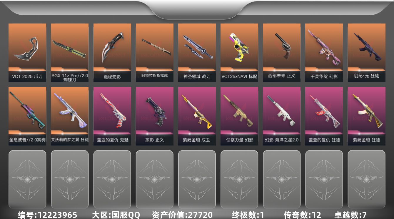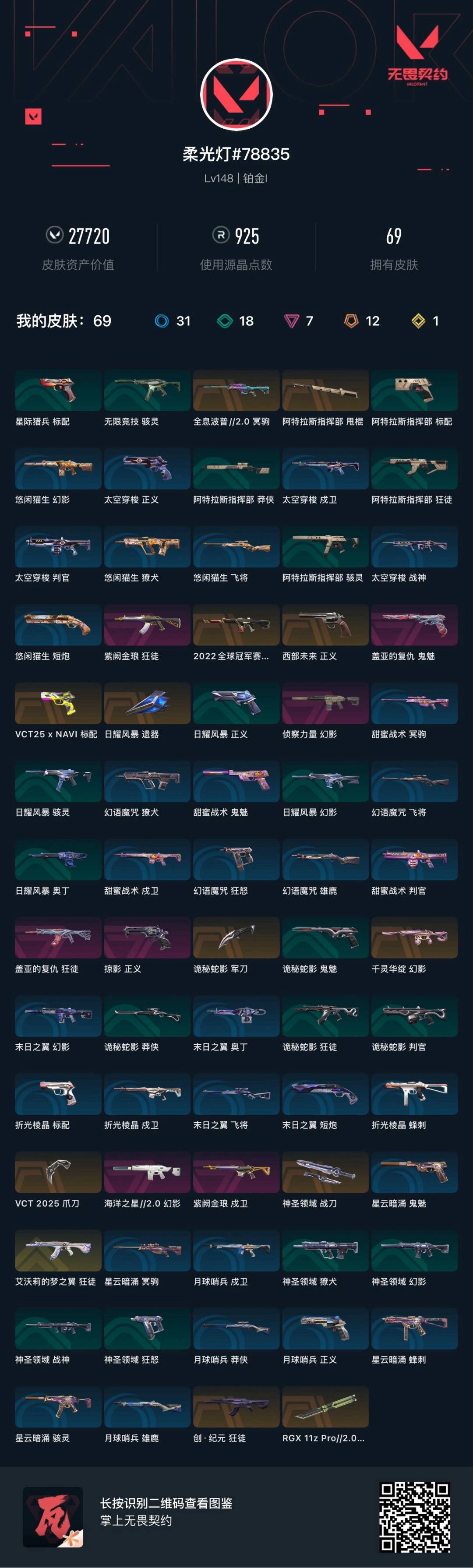 [12223965]12橙皮 1金皮 7紫皮 69皮肤 27英雄 117卡面 925已用源晶 铂金 优质装备:幻影-千灵华绽,狂徒-艾沃莉的梦之翼,狂徒-紫阙金琅,狂徒-盖亚的复仇,幻影-侦察力量,冥驹-全息波普//2.0,正义-掠影,鬼魅-盖亚的复仇,神圣领域 战刀,RGX 11z Pro//2.0 蝴蝶刀,VCT 2025 爪刀,诡秘蛇影,阿特拉斯指挥部,戍卫-紫阙金琅 套装:VCT 2025赛季礼包,VCTCN2025套装 佩枪皮肤:标配-VCT25xNAVI,正义-西部未来 步枪皮肤:幻影-海洋之星2.0,狂徒-创·纪元