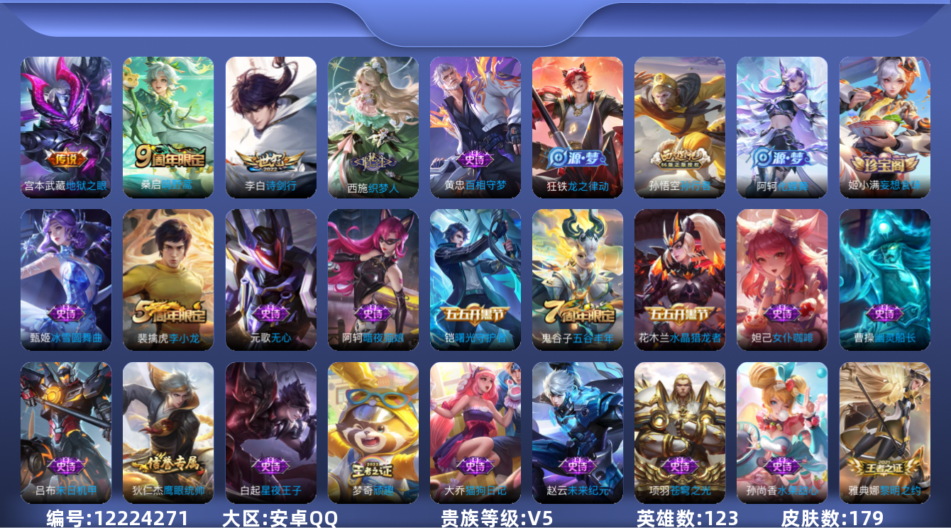 [12224271]【商品标题】:安卓Q-V5-最强王者段位-123英雄-179皮肤-0典藏-0珍品无双-0无双-0珍品传说-3传说-40史诗