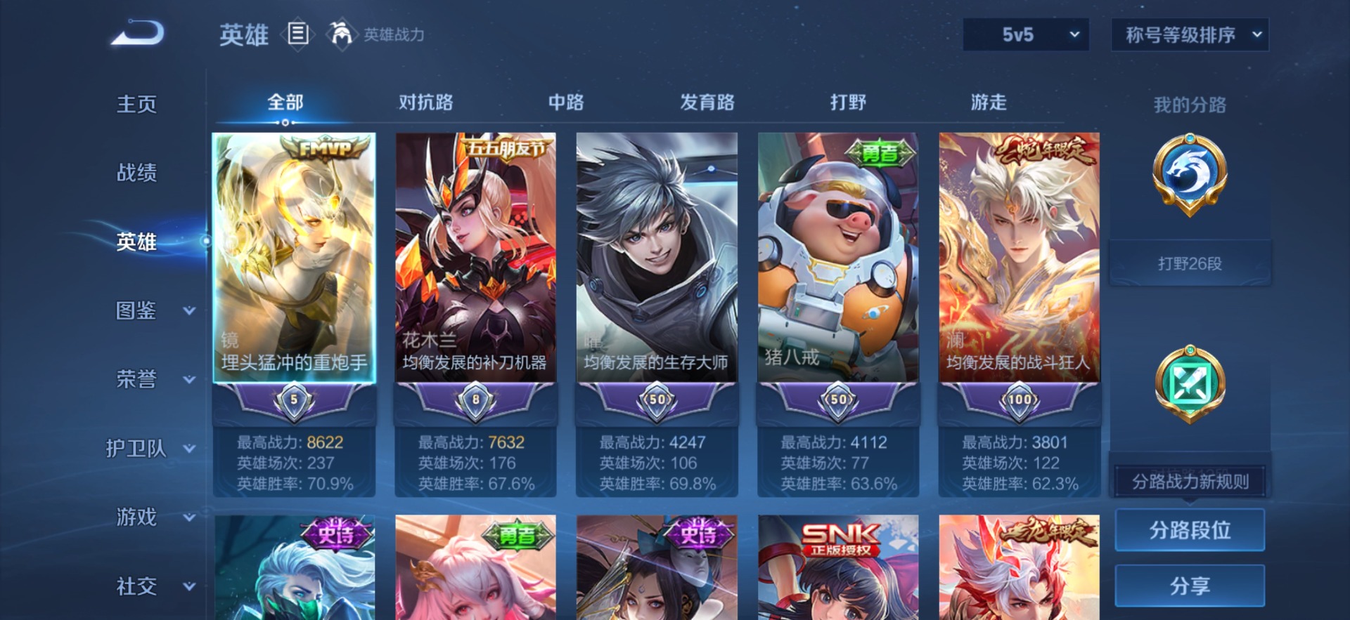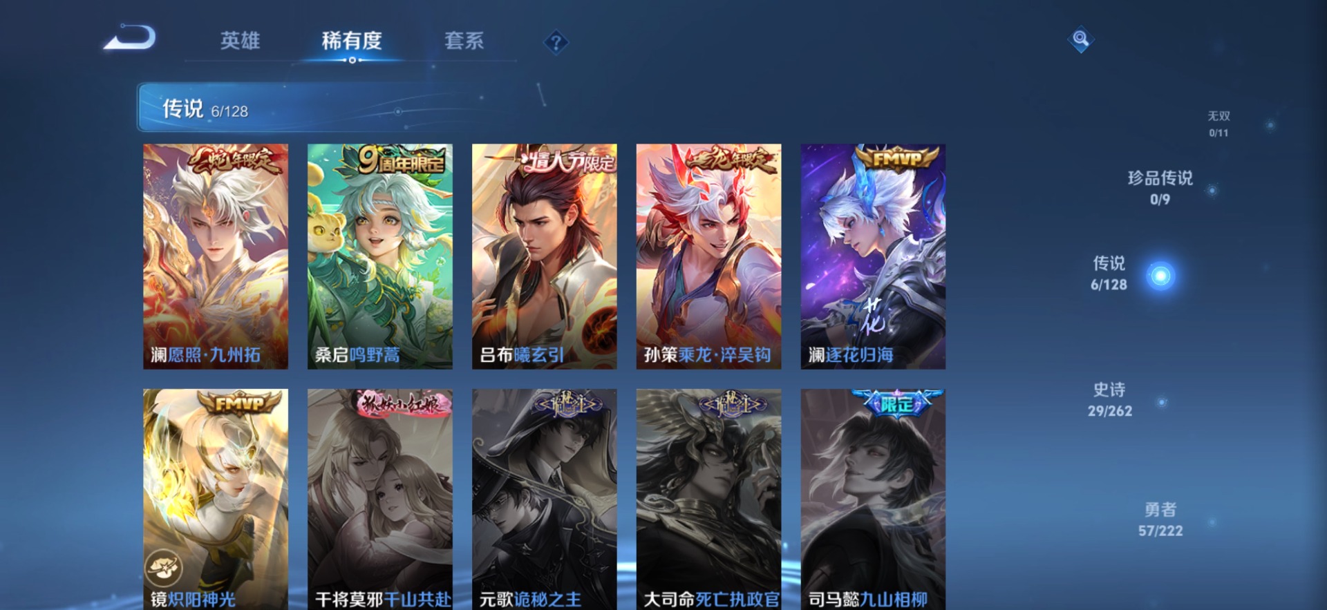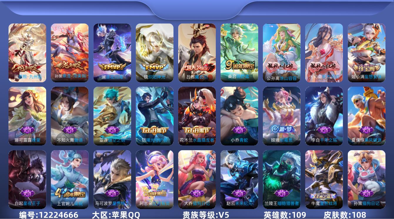 [12224666]V5 6传说 109英雄 108皮肤 可修改实名 优质装备:炽阳神光,澜逐花归海,涂山容容 传说皮:乘龙·淬吴钩(孙策年限),吕布曦玄引 珍宝阁皮:妄想食味 限定皮:愿照·九州拓(澜年限),鸣野蒿,梁祝 史诗皮:星界战将,星界特工,破空之剑,东方月初,千年之狐,江河有灵,青蛇,蒙恬荣光圣徽,魅语,晚萤,猫狗日记-孙策,猫狗日记-大乔,乱世虎臣,星夜王子,德古拉伯爵,暗隐猎兽者,鬼剑武藏,拒霜思,乘风破浪,水晶猎龙者,曙光守护者,圣诞恋歌,魅力维加斯,未来纪元-赵云