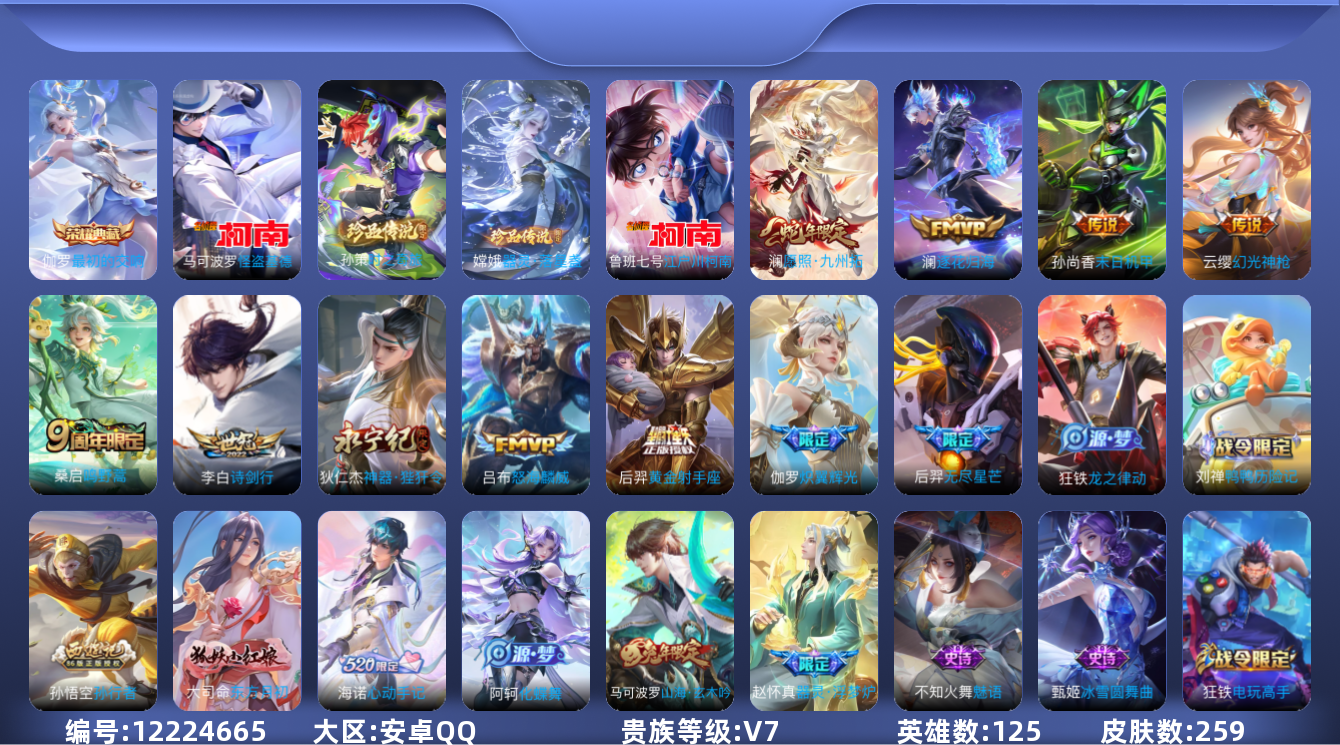[12224665]V7 1典藏 4珍品传说 11传说 125英雄 259皮肤 可修改实名 优质装备:最初的交响(伽罗典藏),江户川柯南,怪盗基德,器灵·落星盏,黄金射手座,末日机甲-孙尚香(绿蚂蚱),神器·狴犴令,炽翼辉光(娃娃菜牛角包),澜逐花归海 珍品传说:时之奇旅-孙策 传说皮:幻光神枪 珍宝阁皮:蔷薇恋人,女武神 限定皮:愿照·九州拓(澜年限),逐霄战戟,鸣野蒿,诗剑行,怒海麟威,五谷丰年,天狼溯光者,孙行者,无尽星芒,山海·玄木吟(马可年限) 史诗皮:鸭鸭历险记-刘禅,器灵·浮梦炉,化蝶舞,星界战将,龙之律动,怒海争锋,东方月初,芈月浮光幕影,海诺心动手记,蔬乡物语(鲁班七号),百相守梦-百里守约,紫霞仙子,苍穹之光,黄金分割率,特工魅影,千年之狐,江河有灵,浮梦罗烟,魅语,蒙恬荣光圣徽,无限星赏官,冰冠公主,偶像歌手,猫狗日记-孙策,乱世虎臣,女仆咖啡,摇滚巨星,水果甜心,天才门将,星夜王子,心灵骇客,德古拉伯爵,暗隐猎兽者,幽灵船长,鬼剑武藏,心灵战警,天秀·启明,舞动绿茵,地狱岩魂,纤云弄巧,水晶猎龙者,曙光守护者,箭羽风息,唤灵魅影,金属风暴,原初追逐者,鹰眼统帅,暗夜贵公子,魅力维加斯,黎明之约,雪上飞焰,无心,未来纪元-赵云,玫瑰异探