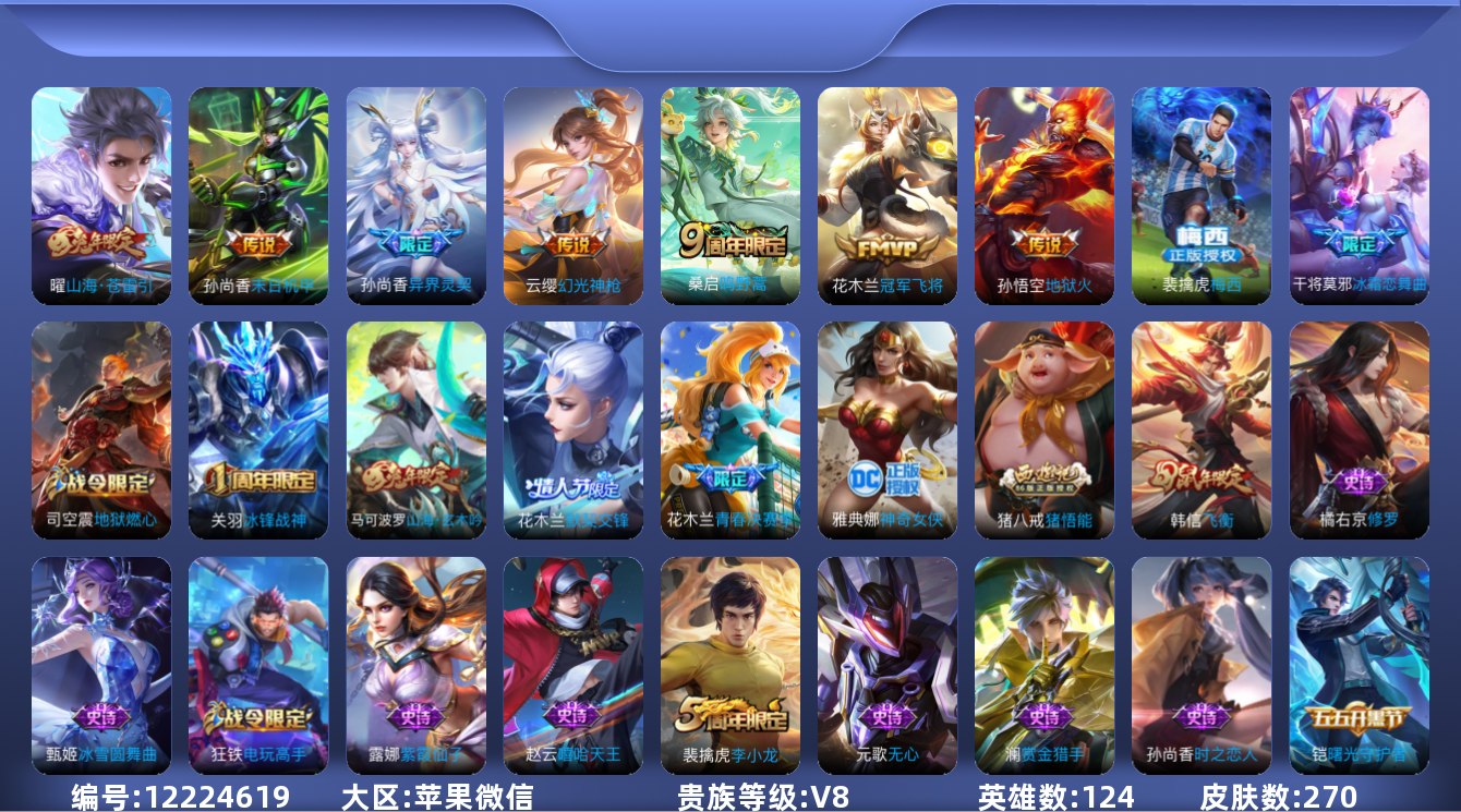 [12224619]V8 7传说 124英雄 270皮肤 可修改实名 钱包无法修改 支付冻结 优质装备:冠军飞将,末日机甲-孙尚香(绿蚂蚱),地狱火,山海·苍雷引(电光曜子) 传说皮:幻光神枪 珍宝阁皮:万物之道,蔷薇恋人,女武神 限定皮:鸣野蒿,梅西,异界灵契(白毛香),飞衡(韩信年限),遇见飞天,高山流水,五谷丰年,冰锋战神,游园惊梦,梁祝,逐梦之星,李小龙,默契交锋-花木兰,猪悟能,青春决赛季,冰霜恋舞曲,神奇女侠,山海·玄木吟(马可年限) 史诗皮:星界战将,紫霞仙子,苍穹之光,特工魅影,千年之狐,江河有灵,百解令(蒙犽),蒙恬荣光圣徽,无限星赏官,冰冠公主,偶像歌手,电玩·爆裂旋风,末日机甲-吕布,猫狗日记-孙策,时之恋人-孙尚香,乱世虎臣,节奏热浪,修罗,女仆咖啡,水果甜心,天才门将,星夜王子,功夫厨神,德古拉伯爵,暗隐猎兽者,幽灵船长,鬼剑武藏,舞动绿茵,纤云弄巧,乘风破浪,逐浪之夏,水晶猎龙者,曙光守护者,热力回旋,箭羽风息,金属风暴,原初追逐者,圣诞狂欢,鹰眼统帅,王者之锤,暗夜贵公子,魅力维加斯,黎明之约,赏金猎手,无心