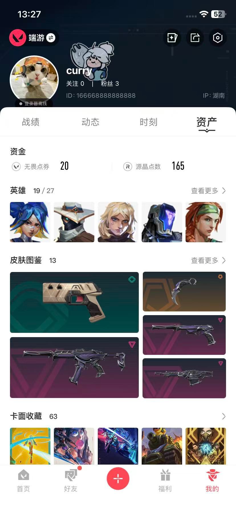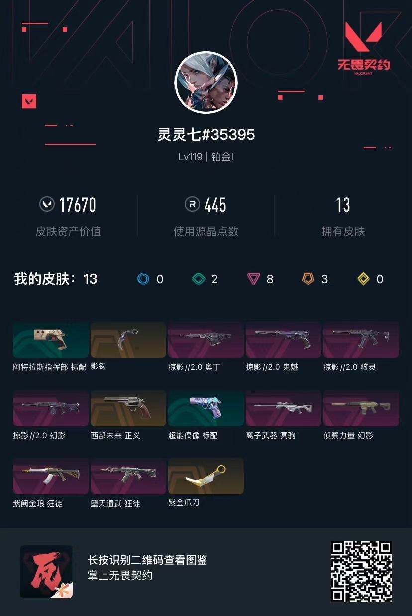 [12224705]3橙皮 8紫皮 13皮肤 19英雄 63卡面 445已用源晶 铂金 优质装备:狂徒-紫阙金琅,幻影-侦察力量,冥驹-离子武器,紫金爪刀,影钩 套装:掠影2.0套装 佩枪皮肤:鬼魅-掠影2.0,正义-西部未来 冲锋枪皮肤:骇灵-掠影2.0 步枪皮肤:幻影-掠影2.0,狂徒-堕天遗武 机枪皮肤:奥丁-掠影2.0