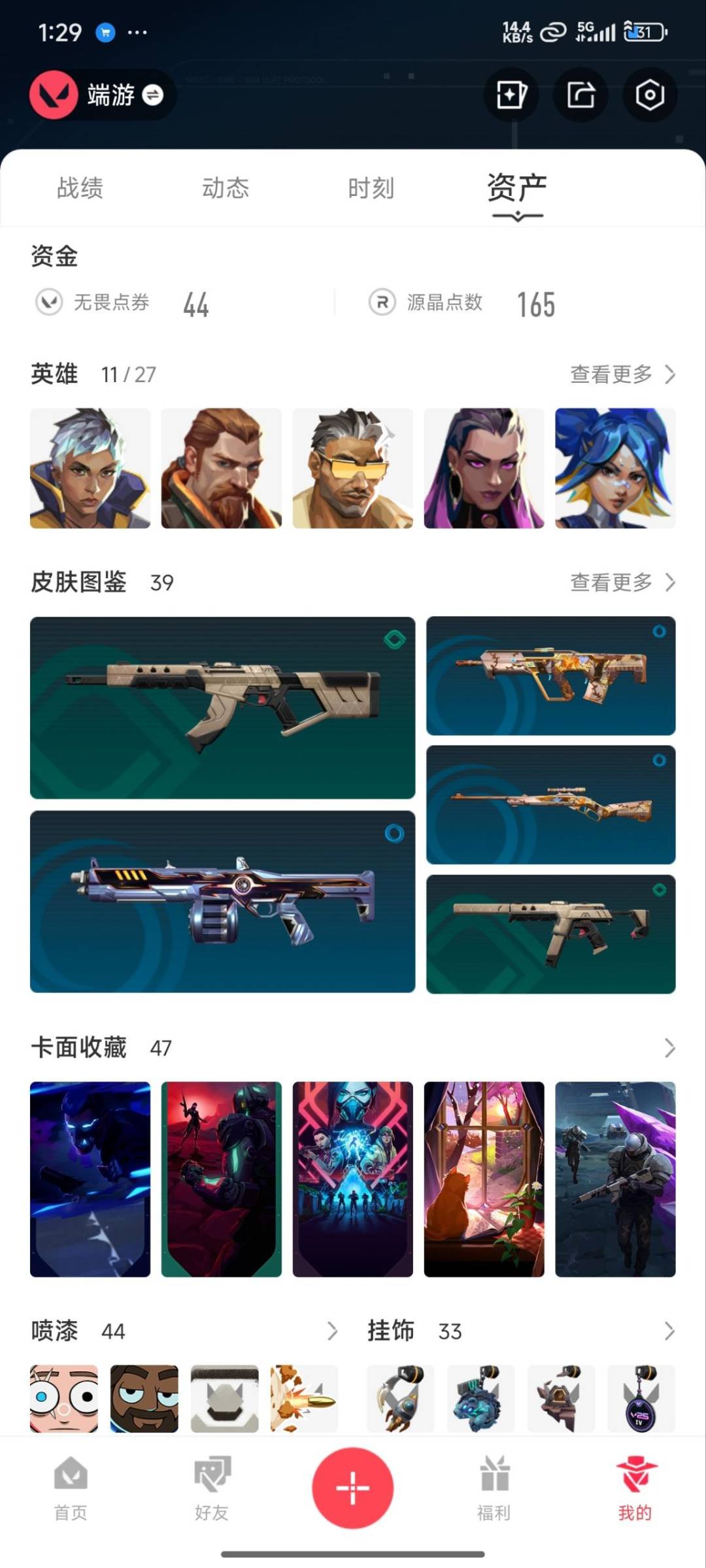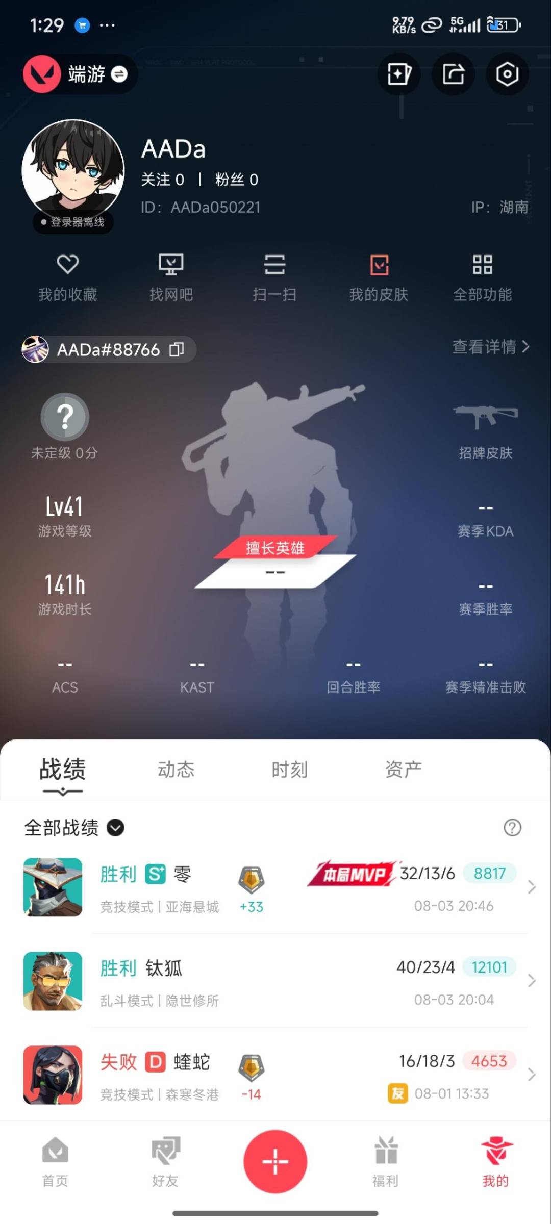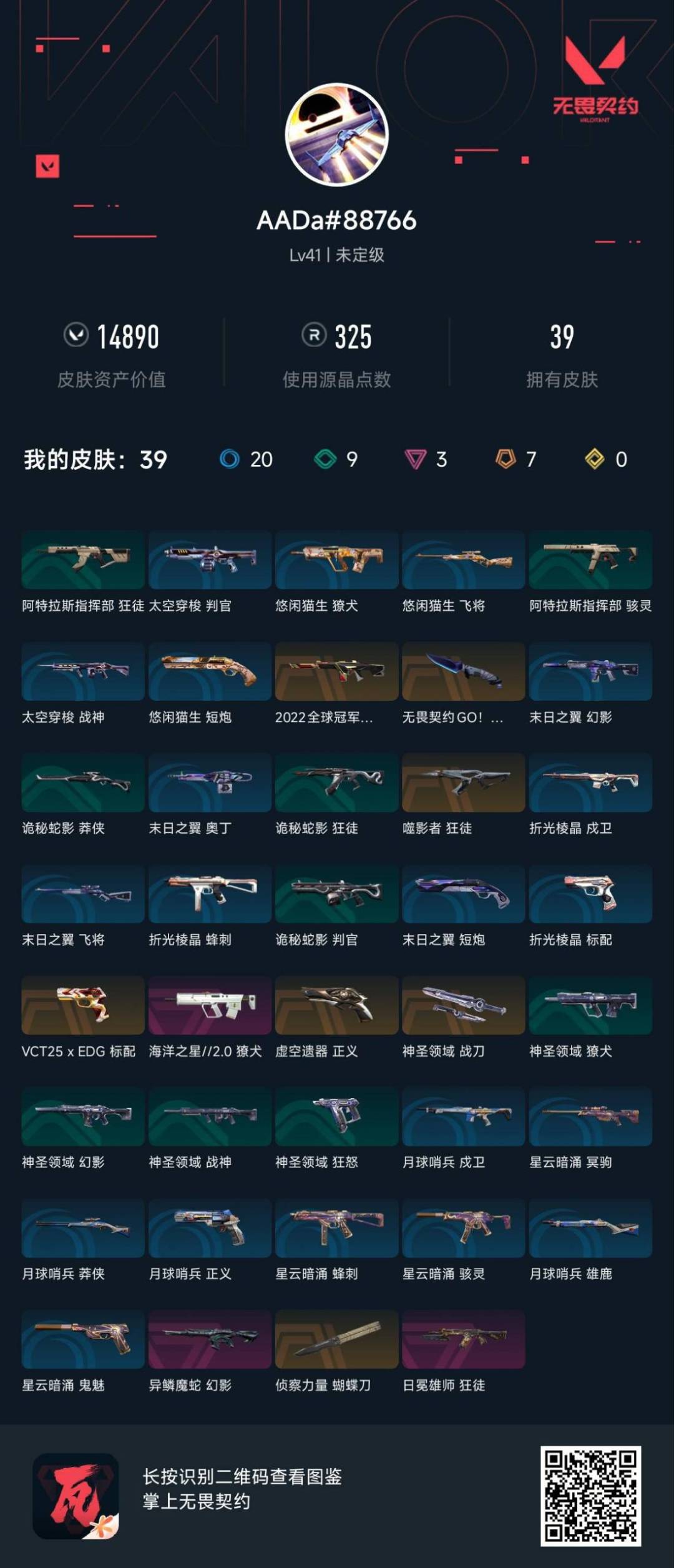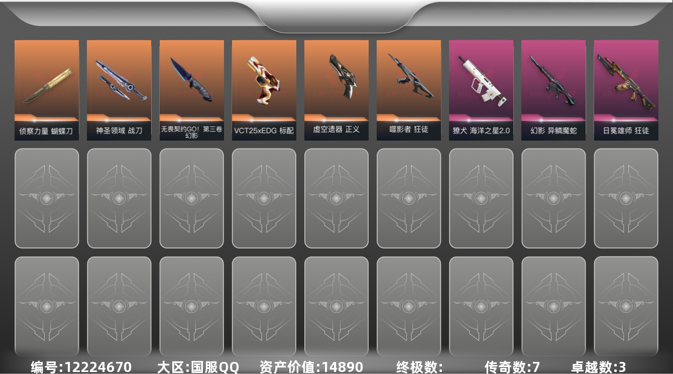 [12224670]7橙皮 3紫皮 39皮肤 11英雄 47卡面 325已用源晶 未定级 优质装备:狂徒-日冕雄师,蝴蝶刀-侦察力量,神圣领域 战刀,匕首-无畏契约GO!第三卷 佩枪皮肤:标配-VCT25xEDG,正义-虚空遗器 步枪皮肤:獠犬-海洋之星2.0,幻影-异鳞魔蛇,狂徒-噬影者