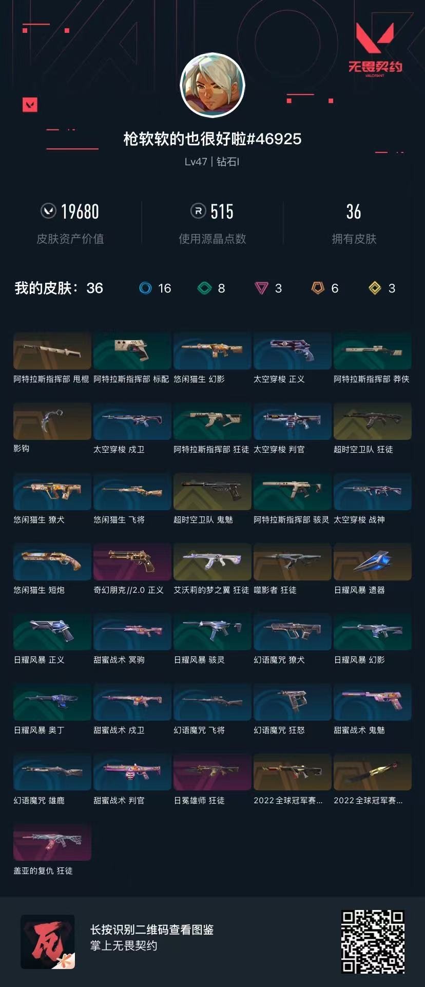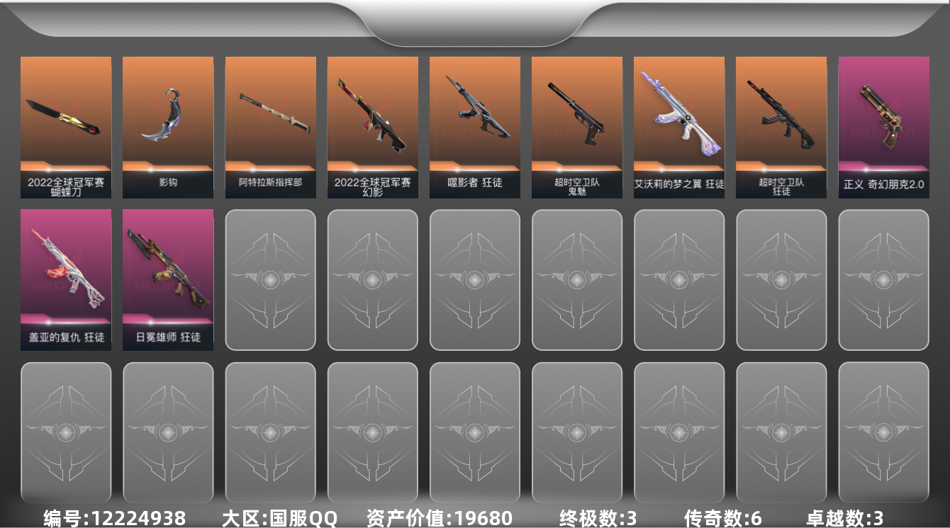 [12224938]6橙皮 3金皮 3紫皮 36皮肤 12英雄 60卡面 515已用源晶 钻石 优质装备:狂徒-艾沃莉的梦之翼,狂徒-盖亚的复仇,狂徒-日冕雄师,阿特拉斯指挥部,影钩 亮点皮肤:幻影-2022全球冠军赛,2022全球冠军赛 蝴蝶刀 套装:2022全球冠军赛 佩枪皮肤:正义-奇幻朋克2.0,鬼魅-超时空卫队 步枪皮肤:狂徒-噬影者,狂徒-超时空卫队