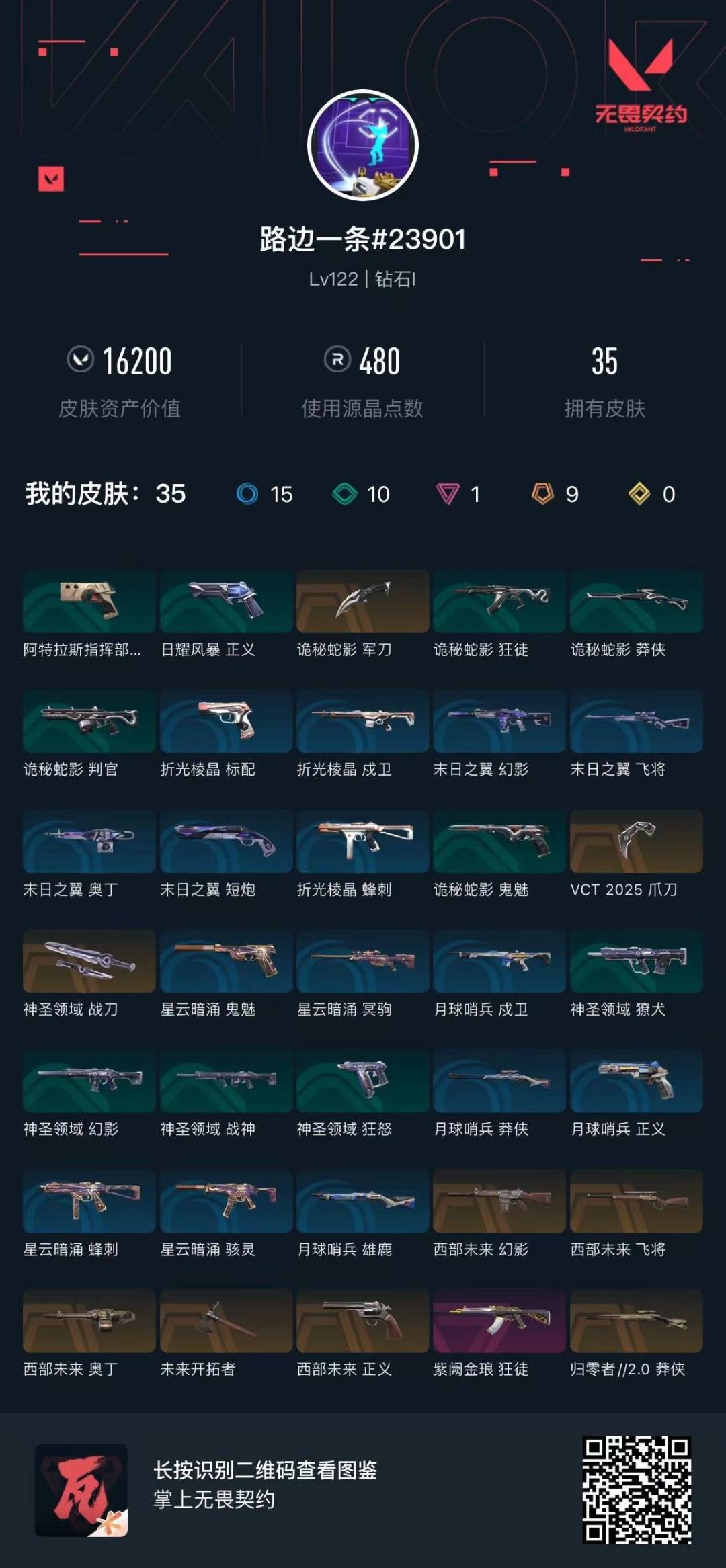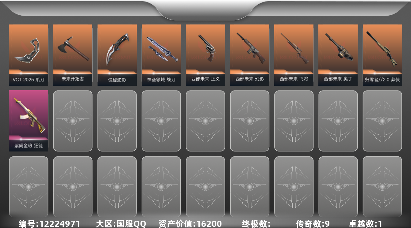 [12224971]9橙皮 1紫皮 35皮肤 21英雄 76卡面 480已用源晶 钻石 优质装备:狂徒-紫阙金琅,神圣领域 战刀,未来开拓者,VCT 2025 爪刀,诡秘蛇影 套装:VCT 2025赛季礼包,西部未来,VCTCN2025套装 佩枪皮肤:正义-西部未来 步枪皮肤:幻影-西部未来 狙击枪皮肤:莽侠-归零者//2.0,飞将-西部未来 机枪皮肤:奥丁-西部未来