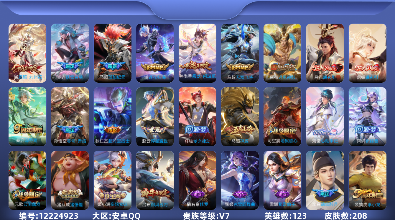 [12224923]V7 13传说 123英雄 208皮肤 可修改实名 优质装备:零号·赤焰,淬星耀世,超时空战士-狄仁杰,无双飞将,遇见神鼓,澜逐花归海,琥珀纪元马超 传说皮:乘龙·问璇玑(孙尚香年限),貂蝉曦玄引,吕布曦玄引,落雪白狼 珍宝阁皮:妄想食味,女武神 限定皮:愿照·九州拓(澜年限),逐霄战戟,鸣野蒿,神威(电光马子),五谷丰年,游园惊梦,御风骁将(吕布年限),李小龙,猪悟能 史诗皮:化蝶舞,谪仙醉月,龙之律动,茶境仙,海诺心动手记,紫霞仙子,白龙吟,黄金分割率,江河有灵,百解令(蒙犽),冰冠公主,偶像歌手,龙骑士(小龙虾),末日机甲-吕布,乱世虎臣,修罗,水果甜心,暗隐猎兽者,鬼剑武藏,舞动绿茵,纤云弄巧,繁星吟游(呼啦呼啦),拒霜思,缤纷独角兽,乘风破浪,逐浪之夏,水晶猎龙者,曙光守护者,金属风暴,圣诞狂欢,圣诞恋歌,鹰眼统帅,无心,未来纪元-赵云