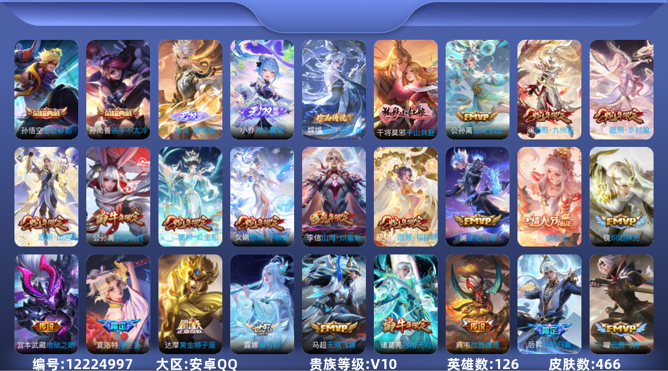 [12224997]V10 2典藏 2无双 1珍品传说 55传说 126英雄 466皮肤 典藏英雄武则天 可修改实名 优质装备:杀手不太冷,全息碎影(猴子典藏),小乔时之魔女(小乔无双),器灵·螭龙剑,器灵·落星盏,黄金狮子座,黄金射手座,冠军飞将,云鹰飞将(小将军),绛天战甲(鸡嘴战神),黄金白羊座,猫影幻舞,久胜战神,炽阳神光,地狱火,仲夏夜之梦(大飞蛾),零号·赤焰,海洋之心,地狱之眼,乞巧织情,时之恋人-刘备(电焊工),游龙清影(小青龙),超时空战士-狄仁杰,末日机甲-孙策,无双飞将,碎云,山海·炽霜斩(李信年限),画中仙,浮生妄,记忆之芯(机甲兔),灼幽烈阳,鲁班七号-时之奇旅,霜月吟,澜逐花归海,艾琳觅芳踪,牧神诗旅,玄雷天君,千劫归真,千山共赴,涂山容容 传说皮:典韦战鼓燎原,云诺千山,续相思,星之鸣奏,祥瑞亨通,幻光神枪 珍宝阁皮:万物之道,优雅恋人,女武神 限定皮:愿照·九州拓(澜年限),愿照·福禄聚(蔡文姬年限),愿照·岁时盈(虞姬年限),愿照·山河定(司空震年限),愿照·众生和(妲己年限),愿照·千秋盛(女娲年限),逐霄战戟,映山客,陌上桑,鸣野蒿,至尊宝,傲雪梅枪,绯月行,时之彼端,魔法小厨娘,白晶晶,时雨天司(水龙头),神威(电光马子),山海·碧波行(瑶年限),诗剑行,齐天大圣,怒海麟威,五谷丰年,冰锋战神,游园惊梦,梁祝,御风骁将(吕布年限),烈魂,逐梦之音,祈雪灵祝(雪兔子),李小龙,朱雀志(守约年限),圣诞老人,一生所爱,大圣娶亲,引擎之心,冰霜恋舞曲,美猴王,神器·万象笔,山海·玄木吟(马可年限),冰霜神祇 史诗皮:鸭鸭历险记-刘禅,飞车小橘子,苍鳞隐世,器灵·浮梦炉,糖绘人间,狼魂孤将,绮世丹青,瑰影绮梦,化蝶舞,灵蛊蚀心,星界战将,谪仙醉月,雪豹·霜爪,藏狐·褐绒,石田雨龙,戍鼓铭心,茶境仙,幻珠鲛人,怒海争锋,炽弈燎原,破空之剑,东方月初,蒙犽顽岩魄,芈月浮光幕影,琥珀纪元伽罗,决胜骁骑,上官婉儿群星魔术团,蔬乡物语(鲁班七号),百相守梦-百里守约,星界特工,百相守梦-黄忠,遇见神鹿,紫霞仙子,苍穹之光,电玩小子(小书包),白龙吟,黄金分割率,特工魅影,千年之狐,永昼,江河有灵,真我赫兹(百里守约),完美假期,魅语,高渐离燃音魔法,蒙恬荣光圣徽,无限星赏官,匿光破解者,冰冠公主,青蛇,偶像歌手,白蛇,晚萤,暗夜猫娘,百相守梦(关羽),银翎春