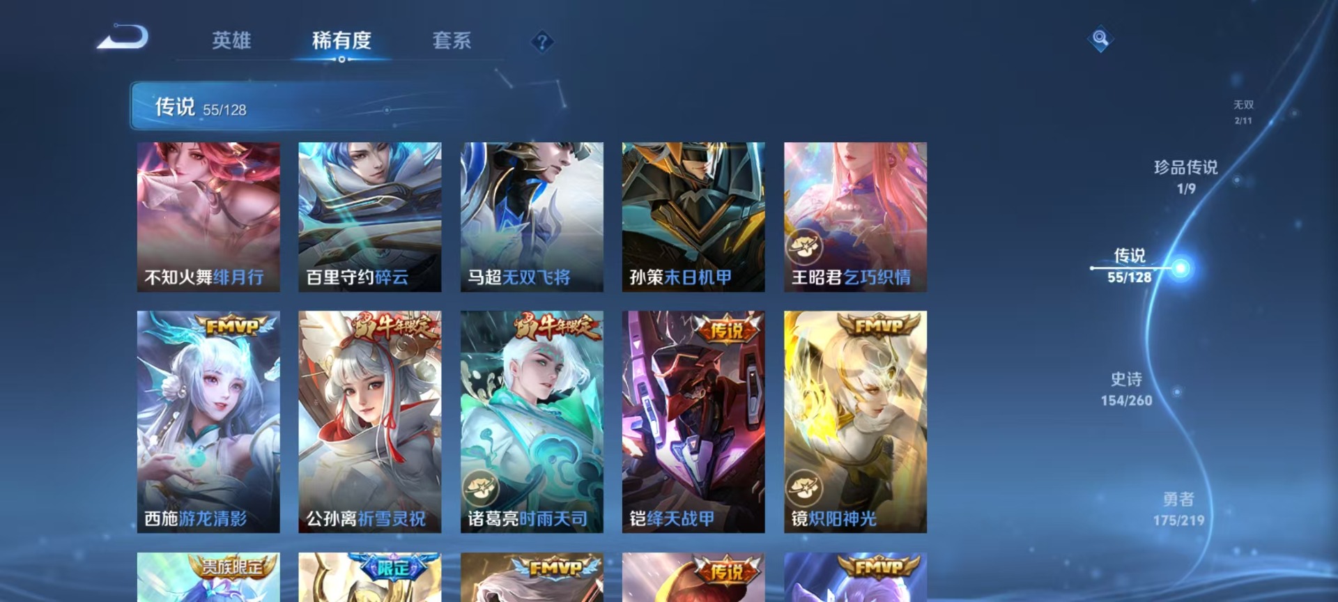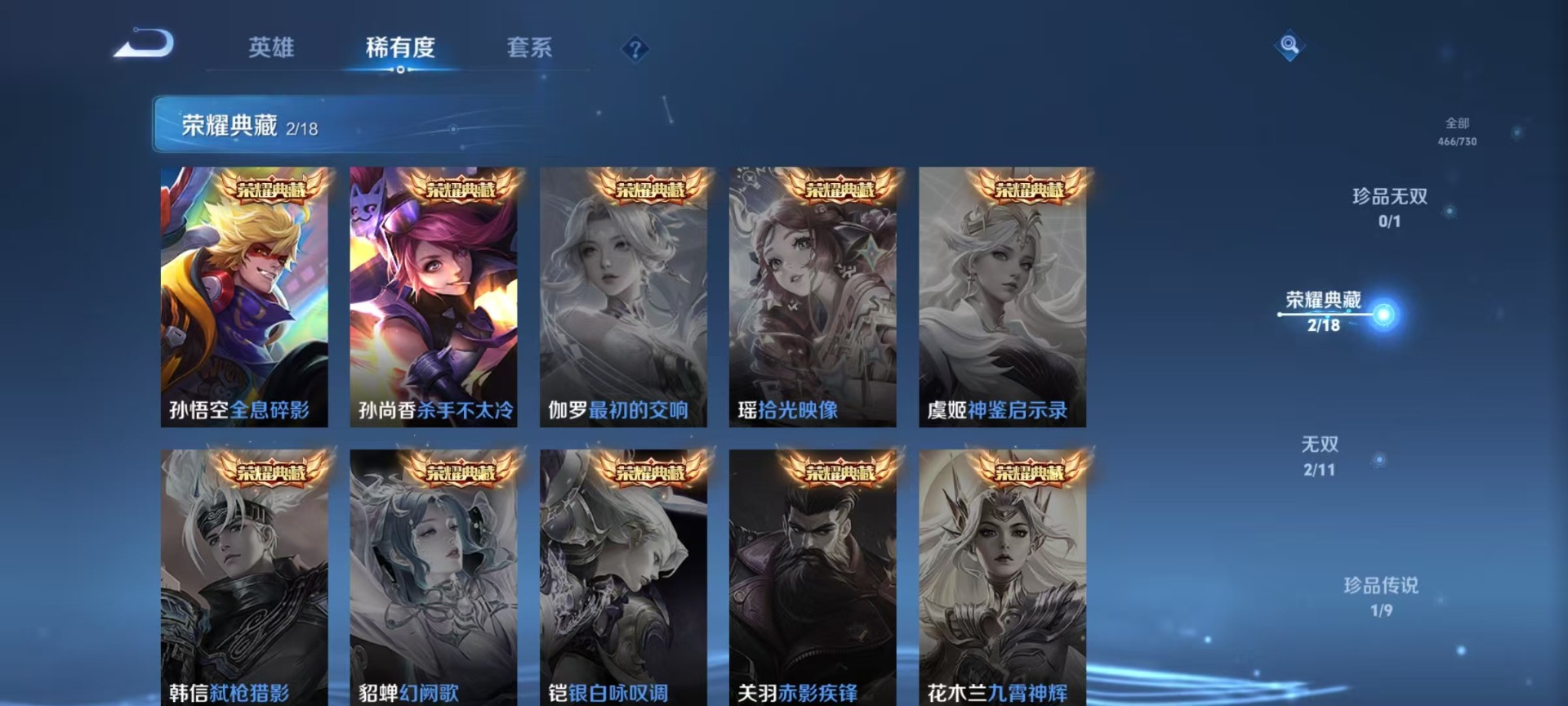 铠绛天战甲,刘备时之恋人,干将莫邪久胜战神,典韦战鼓燎原,干将莫邪画中仙,孙策末日机甲,达摩黄金狮子座,王昭君乞巧织情,鲁班七号时之奇旅,露娜霜月吟,后羿千劫归真,庄周牧神诗旅,镜炽阳神光,公孙离记忆之芯,杨玉环星之鸣奏,裴擒虎祥瑞亨通,貂蝉猫影幻舞,夏洛特浮生妄,艾琳觅芳踪,西施游龙清影,西施续相思,嬴政玄雷天君,张良黄金白羊座,孙悟空零号·赤焰,曜云鹰飞将,马超无双飞将,百里守约碎云,澜逐花归海,云缨幻光神枪