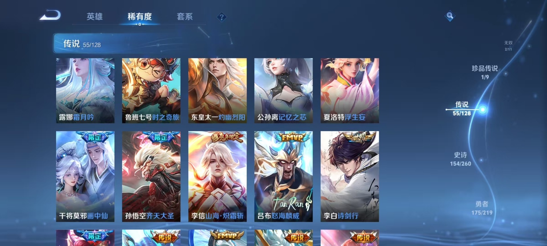 - [11598598]V6 1典藏 2珍品传说 1传说 122英雄 168皮肤 可修改实名 优质装备:拾光映像(瑶典藏),怪盗基德,器灵·落星盏 珍宝阁皮:女武神 限定皮:逐霄战戟,鸣野蒿,高山流水 史诗皮:鸭鸭历险记-刘禅,器灵·浮梦炉,化蝶舞,星界战将,谪仙醉月,龙之律动,茶境仙,撼地雄心,破空之剑,战舞者,蒙犽顽岩魄,百相守梦-百里守约,百相守梦-黄忠,紫霞仙子,黄金分割率,特工魅影,江河有灵,魅语,偶像歌手,猫狗日记-孙策,猫狗日记-大乔,节奏热浪,女仆咖啡,摇滚巨星,水果甜心,绅士熊喵,天才门将,心灵骇客,德古拉伯爵,暗隐猎兽者,幽灵船长,鬼剑武藏,暗渊魔法,心灵战警,乐园奇幻夜,舞动绿茵,诗语江南,缤纷独角兽,乘风破浪,逐浪之夏,水晶猎龙者,圣诞狂欢,圣诞恋歌,鹰眼统帅,黎明之约,赏金猎手