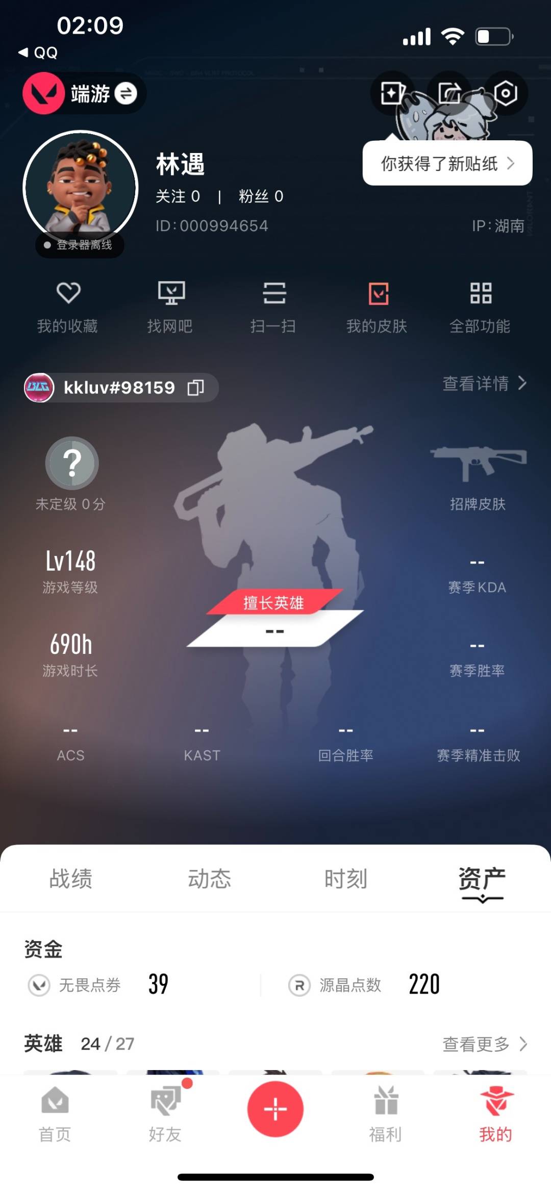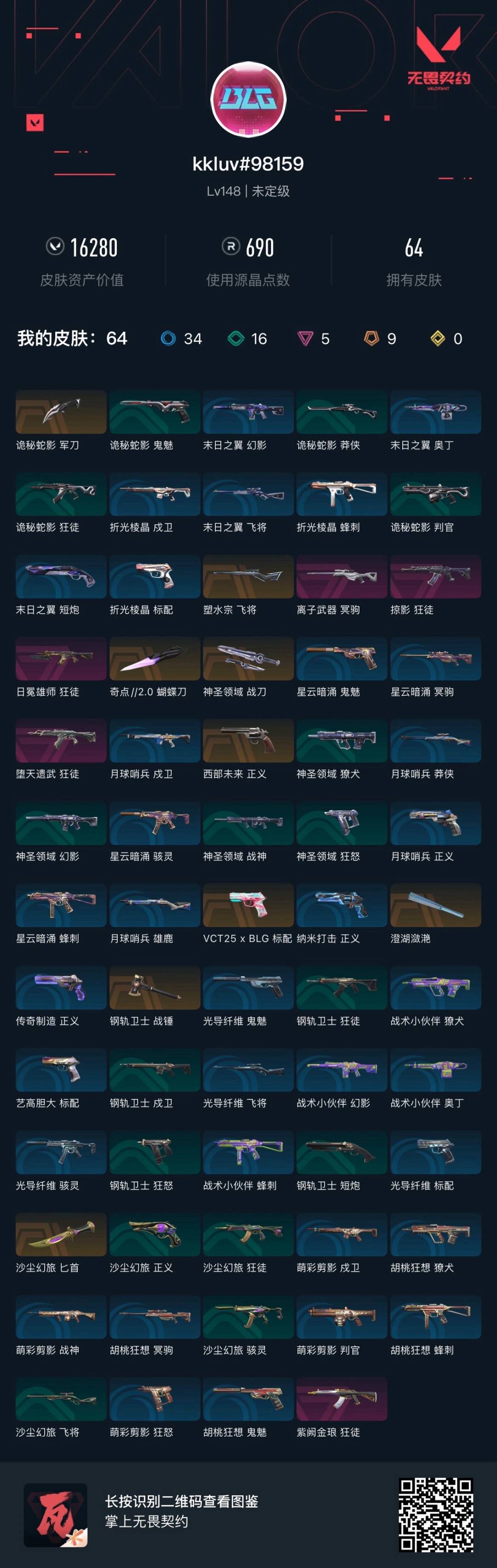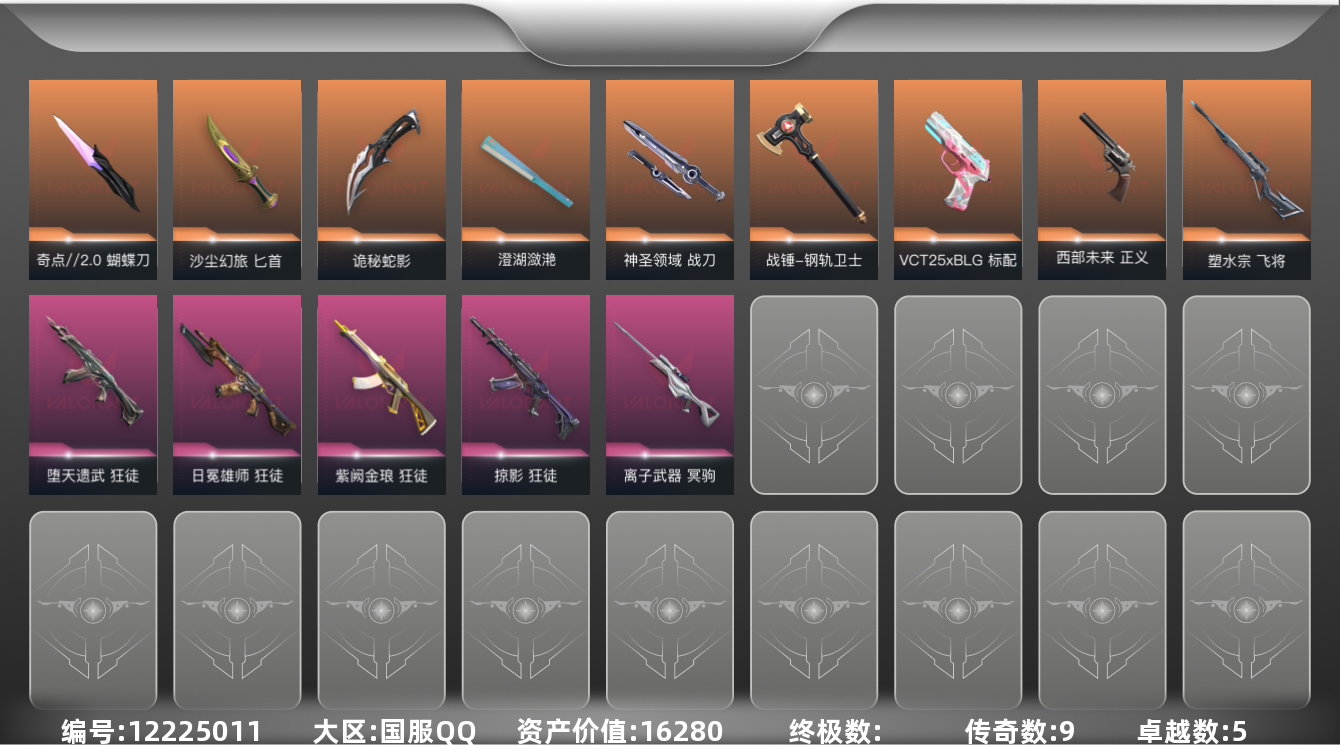 [12225011]9橙皮 5紫皮 64皮肤 24英雄 103卡面 690已用源晶 未定级 优质装备:狂徒-掠影,狂徒-紫阙金琅,冥驹-离子武器,狂徒-日冕雄师,澄湖潋滟,飞将-塑水宗,蝴蝶刀-奇点//2.0,神圣领域 战刀,诡秘蛇影 佩枪皮肤:标配-VCT25xBLG,正义-西部未来 步枪皮肤:狂徒-堕天遗武 近战武器皮肤:战锤-钢轨卫士,匕首-沙尘幻旅