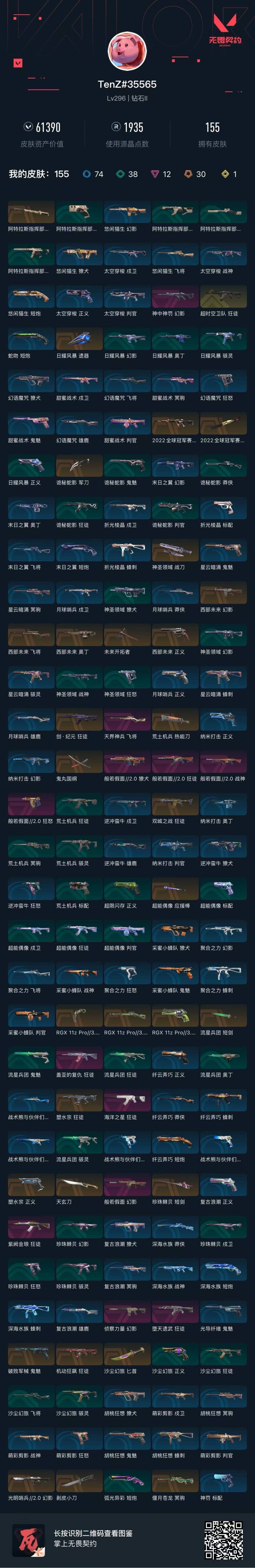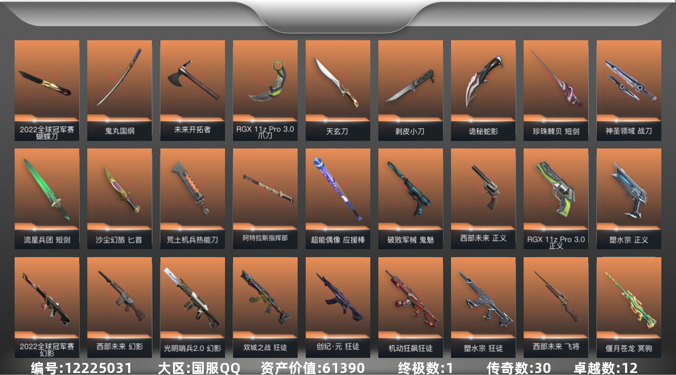 [12225031]30橙皮 1金皮 12紫皮 155皮肤 27英雄 205卡面 1935已用源晶 钻石 优质装备:RGX 11z Pro//3.0套装,冥驹-偃月苍龙,狂徒-塑水宗,狂徒-紫阙金琅,狂徒-盖亚的复仇,幻影-侦察力量,幻影-光明哨兵2.0,狂徒-机动狂飙,正义-塑水宗,幻影-般若假面,正义-RGX 11z Pro 3.0,飞将-天界神兵,天玄刀,剥皮小刀,鬼魅-破败军械,爪刀-RGX 11z Pro 3.0,荒土机兵热能刀,鬼丸国纲,神圣领域 战刀,未来开拓者,诡秘蛇影,阿特拉斯指挥部 亮点皮肤:幻影-2022全球冠军赛,2022全球冠军赛 蝴蝶刀 套装:般若假面//2.0套装,2022全球冠军赛,西部未来 佩枪皮肤:狂怒-般若假面//2.0,正义-西部未来 步枪皮肤:狂徒-般若假面//2.0,幻影-西部未来,狂徒-创·纪元,獠犬-般若假面//2.0,狂徒-双城之战,幻影-神中神罚,狂徒-超时空卫队,狂徒-海洋之星,狂徒-堕天遗武 狙击枪皮肤:飞将-西部未来,莽侠-RGX 11z Pro 3.0 机枪皮肤:奥丁-西部未来,战神-般若假面//2.0 近战武器皮肤:短剑-流星兵团,短剑-珍珠棘贝,匕首-沙尘幻旅,超能偶像 应援棒