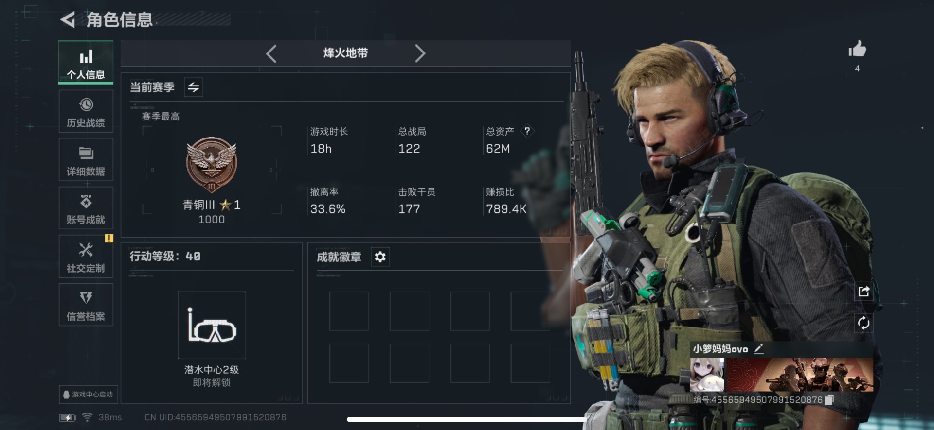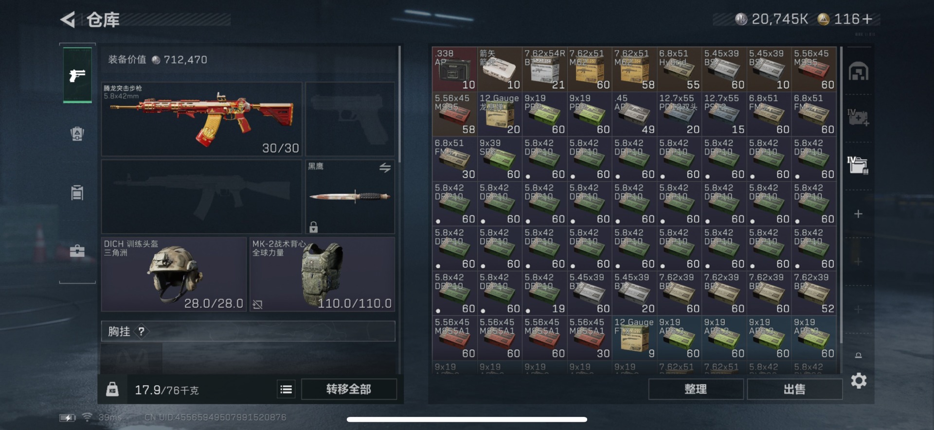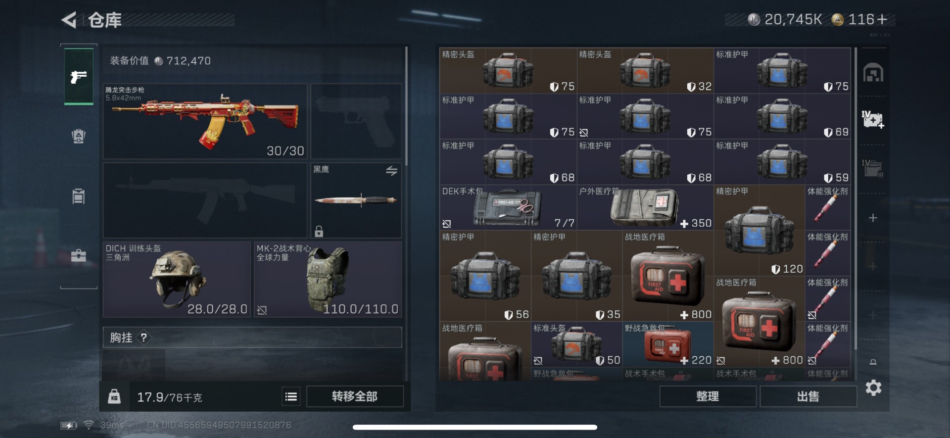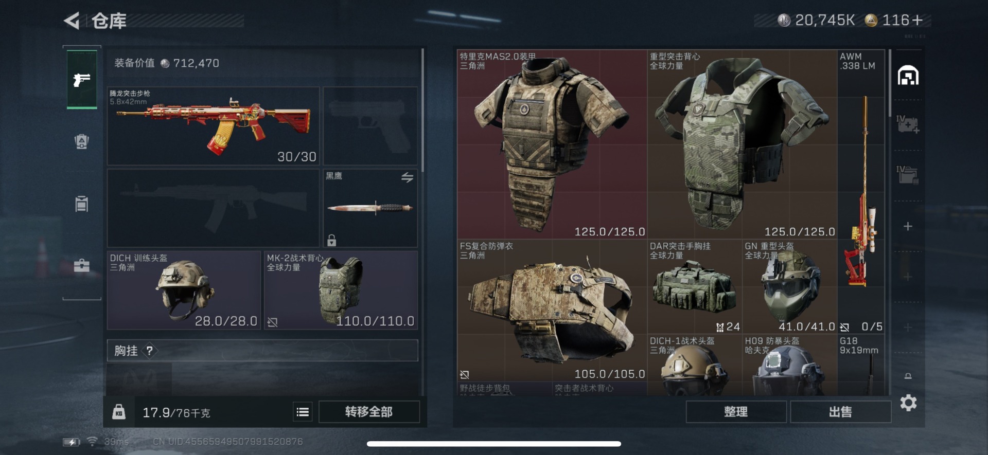 [12225302]总资产:62M 3传说枪械 哈夫币:20.745K 可二次 可修改实名 烽火地带段位:青铜 全面战场段位:无段位 传说武器皮肤:SCAR-H战斗步枪-启航,勇士冲锋枪-能天使-午夜邮差,93R-捞点薯条 史诗武器皮肤:SV-98狙击步枪-林中猎手,P90冲锋枪-紧急戒备