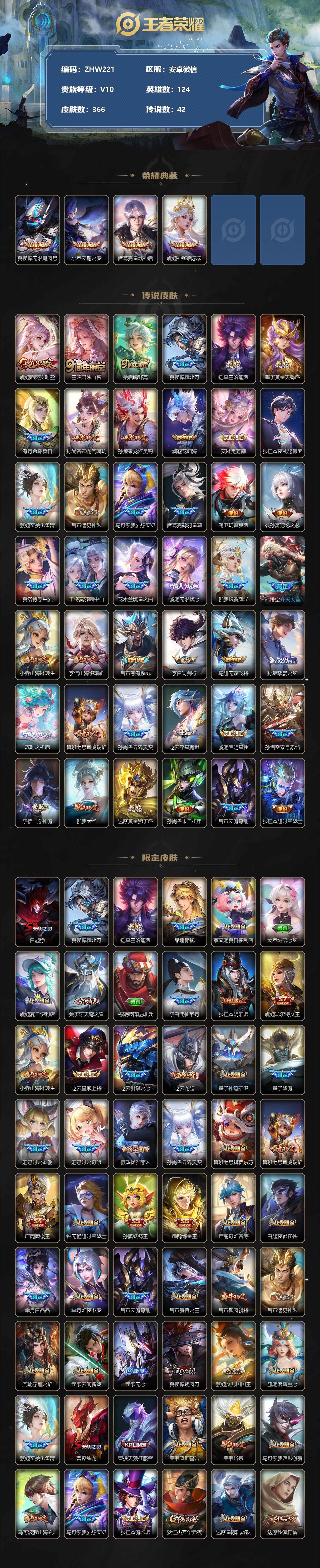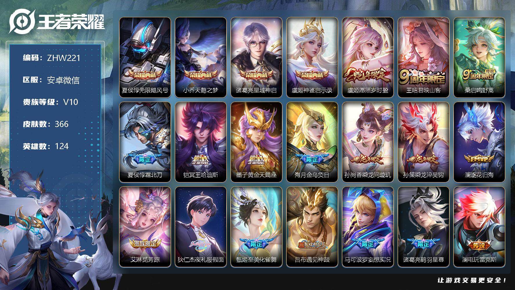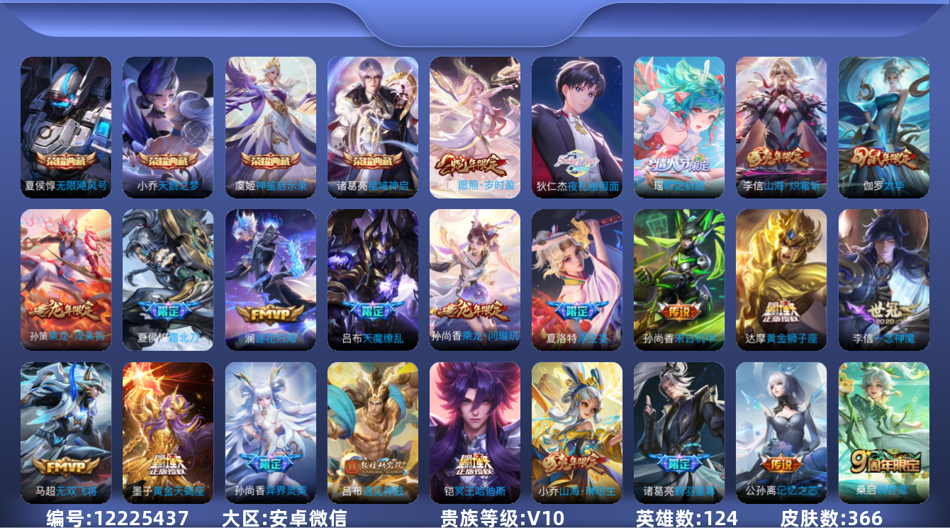 [12225437]【商品标题】:安卓WX-V10-至尊星耀III段位-124英雄-366皮肤-4典藏-0珍品无双-0无双-0珍品传说-42传说-125史诗