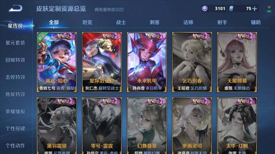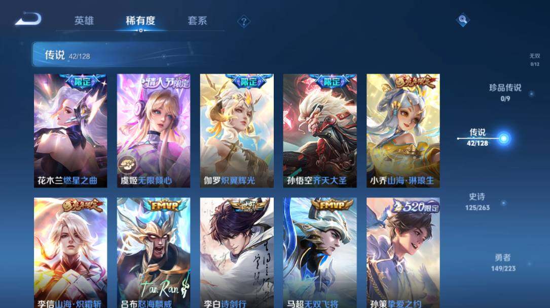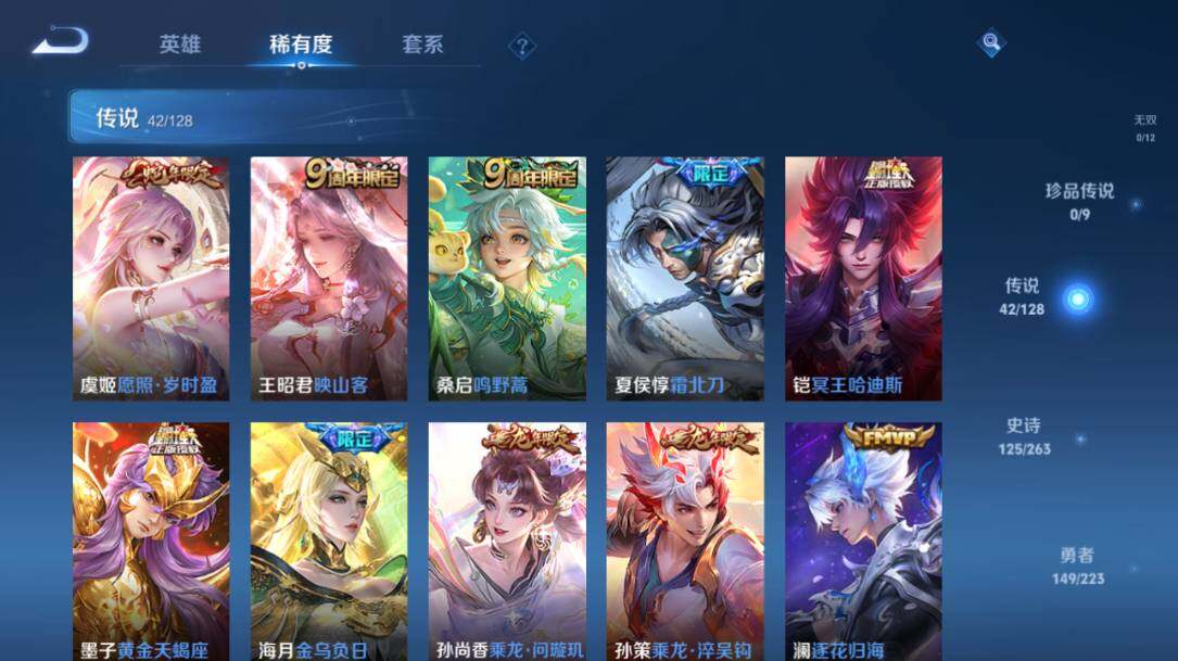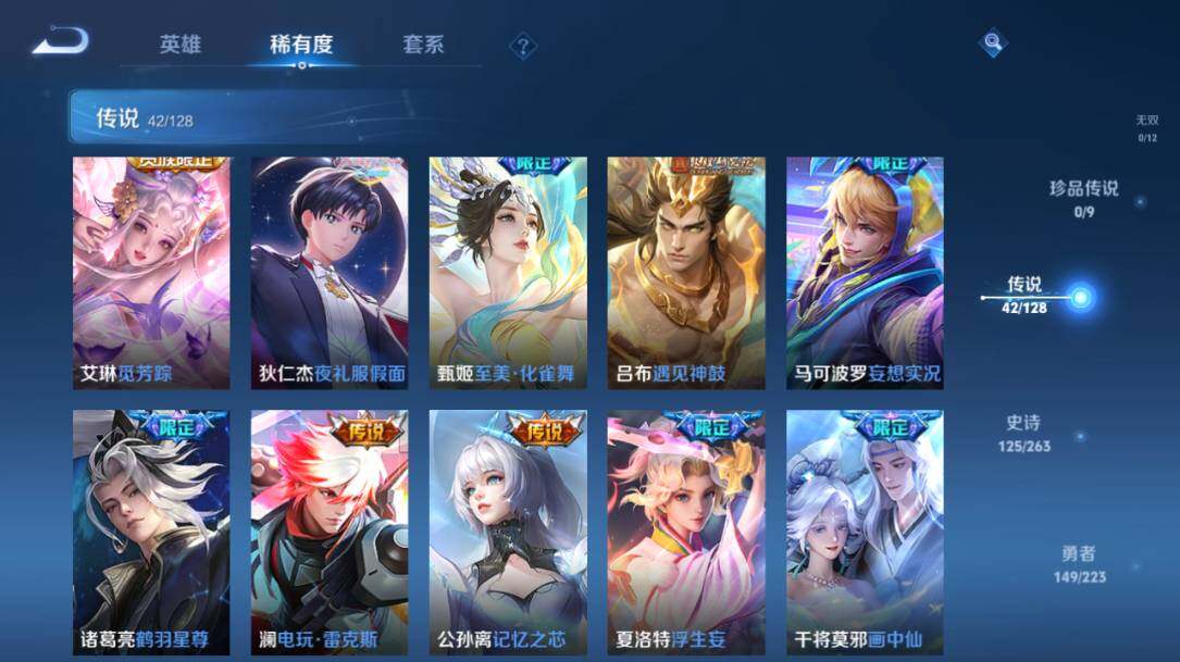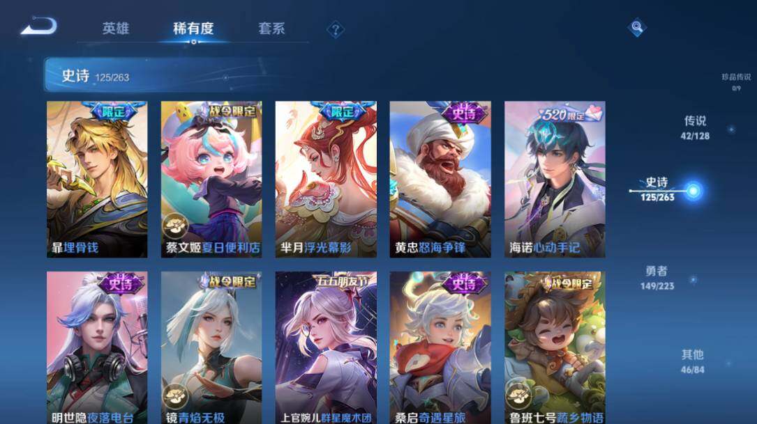 【传说皮肤】:虞姬愿照岁时盈,王昭君映山客,桑启鸣野蒿,夏侯惇霜北刀,铠冥王哈迪斯,墨子黄金天蝎座,海月金乌负日,孙尚香乘龙问璇玑,孙策乘龙淬吴钩,澜逐花归海,艾琳觅芳踪,狄仁杰夜礼服假面,甄姬至美化雀舞,吕布遇见神鼓,马可波罗妄想实况,诸葛亮鹤羽星尊,澜电玩雷克斯,公孙离记忆之芯,夏洛特浮生妄,干将莫邪画中仙,花木兰燃星之曲,虞姬无限倾心,伽罗炽翼辉光,孙悟空齐天大圣,小乔山海琳琅生,李信山海炽霜斩,吕布怒海麟威,李白诗剑行,马超无双飞将,孙策挚爱之约,瑶时之祈愿,鲁班七号寅虎瑞焰,孙尚香异界灵契,赵云淬星耀世,虞姬启明星使,孙悟空零号赤焰,李信一念神魔,伽罗太华,达摩黄金狮子座,孙尚香末日机甲,吕布天魔缭乱,狄仁杰超时空战士