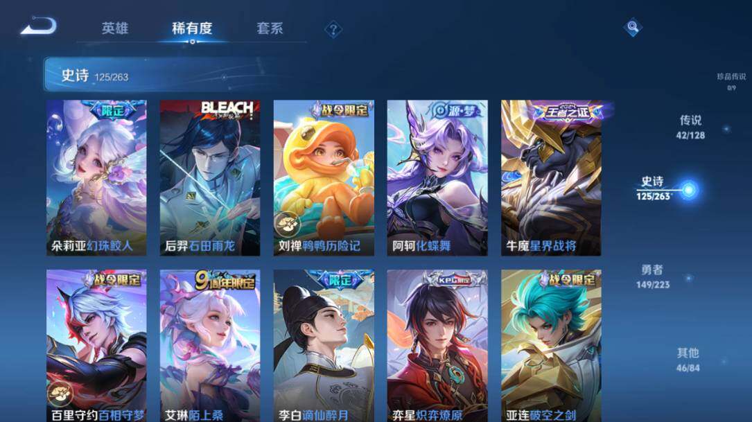 - PX_2096187-62 苹果QQ/至尊星耀/274皮肤/124英雄/1典藏/0珍品无双/0无双/0珍品传说/8传说/78史诗/8稀有英雄 【1 典藏皮肤】神鉴启示录 虞姬, 【8 传说皮肤】炽阳神光 镜,乘龙·问璇玑 孙尚香,时之恋人 刘备,久胜战神 干将莫邪,琥珀纪元 铠,超时空战士 狄仁杰,曦玄引 貂蝉,鸣野蒿 桑启, 【78 史诗皮肤】霸王别姬 项羽,电玩小子 鲁班七号,末日机甲 吕布,