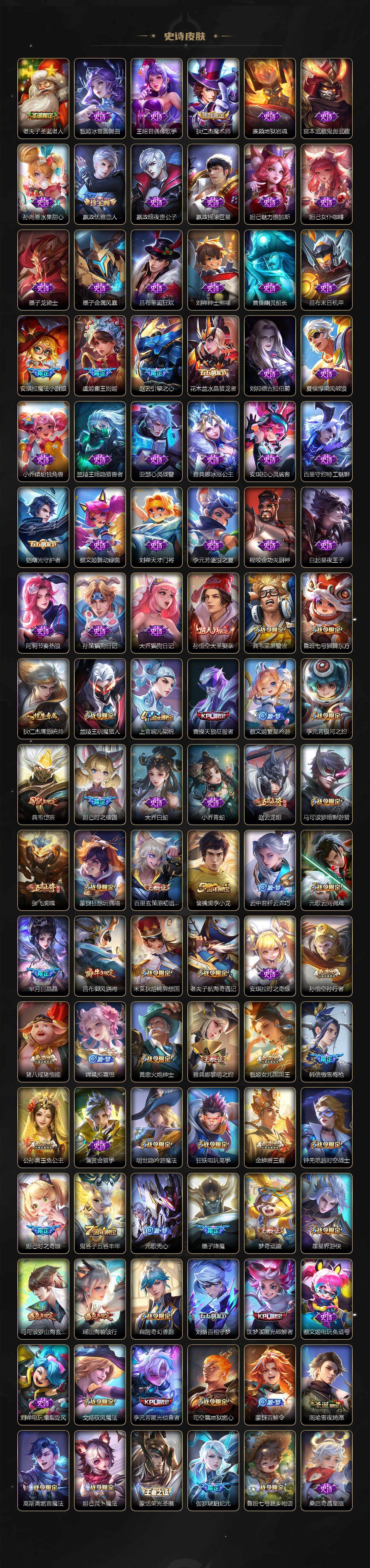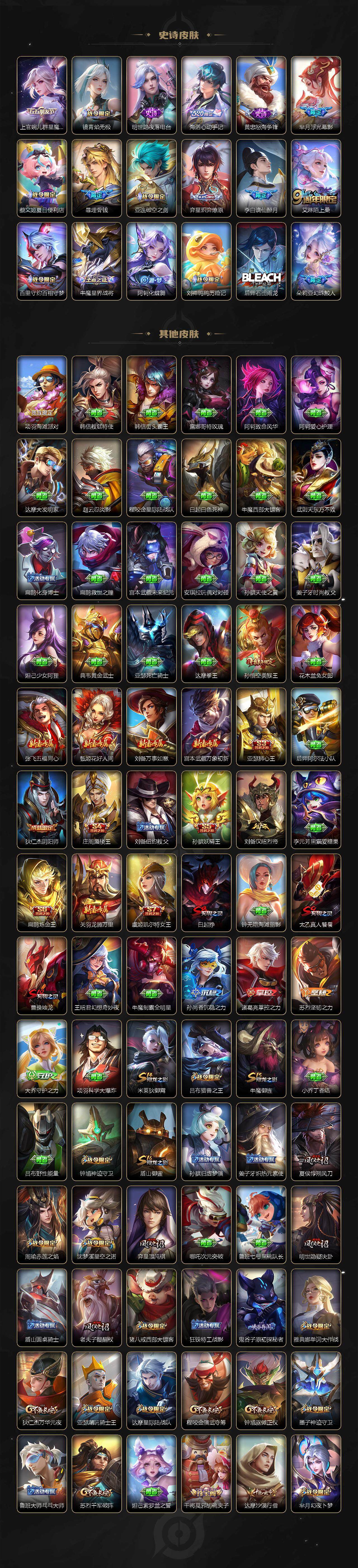 亚瑟狮心王,庄周蜃楼王,孙膑妖精王,扁鹊炼金王,虞姬凯尔特女王,白起狰,太乙真人饕餮,曹操烛龙,米莱狄御霄,牛魔御旌,盾山御銮,夏侯惇朔风刀,明世隐疑决卦,老夫子醍醐杖,鬼谷子原初探秘者,狄仁杰万华元夜,程咬金演武夺筹,钟馗驱傩正仪,苏烈千军破阵,吕布猎兽之王,典韦蓝屏警告,钟馗神迹守卫,鲁班七号狮舞东方,沈梦溪星空之诺,李元芳银河之约,马可波罗暗影游猎,蒙犽狂想玩偶喵,元歌云间偶戏,弈星混沌棋,达摩沙漠行僧,兰陵王金庭之子,沈梦溪大漠名商,李元芳云中旅人,桑启海盐诗旅,裴擒虎擒涛扼浪,鲁班大师探海日志,张良古海寻踪,项羽苍威无极,镜青焰无极
