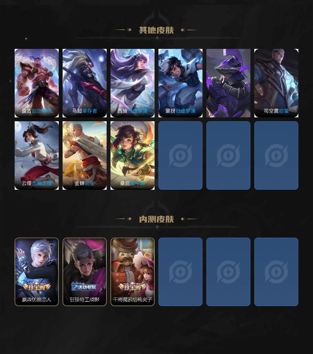 【限定皮肤】:白起狰,夏侯惇霜北刀,铠冥王哈迪斯,暃埋骨钱,蔡文姬夏日便利店,大乔绒语心约,虞姬夏日便利店,姜子牙天穹之誓,杨戬破阵退雄兵,李白谪仙醉月,狄仁杰阴阳师,虞姬凯尔特女王,小乔山海琳琅生,赵云皇家上将,赵云引擎之心,赵云龙胆,墨子神迹守卫,墨子降魔,妲己时之彼端,妲己时之奇旅,嬴政优雅恋人,孙尚香异界灵契,鲁班七号狮舞东方,鲁班七号寅虎瑞焰,庄周蜃楼王,钟无艳超时空战士,孙膑妖精王,扁鹊炼金王,扁鹊奇幻香踪,白起夜都怪侠,芈月白晶晶,芈月幻夜卜梦,吕布天魔缭乱,吕布猎兽之王,吕布御风骁将,吕布遇见神鼓,周瑜赤莲之焰,元歌云间偶戏,元歌无心,夏侯惇朔风刀,甄姬女儿国国王,甄姬落雪兰心,甄姬至美化雀舞,曹操烛龙,曹操天狼征服者,典韦蓝屏警告,典韦岱宗,马可波罗暗影游猎,马可波罗山海玄木吟,马可波罗妄想实况,狄仁杰魔术师,狄仁杰万华元夜,达摩星际陆战队,达摩沙漠行僧,项羽海滩派对,老夫子圣诞老人,老夫子醍醐杖,老夫子航海奇遇记,安琪拉魔法小厨娘,程咬金演武夺筹,韩信傲雪梅枪,王昭君午后时光,兰陵王驯魔猎人,兰陵王金庭之子,花木兰燃星之曲,亚瑟狮心王,亚瑟潮玩骑士王,孙悟空美猴王,孙悟空大圣娶亲,孙悟空零号赤焰,孙悟空孙行者,孙悟空齐天大圣,牛魔御旌,刘备百相守梦,张飞虎魄,李元芳银河之约,李元芳匿光侦查者,李元芳云中旅人