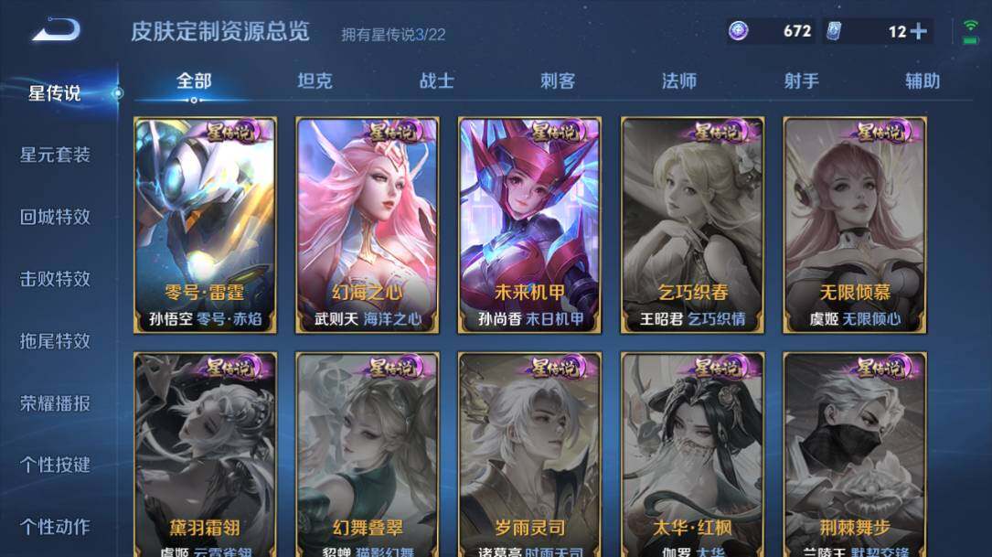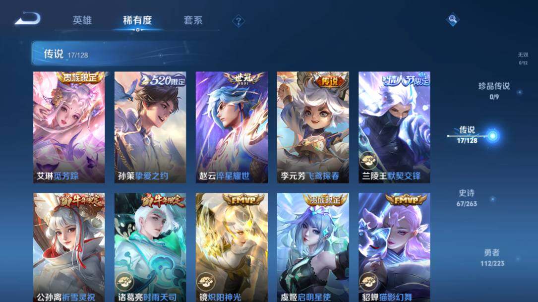 【传说皮肤】:艾琳觅芳踪,孙策挚爱之约,赵云淬星耀世,李元芳飞鸢探春,兰陵王默契交锋,公孙离祈雪灵祝,诸葛亮时雨天司,镜炽阳神光,虞姬启明星使,貂蝉猫影幻舞,杨戬永曜之星,诸葛亮武陵仙君,李白凤求凰,孙尚香末日机甲,吕布天魔缭乱,武则天海洋之心,狄仁杰超时空战士