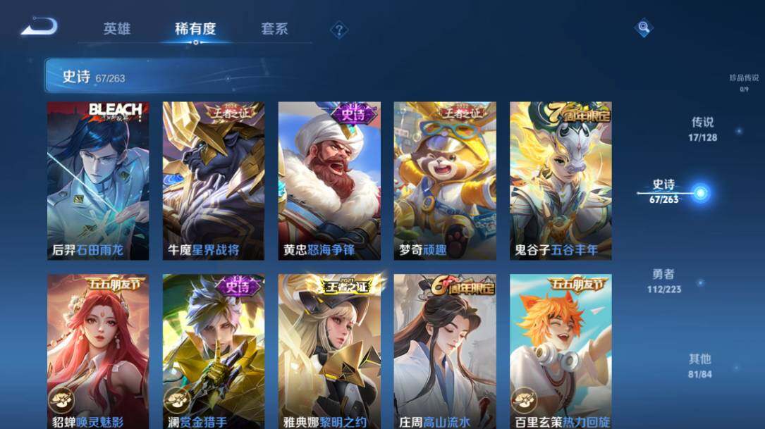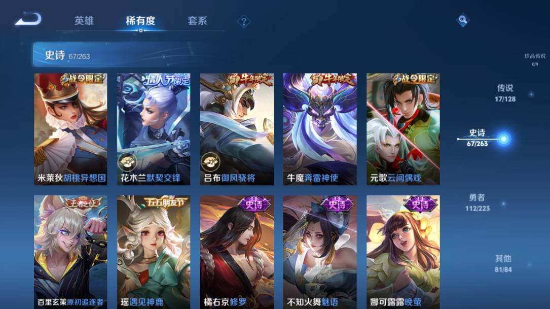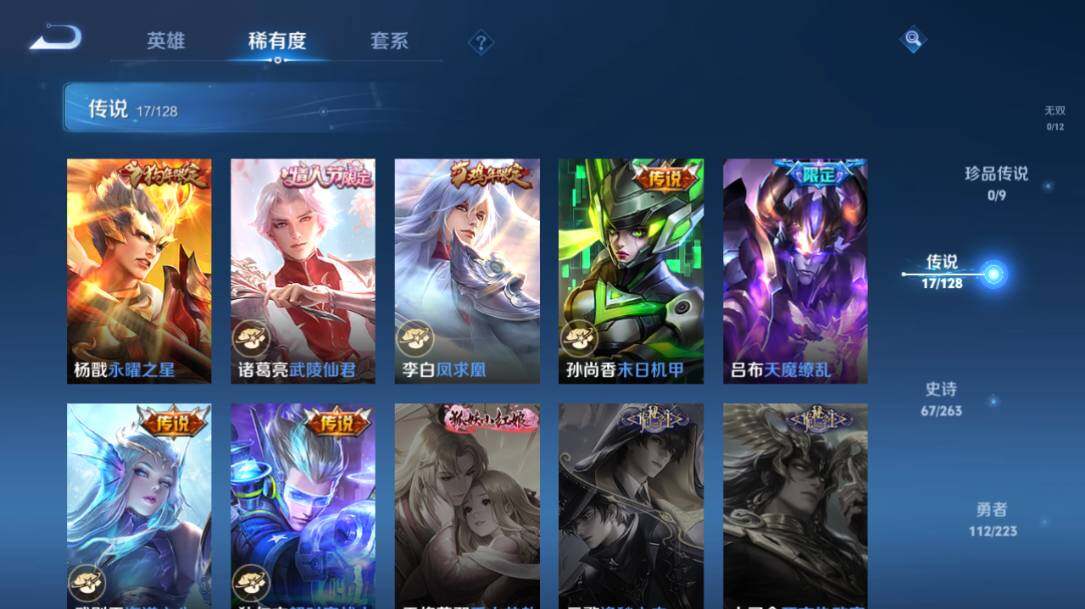 - PX_2097131-23 安卓QQ/永恒钻石/169皮肤/124英雄/0典藏/0珍品无双/0无双/2珍品传说/4传说/44史诗/8稀有英雄 【2 珍品传说】酷洛米之心 安琪拉,大耳狗之梦 瑶, 【4 传说皮肤】胖达荣荣 梦奇,武陵仙君 诸葛亮,挚爱之约 孙策,末日机甲 孙尚香, 【44 史诗皮肤】逐梦之星 马可波罗,苍穹之光 项羽,狮舞东方 鲁班七号,妄想食味 姬小满,德古拉伯爵 刘邦,心灵战警