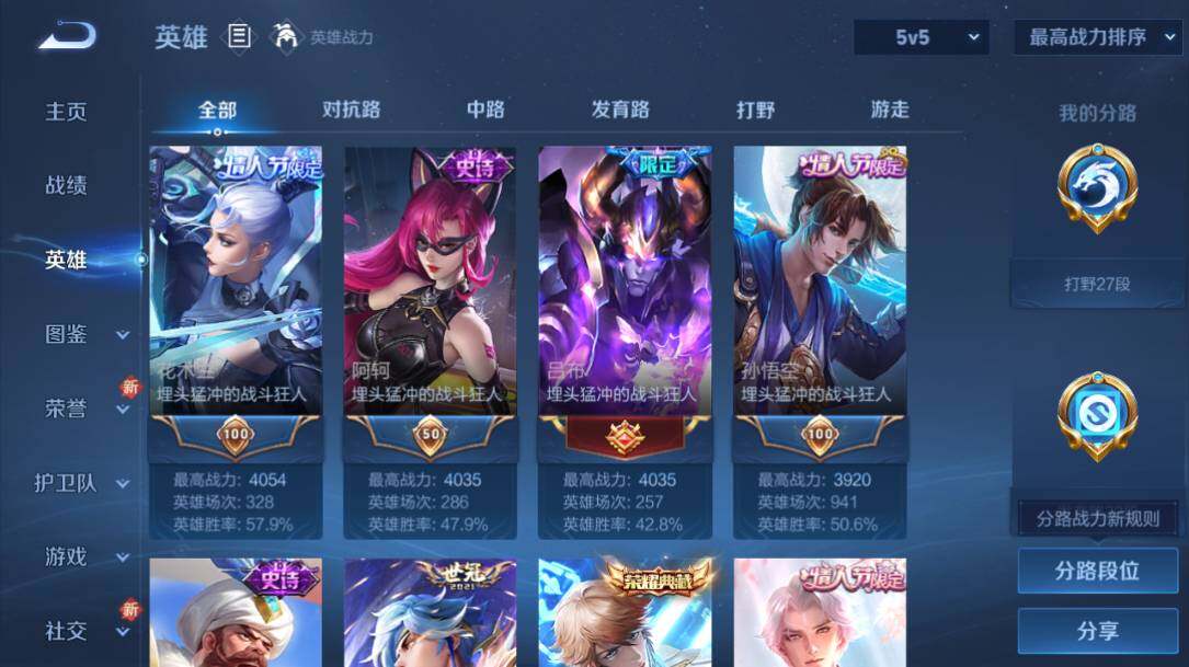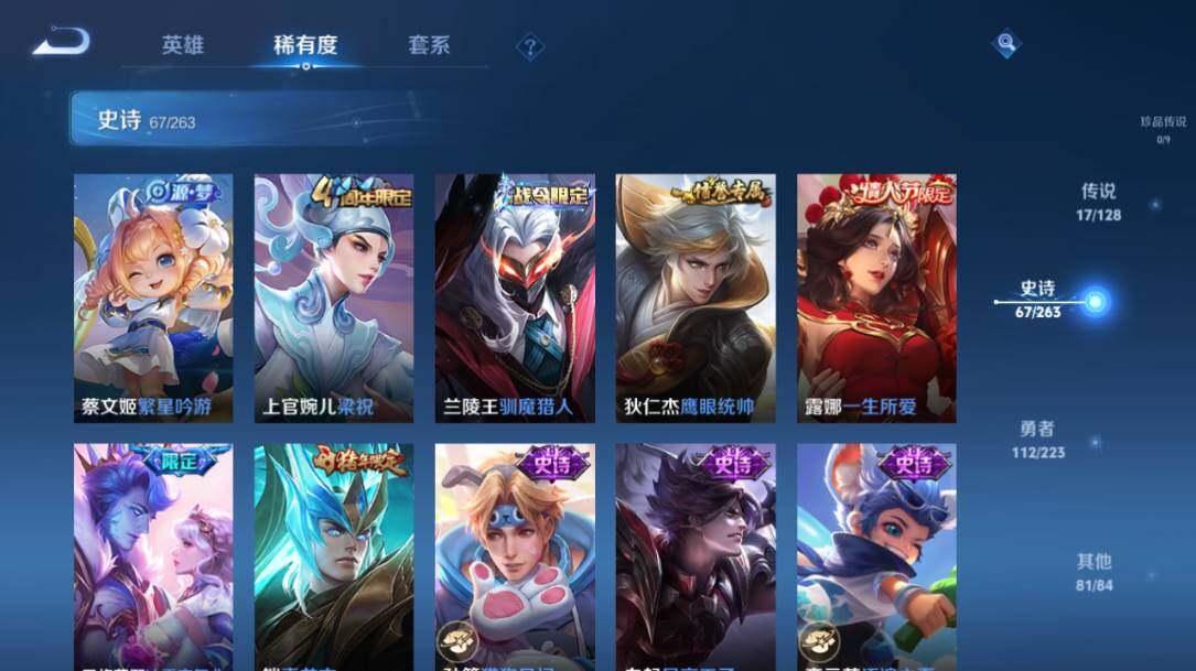 【赛季限定】:孙膑妖精王,扁鹊炼金王,白起狰,芈月重明,夏侯惇朔风刀,曹操烛龙,典韦穷奇,狄仁杰万华元夜,达摩沙漠行僧,老夫子醍醐杖,程咬金演武夺筹,兰陵王金庭之子,牛魔御旌,李元芳云中旅人,虞姬凯尔特女王,钟馗驱傩正仪,雅典娜黎明之约,太乙真人饕餮,鬼谷子原初探秘者,苏烈千军破阵,百里玄策