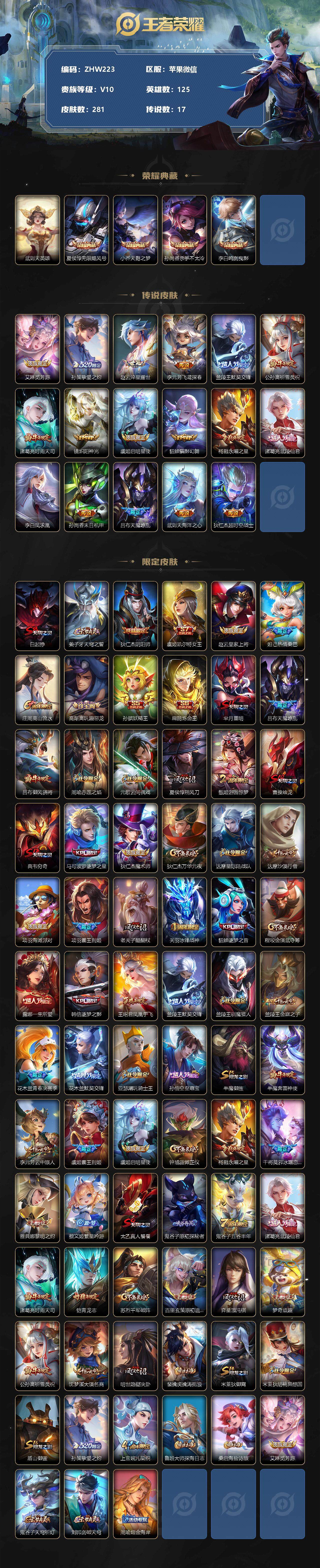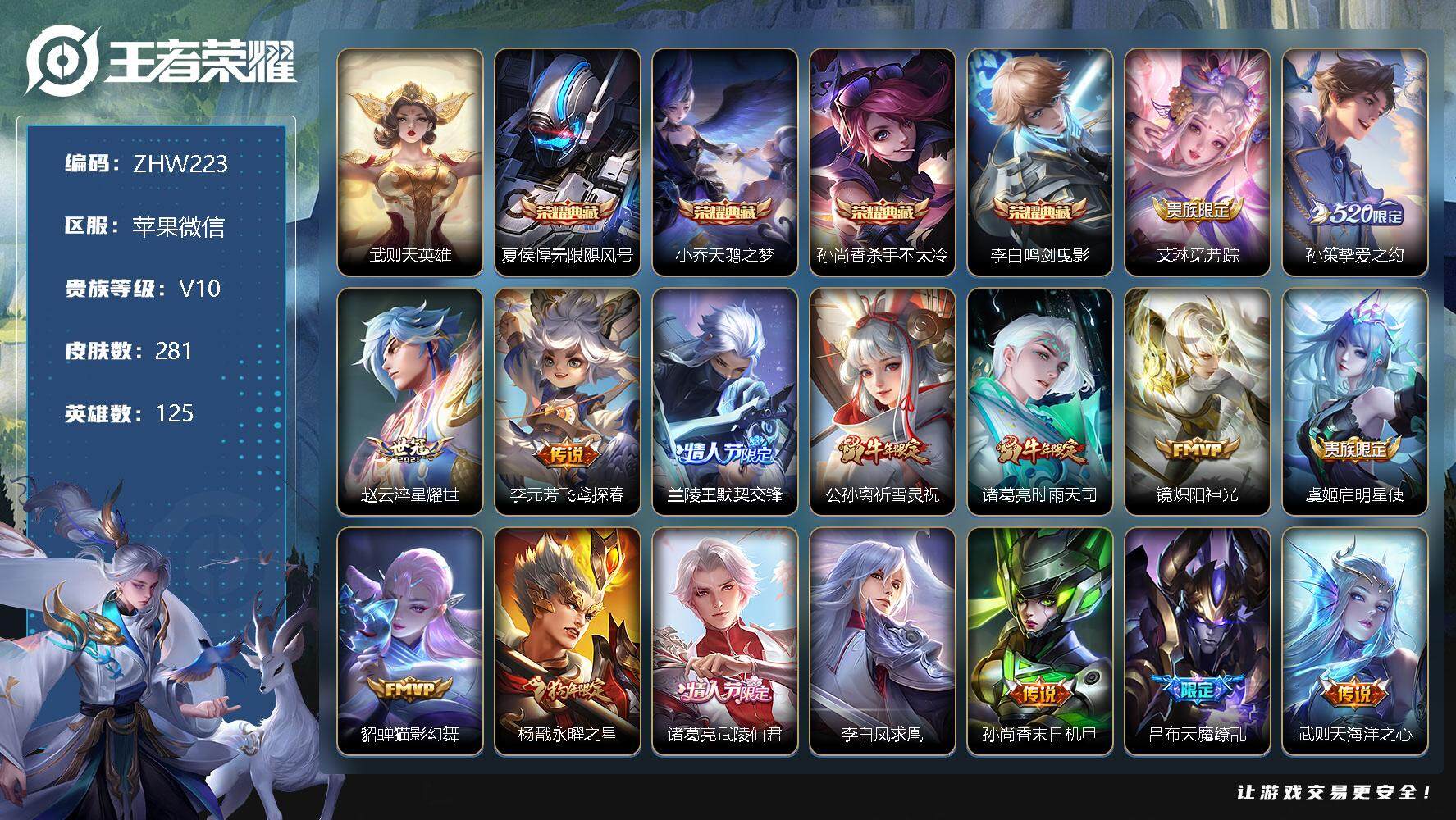 [12225436]【商品标题】:苹果WX-V10-最强王者段位-125英雄-281皮肤-4典藏-0珍品无双-0无双-0珍品传说-17传说-67史诗