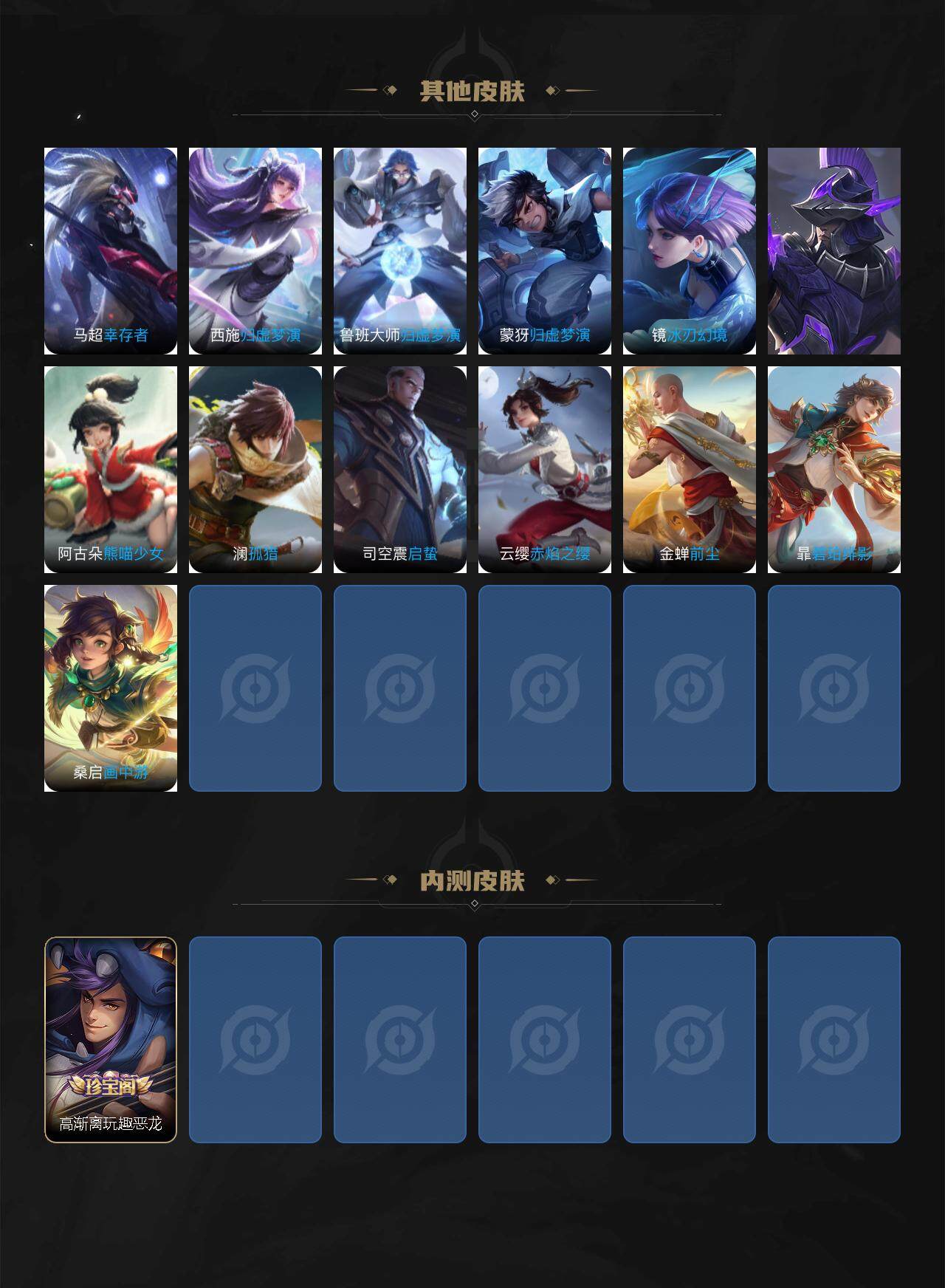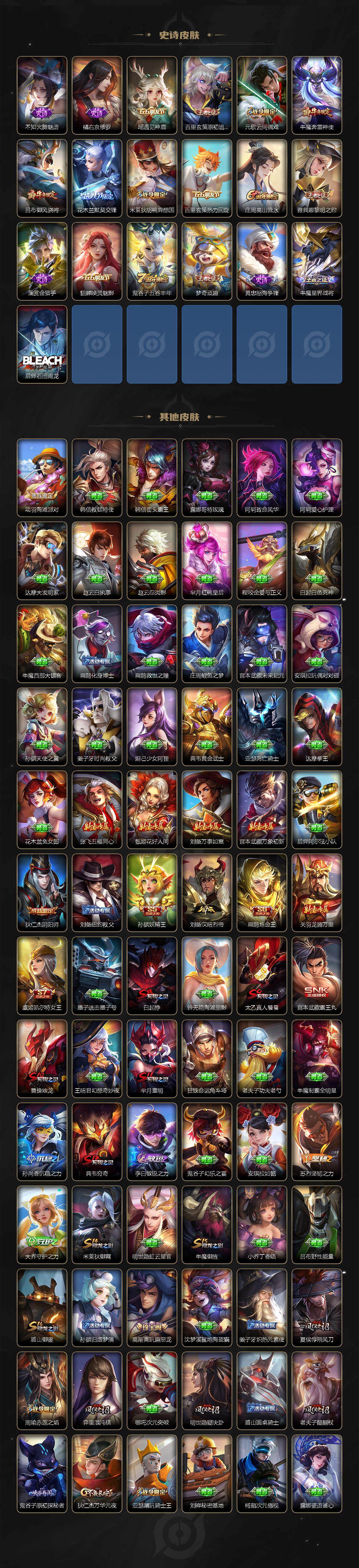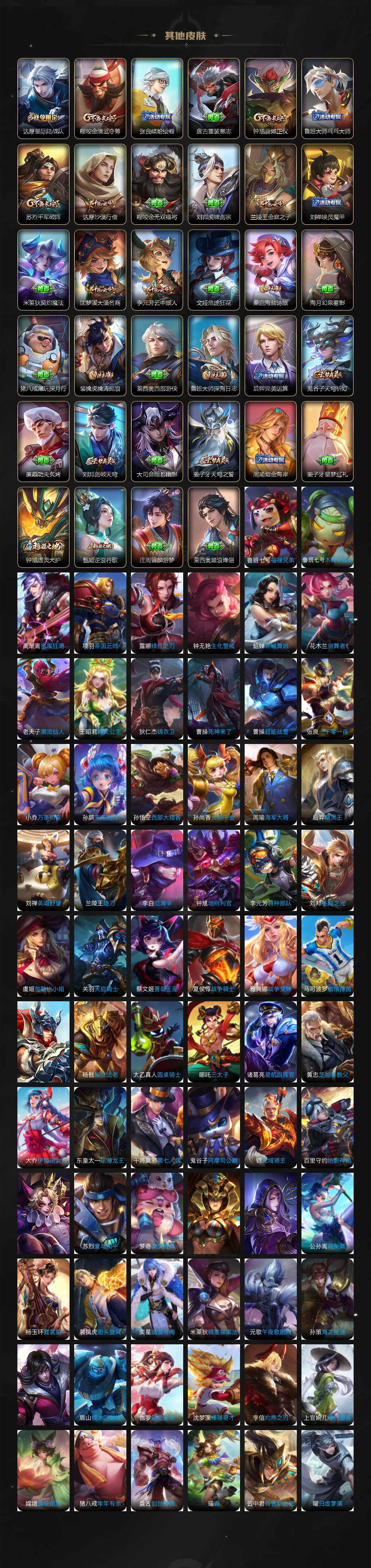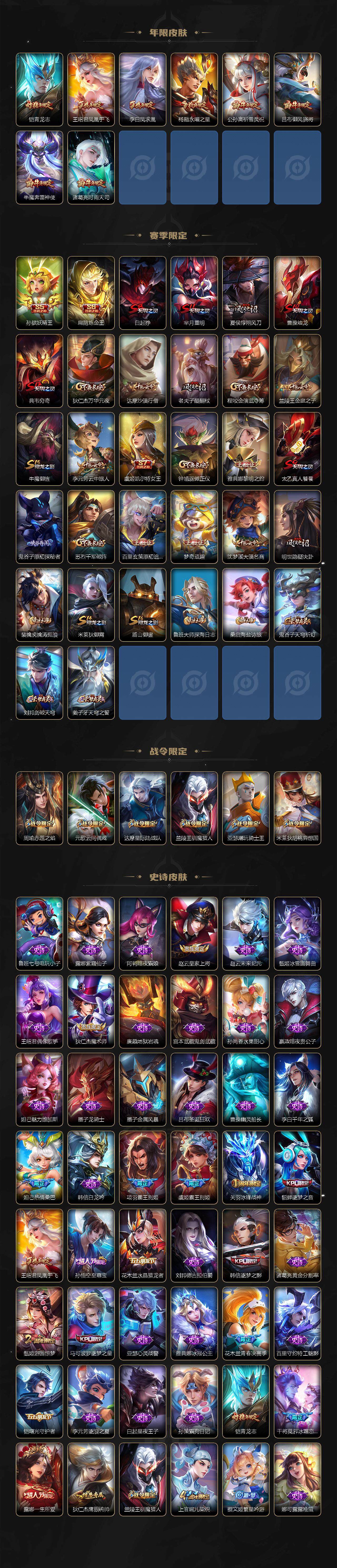 【限定皮肤】:白起狰,姜子牙天穹之誓,狄仁杰阴阳师,虞姬凯尔特女王,赵云皇家上将,妲己热情桑巴,庄周高山流水,高渐离玩趣恶龙,孙膑妖精王,扁鹊炼金王,芈月重明,吕布天魔缭乱,吕布御风骁将,周瑜赤莲之焰,元歌云间偶戏,夏侯惇朔风刀,甄姬游园惊梦,曹操烛龙,典韦穷奇,马可波罗逐梦之星,狄仁杰魔术师,狄仁杰万华元夜,达摩星际陆战队,达摩沙漠行僧,项羽海滩派对,项羽霸王别姬,老夫子醍醐杖,关羽冰锋战神,貂蝉逐梦之音,程咬金演武夺筹,露娜一生所爱,韩信逐梦之影,王昭君凤凰于飞,兰陵王默契交锋,兰陵王驯魔猎人,兰陵王金庭之子,花木兰青春决赛季,花木兰默契交锋,亚瑟潮玩骑士王,孙悟空至尊宝,牛魔御旌,牛魔奔雷神使,李元芳云中旅人,虞姬霸王别姬,虞姬启明星使,钟馗驱傩正仪,杨戬永曜之星,干将莫邪冰霜恋舞曲,雅典娜黎明之约,蔡文姬繁星吟游,太乙真人饕餮,鬼谷子原初探秘者,鬼谷子五谷丰年,诸葛亮武陵仙君,诸葛亮时雨天司,铠青龙志,苏烈千军破阵,百里玄策原初追逐者,弈星混沌棋,梦奇顽趣,公孙离祈雪灵祝,沈梦溪大漠名商,明世隐疑决卦,裴擒虎擒涛扼浪,米莱狄御霄,米莱狄胡桃异想国,盾山御銮,孙策挚爱之约,上官婉儿梁祝,鲁班大师探海日志,桑启海盐诗旅,艾琳觅芳踪,鬼谷子天穹祈灯,刘邦剑破天穹,周瑜熔金海岸