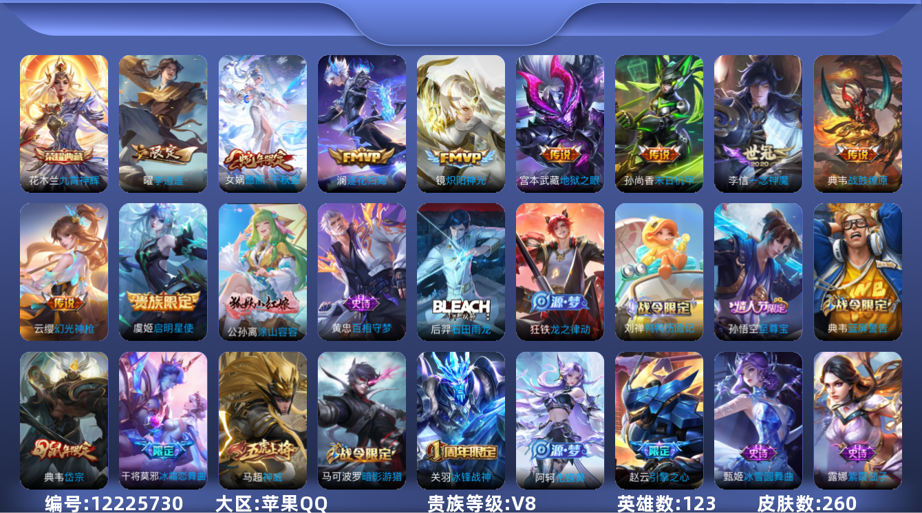 [12225730]V8 1典藏 10传说 123英雄 260皮肤 可修改实名 优质装备:九霄神辉(木兰典藏),炽阳神光,一念神魔,末日机甲-孙尚香(绿蚂蚱),地狱之眼,李逍遥,澜逐花归海,涂山容容 传说皮:典韦战鼓燎原,幻光神枪 珍宝阁皮:万物之道,优雅恋人 限定皮:愿照·千秋盛(女娲年限),至尊宝,神威(电光马子),五谷丰年,冰锋战神,游园惊梦,梁祝,岱宗(典韦年限),李小龙,引擎之心,冰霜恋舞曲 史诗皮:鸭鸭历险记-刘禅,化蝶舞,龙之律动,石田雨龙,蔬乡物语(鲁班七号),百相守梦-黄忠,紫霞仙子,白龙吟,特工魅影,千年之狐,永昼,江河有灵,无限星赏官,冰冠公主,偶像歌手,暗夜猫娘,末日机甲-吕布,猫狗日记-孙策,乱世虎臣,女仆咖啡,摇滚巨星,水果甜心,绅士熊喵,天才门将,星夜王子,德古拉伯爵,暗隐猎兽者,幽灵船长,鬼剑武藏,心灵战警,纤云弄巧,拒霜思,缤纷独角兽,乘风破浪,逐浪之夏,水晶猎龙者,箭羽风息,金属风暴,圣诞狂欢,圣诞恋歌,鹰眼统帅,魅力维加斯,未来纪元-赵云