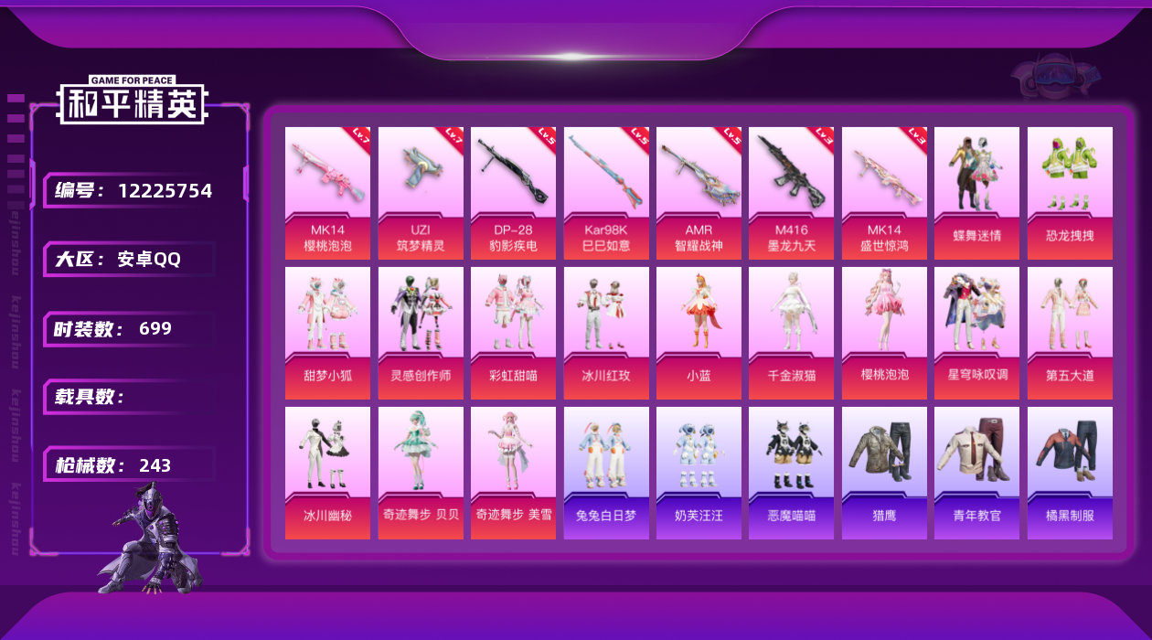 [12225754]14粉装 7特效枪 14印记 可二次 可修改实名 优质装备:蝶舞迷情,UZI筑梦精灵,七级UZI-筑梦精灵,M416墨龙九天,千金淑猫,MK14-盛世惊鸿,樱桃泡泡,MK14-樱桃泡泡,七级MK14-樱桃泡泡,AMR-智耀战神,星穹咏叹调,奇迹舞步-贝贝,奇迹舞步-美雪,Kar98K-巳巳如意 热门装扮:恐龙拽拽,甜梦小狐,灵感创作师,彩虹甜喵,冰川红玫,冰川幽秘,第五大道,小蓝,兔兔白日梦,奶芙汪汪,恶魔喵喵 稀有枪皮:DP-28-豹影疾电 五级特效枪:五级Kar98K-巳巳如意,五级DP-28-豹影疾电,五级AMR-智耀战神 三级特效枪:三级M416-墨龙九天,三级MK14-盛世惊鸿 紫色装扮:田园牧歌,轻风白浪,和煦暖阳,SS22特训,白啸长虹,SS23特训,幻彩翩翩,妙红点点,龙舌兰冰茶,白兰地假日,娇憨猪猪,梦幻奶油,萌趣咩咩,SS21特训,极光玫瑰,SS31特训套装,人气偶像,冰川特警,冷焰舞者,霓虹热舞,旭日情侣,SS30特训套装,云朵鹅,雪绒豹,SS33特训套装,青涩时光,顶瓜瓜,SS20特训,SS16特训,猎梦纪元,飞驰魅影,音速流光,SS19特训,军刀雅典娜,豚鼠丹丹,吉莉礼服,甜心亚梦,虚音幻奏,电音精灵,SS17特训,SS18特训,水晶王族,智慧隐士,都市魅力,酒红色名流,酷潮明星,长空猛禽,霓虹街区,青年教官,缤纷果语,耀眼新星,荣耀,荧惑魅影,蓝彩潮人,蓝色运动,虎虎生威吉莉,街头潮人,蓝海鲸歌,飞行日记,魅力单车,鹤鸣,麻辣教官,黄色伏地魔,黄色名流,黄色运动,黑色伏地魔,龟仙人,冰河战士,龙魂突击队,蝶变,香桃花海,极速红龙,柠萌假日,橘黑制服,海岛探路者,涂山之恋,深蓝色名流,滨海假日,幻影武者,完美偶像,帅气教官,幻世战舞者,怒火燎原,战地督导,探宝勇士,湖蓝色名流,滨海厨神,绮丽涂鸦,疯狂小兔子,白熊同盟,白色伏地魔,破晓战魂,破蛋小黄鸡,福星高照,空岛之星,竞技达人朋克,红色运动,王牌教练,牛气冲天,灼焰舞者,炫蓝之夏,热血青春,牛气满满,猛禽,猎鹰,小熊娃娃,雏菊兔兔,萝兰蝴蝶,SS29特训,星途旅人,创世·幻影,白光莹,纯真浪花,热情海星,曼妙人鱼,SS28特训,卖崽青蛙,迎夏光舞,红潮炫舞,异域银装,鱼渊荷华,玉兔迎春,燕燕于飞,巳巳如意,青团波波,糖糖葫芦,棉花软糖,竞技名士,街头风暴,许七安,裁决天象,深海梦境,惊