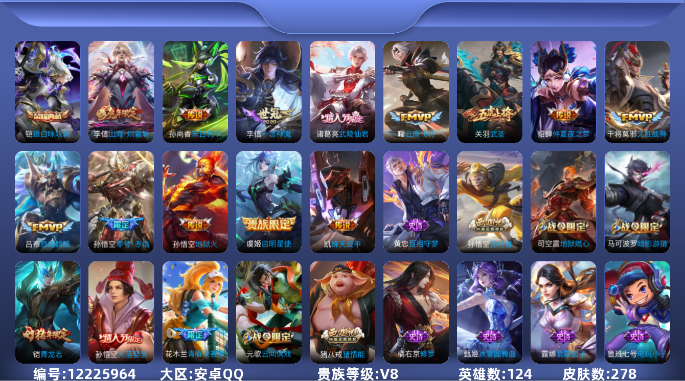 [12225964]V8 1典藏 13传说 124英雄 278皮肤 可修改实名 优质装备:银白咏叹调(倪克斯侍卫),云鹰飞将(小将军),绛天战甲(鸡嘴战神),久胜战神,一念神魔,末日机甲-孙尚香(绿蚂蚱),地狱火,仲夏夜之梦(大飞蛾),零号·赤焰,山海·炽霜斩(李信年限) 珍宝阁皮:优雅恋人,蔷薇恋人 限定皮:武陵仙君(小桃花),遇见飞天,高山流水,怒海麟威,五谷丰年,青龙志(铠年限),武圣,梁祝,李小龙,逐梦之影,孙行者,猪悟能,大圣娶亲,青春决赛季 史诗皮:百相守梦-黄忠,紫霞仙子,电玩小子(小书包),黄金分割率,特工魅影,千年之狐,江河有灵,百解令(蒙犽),高渐离燃音魔法,蒙恬荣光圣徽,偶像歌手,电玩·爆裂旋风,乱世虎臣,节奏热浪,修罗,女仆咖啡,摇滚巨星,水果甜心,绅士熊喵,星夜王子,功夫厨神,德古拉伯爵,暗隐猎兽者,幽灵船长,鬼剑武藏,暗渊魔法,地狱岩魂,纤云弄巧,拒霜思,缤纷独角兽,乘风破浪,逐浪之夏,曙光守护者,金属风暴,圣诞狂欢,圣诞恋歌,鹰眼统帅,魅力维加斯,未来纪元-赵云