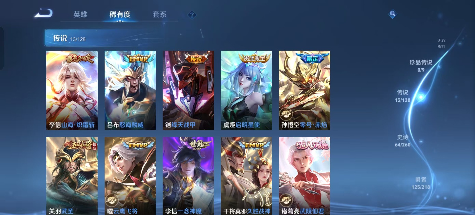 - [11578829]V9 3典藏 1珍品传说 9传说 123英雄 356皮肤 可修改实名 女号 荣耀水晶:全息碎影(猴子典藏),天鹅之梦(小乔典藏),星域神启(倪克斯贼亮) 珍品传说:酷洛米之心 传说皮:幻光神枪,黄金射手座,零号·赤焰,末日机甲-孙尚香(绿蚂蚱),久胜战神,超时空战士-狄仁杰 珍宝阁皮:蔷薇恋人,玩趣恶龙 限定皮:逐霄战戟,异界灵契(白毛香),五谷丰年,青龙志(铠年限),游园惊梦,李小龙,奇迹圣诞,默契交锋-兰陵王,孙行者,猪悟能,玉兔公主 史诗皮:茶境仙,苍鳞隐世,鸭鸭历险记-刘禅,灵蛊蚀心,龙之律动,石田雨龙,百相守梦-百里守约,芈月浮光幕影,怒海争锋,化蝶舞,紫霞仙子,苍穹之光,电玩小子(小书包),白龙吟,黄金分割率,特工魅影,千年之狐,江河有灵,百解令(蒙犽),匿光破解者,蒙恬荣光圣徽,冰冠公主,偶像歌手,魅语,暗夜猫娘,龙骑士(小龙虾),末日机甲-吕布,猫狗日记-孙策,猫狗日记-大乔,时之恋人-孙尚香,乱世虎臣,节奏热浪,修罗,女仆咖啡,摇滚巨星,水果甜心,绅士熊喵,天才门将,星夜王子,心灵骇客,功夫厨神,德古拉伯爵,暗隐猎兽者,幽灵船长,鬼剑武藏,心灵战警,乐园奇幻夜,天秀·启明,舞动绿茵,地狱岩魂,诗语江南,纤云弄巧,繁星吟游(呼啦呼啦),拒霜思,缤纷独角兽,乘风破浪,逐浪之夏,龙鼓争鸣,月团寄思,水晶猎龙者,曙光守护者,箭羽风息,金属风暴,圣诞狂欢,圣诞恋歌,鹰眼统帅,王者之锤,暗夜贵公子,魅力维加斯,千筹问战,无心