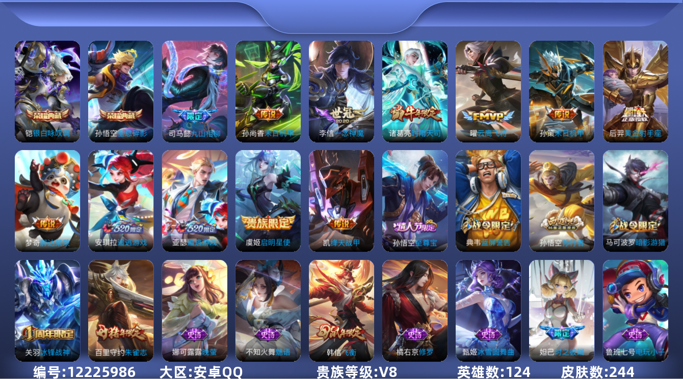 [12225986]V8 2典藏 12传说 124英雄 244皮肤 可修改实名 优质装备:全息碎影(猴子典藏),银白咏叹调(倪克斯侍卫),黄金射手座,云鹰飞将(小将军),绛天战甲(鸡嘴战神),一念神魔,末日机甲-孙尚香(绿蚂蚱),胖达荣荣,末日机甲-孙策,追逃游戏(亚瑟),追逃游戏(安琪拉) 传说皮:九山相柳 珍宝阁皮:玩趣恶龙 限定皮:陌上桑,至尊宝,时之彼端,时雨天司(水龙头),飞衡(韩信年限),五谷丰年,冰锋战神,梁祝,李小龙,朱雀志(守约年限),孙行者,梦圆繁星 史诗皮:破空之剑,电玩小子(小书包),白龙吟,黄金分割率,特工魅影,千年之狐,永昼,魅语,无限星赏官,冰冠公主,偶像歌手,晚萤,暗夜猫娘,龙骑士(小龙虾),末日机甲-吕布,猫狗日记-孙策,节奏热浪,修罗,女仆咖啡,水果甜心,绅士熊喵,星夜王子,心灵骇客,功夫厨神,暗隐猎兽者,鬼剑武藏,心灵战警,舞动绿茵,地狱岩魂,繁星吟游(呼啦呼啦),缤纷独角兽,乘风破浪,逐浪之夏,水晶猎龙者,箭羽风息,金属风暴,原初追逐者,圣诞狂欢,圣诞恋歌,鹰眼统帅,魅力维加斯,奇遇舞章,千筹问战,无心,未来纪元-赵云