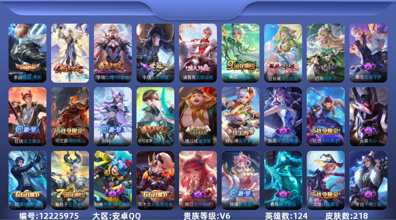 [12225975]【商品标题】:安卓Q-V6-最强王者段位-124英雄-218皮肤-1典藏-0珍品无双-0无双-0珍品传说-5传说-52史诗