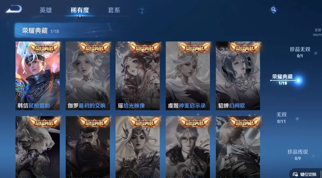 - PX_2096188-63 安卓QQ/永恒钻石/261皮肤/125英雄/6典藏/0珍品无双/1无双/3珍品传说/14传说/68史诗/9稀有英雄 【3 珍品传说】怪盗基德 马可波罗,时之奇旅 孙策,江户川柯南 鲁班七号, 【6 典藏皮肤】鸣剑·曳影 李白,全息碎影 孙悟空,天鹅之梦 小乔,神鉴启示录 虞姬,弑枪猎影 韩信,星域神启 诸葛亮, 【1 无双皮肤】器灵·螭龙剑 曜, 【14 传说皮肤】启明
