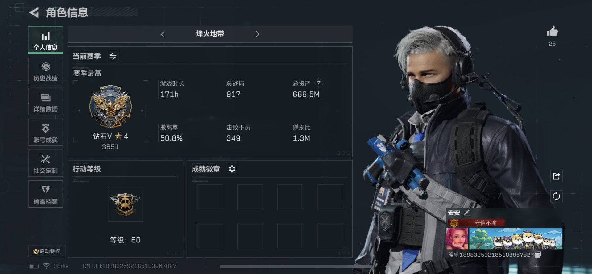 [12226043]总资产:666.5M 1近战传说 12传说枪械 哈夫币:500K 高级安全箱(2×3)9.15号到期 可二次 可修改实名 永久限制所有社交场景 优质装备:近战-黑海 烽火地带段位:钻石 全面战场段位:无段位 传说武器皮肤:UZI冲锋枪-特斯拉线圈,AWM狙击步枪-捞点薯条,腾龙突击步枪-捞点薯条,93R-捞点薯条,AK-12突击步枪-特斯拉线圈,SR-3M紧凑突击步枪-特斯拉线圈,勇士冲锋枪-能天使-午夜邮差,725双管霰弹枪-送葬人-无题密令,M4A1突击步枪-阿米娅,CAR-15突击步枪-阿米娅,AK-12突击步枪-夜鹰