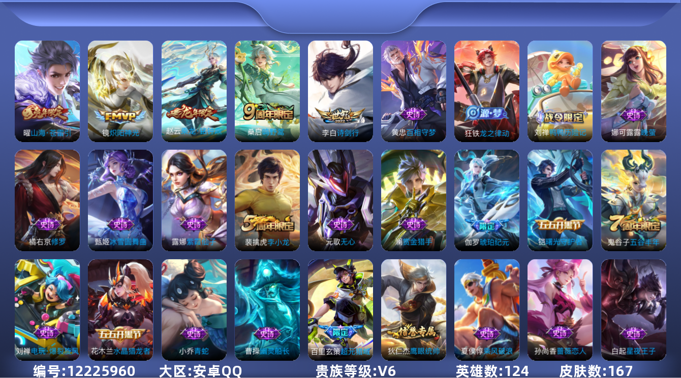 [12225960]V6 5传说 124英雄 167皮肤 可修改实名 优质装备:炽阳神光,山海·苍雷引(电光曜子) 传说皮:乘龙·铭钟鼎(赵云年限) 珍宝阁皮:蔷薇恋人,玩趣恶龙 限定皮:鸣野蒿,诗剑行,五谷丰年,李小龙 史诗皮:鸭鸭历险记-刘禅,龙之律动,琥珀纪元伽罗,超元猎域,百相守梦-黄忠,紫霞仙子,特工魅影,江河有灵,百解令(蒙犽),青蛇,晚萤,电玩·爆裂旋风,猫狗日记-大乔,节奏热浪,修罗,水果甜心,绅士熊喵,星夜王子,功夫厨神,德古拉伯爵,暗隐猎兽者,幽灵船长,鬼剑武藏,舞动绿茵,乘风破浪,逐浪之夏,水晶猎龙者,曙光守护者,金属风暴,鹰眼统帅,暗夜贵公子,魅力维加斯,赏金猎手,无心,未来纪元-赵云