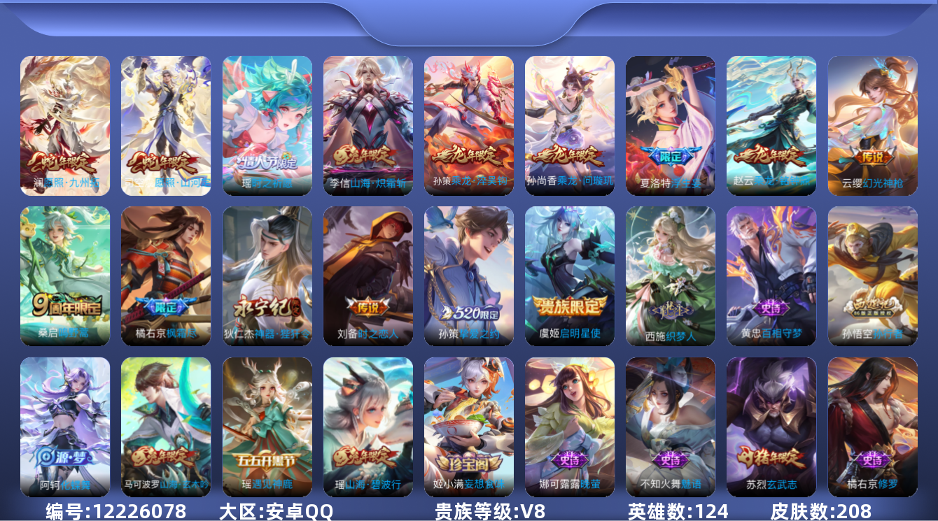 [12226078]V8 15传说 124英雄 208皮肤 可修改实名 优质装备:时之恋人-刘备(电焊工),挚爱之约,神器·狴犴令,山海·炽霜斩(李信年限),浮生妄 传说皮:乘龙·问璇玑(孙尚香年限),乘龙·铭钟鼎(赵云年限),乘龙·淬吴钩(孙策年限),幻光神枪 珍宝阁皮:妄想食味,玩趣恶龙 限定皮:愿照·九州拓(澜年限),愿照·山河定(司空震年限),鸣野蒿,山海·碧波行(瑶年限),瑞麟志(木兰年限),高山流水,五谷丰年,玄武志(苏烈年限),孙行者,寅虎·御盾(廉颇年限),时之祈愿-瑶(瑶传限),唐三藏,枫霜尽,山海·玄木吟(马可年限) 史诗皮:化蝶舞,星界战将,谪仙醉月,百相守梦-黄忠,织梦人,遇见神鹿,紫霞仙子,黄金分割率,特工魅影,千年之狐,永昼,江河有灵,浮梦罗烟,魅语,百解令(蒙犽),蒙恬荣光圣徽,无限星赏官,偶像歌手,晚萤,电玩·爆裂旋风,末日机甲-吕布,猫狗日记-孙策,时之恋人-孙尚香,节奏热浪,修罗,水果甜心,星夜王子,心灵骇客,功夫厨神,暗隐猎兽者,鬼剑武藏,纤云弄巧,拒霜思,缤纷独角兽,乘风破浪,逐浪之夏,水晶猎龙者,曙光守护者,唤灵魅影,金属风暴,圣诞狂欢,圣诞恋歌,鹰眼统帅,暗夜贵公子,魅力维加斯,天秀·音浪,寅虎·御盾,无心