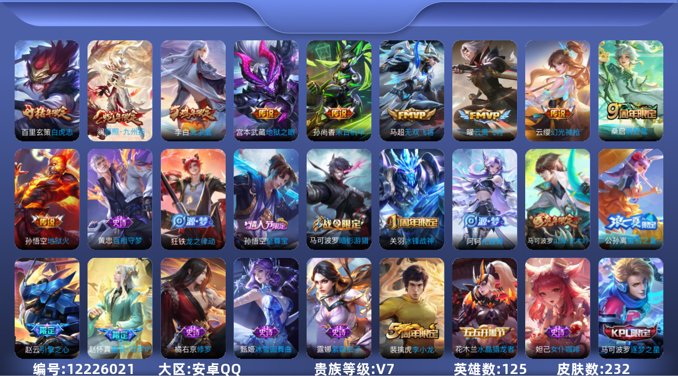 [12226021]V7 10传说 125英雄 232皮肤 可修改实名 优质装备:云鹰飞将(小将军),末日机甲-孙尚香(绿蚂蚱),地狱火,地狱之眼,无双飞将 传说皮:幻光神枪 珍宝阁皮:优雅恋人,女武神 限定皮:愿照·九州拓(澜年限),逐霄战戟,鸣野蒿,至尊宝,白虎志(电光耗子),凤求凰(白切鸡),冰锋战神,梁祝,逐梦之翼,逐梦之星,李小龙,引擎之心,蜜橘之夏,热情桑巴,山海·玄木吟(马可年限) 史诗皮:器灵·浮梦炉,糖绘人间,化蝶舞,龙之律动,蒙犽顽岩魄,百相守梦-百里守约,百相守梦-黄忠,紫霞仙子,苍穹之光,白龙吟,特工魅影,千年之狐,冰冠公主,偶像歌手,末日机甲-吕布,猫狗日记-孙策,乱世虎臣,节奏热浪,修罗,女仆咖啡,水果甜心,星夜王子,心灵骇客,德古拉伯爵,暗隐猎兽者,鬼剑武藏,心灵战警,舞动绿茵,纤云弄巧,缤纷独角兽,逐浪之夏,水晶猎龙者,金属风暴,圣诞狂欢,圣诞恋歌,鹰眼统帅,暗夜贵公子,滕王阁序