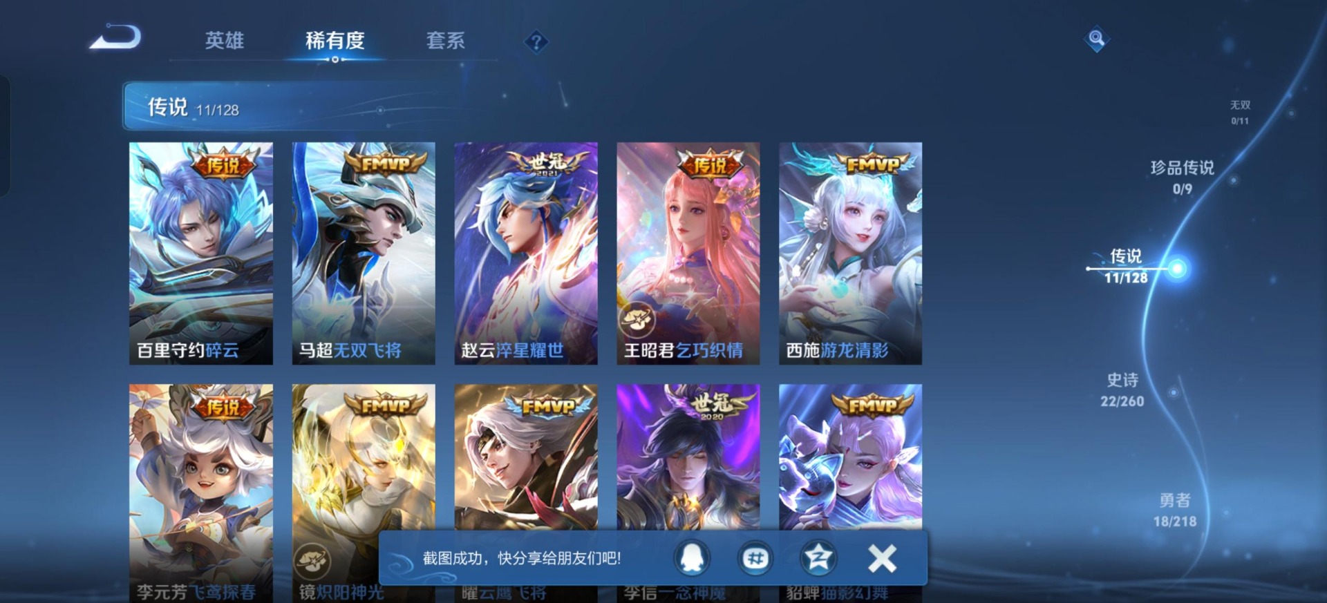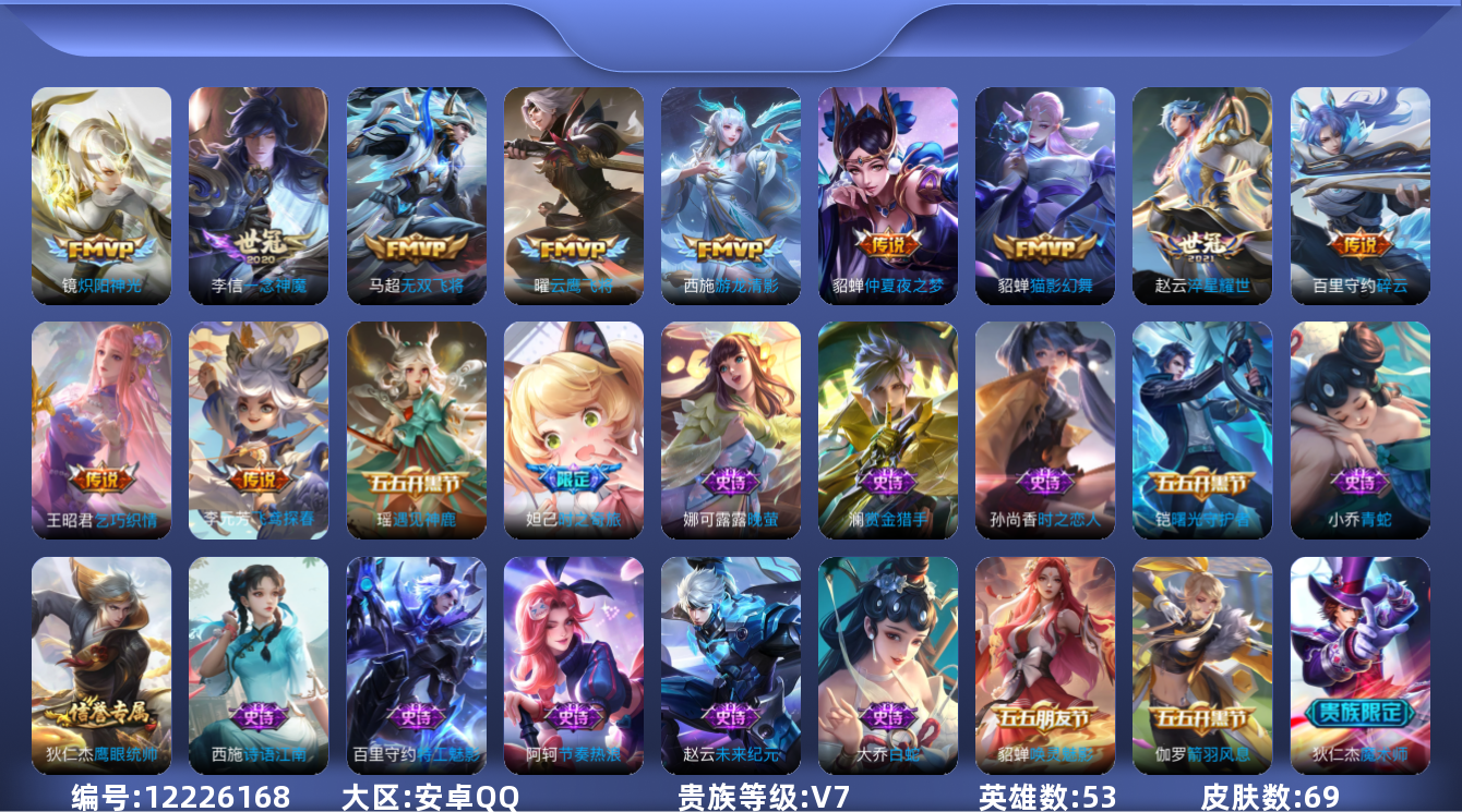 [12226168]V7 11传说 53英雄 69皮肤 可修改实名 优质装备:云鹰飞将(小将军),猫影幻舞,炽阳神光,一念神魔,仲夏夜之梦(大飞蛾),飞鸢探春,乞巧织情,游龙清影(小青龙),淬星耀世,无双飞将,碎云 限定皮:时之奇旅-妲己 史诗皮:遇见神鹿,特工魅影,青蛇,偶像歌手,白蛇,晚萤,时之恋人-孙尚香,节奏热浪,诗语江南,曙光守护者,热力回旋,箭羽风息,唤灵魅影,圣诞恋歌,鹰眼统帅,魅力维加斯,赏金猎手,千筹问战,未来纪元-赵云