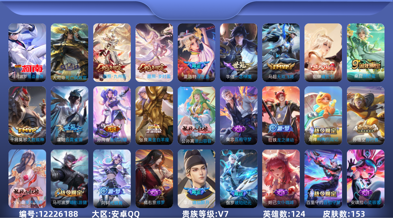 [12226188]V7 1珍品传说 12传说 124英雄 153皮肤 可修改实名 优质装备:怪盗基德,黄金白羊座,久胜战神,一念神魔,云霓雀翎,无双飞将,音你闪耀(rap皮),浮生妄,涂山容容 传说皮:貂蝉曦玄引,死亡执政官 珍宝阁皮:蔷薇恋人 限定皮:愿照·九州拓(澜年限),愿照·岁时盈(虞姬年限),鸣野蒿,孙行者 史诗皮:鸭鸭历险记-刘禅,化蝶舞,谪仙醉月,龙之律动,茶境仙,战舞者,东方月初,蒙犽顽岩魄,琥珀纪元伽罗,百相守梦-百里守约,百相守梦-黄忠,苍穹之光,黄金分割率,特工魅影,浮梦罗烟,偶像歌手,猫狗日记-孙策,节奏热浪,修罗,女仆咖啡,水果甜心,心灵骇客,鬼剑武藏,舞动绿茵,地狱岩魂,逐浪之夏,箭羽风息,金属风暴,圣诞狂欢,鹰眼统帅,魅力维加斯