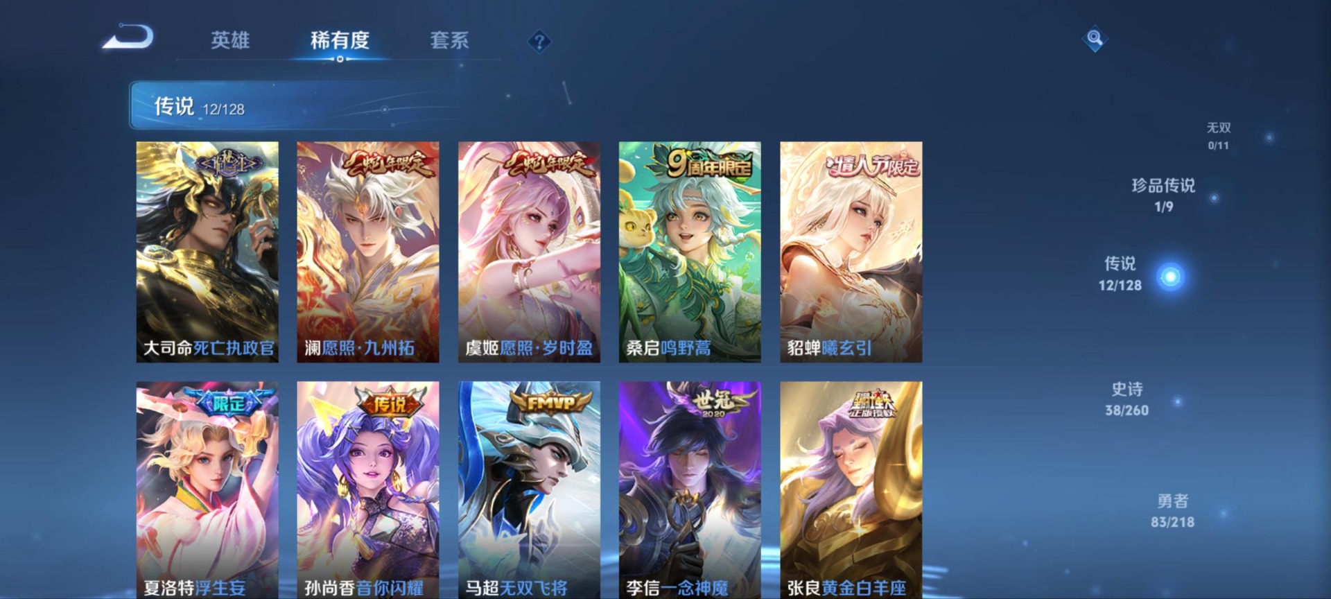 - [11529984]V6 1典藏 2传说 124英雄 160皮肤 可修改实名 荣耀水晶:星域神启(倪克斯贼亮) 传说皮:零号·赤焰 珍宝阁皮:女武神 限定皮:鸣野蒿,遇见飞天,李小龙,大圣娶亲 史诗皮:龙之律动,石田雨龙,特工魅影,冰冠公主,末日机甲-吕布,乱世虎臣,摇滚巨星,水果甜心,星夜王子,暗隐猎兽者,幽灵船长,纤云弄巧,繁星吟游(呼啦呼啦),缤纷独角兽,逐浪之夏,金属风暴,鹰眼统帅,魅力维加斯,未来纪元-赵云