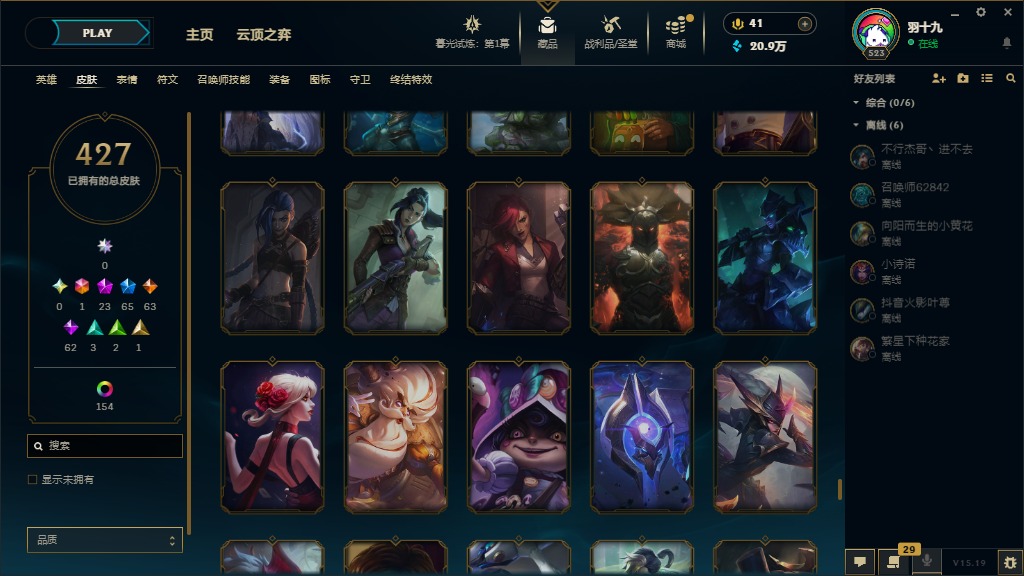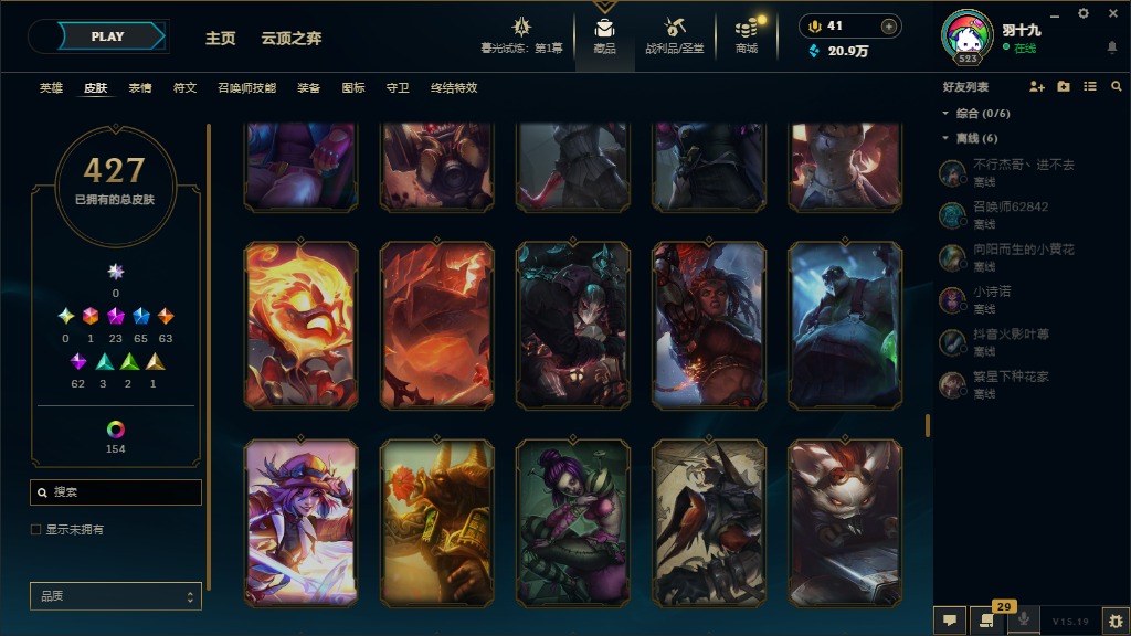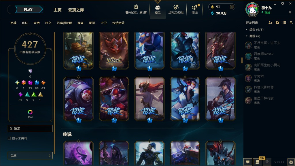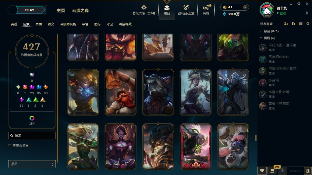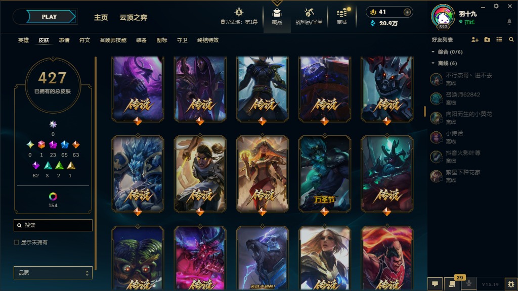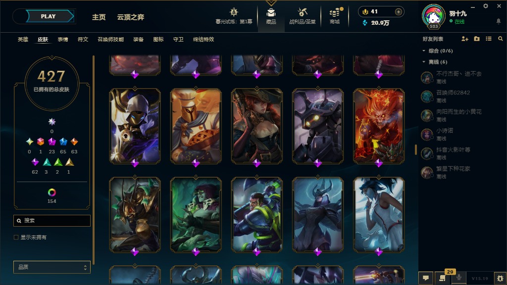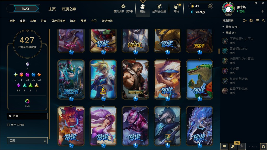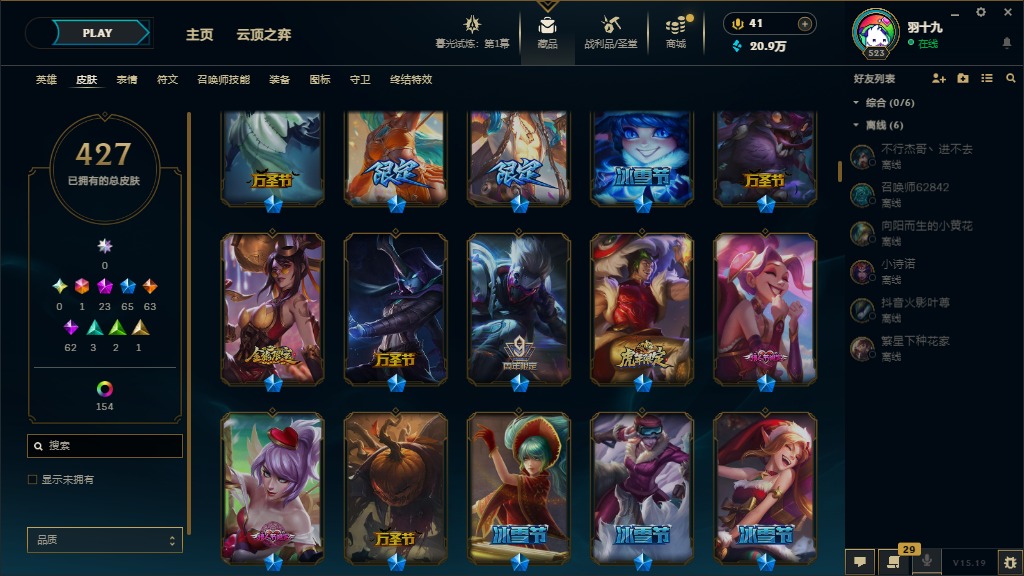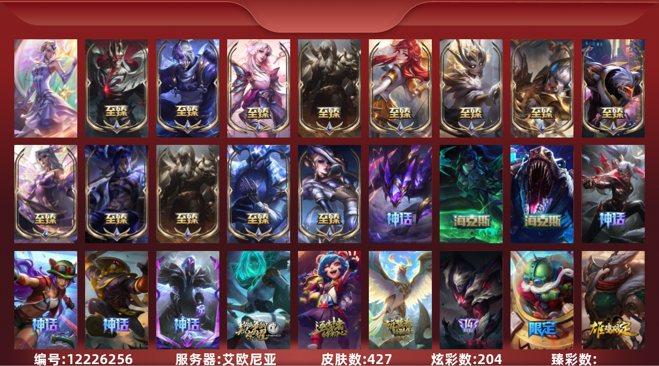 [12226256]1终极 23神话 65限定 63传说 62史诗 427皮肤 204炫彩 171英雄 可二次 可修改实名 优质装备:至臻 腥红之月 亚托克斯,至臻 战斗学院 拉克丝,至臻 魔女 婕拉,至臻 源计划:阴 劫,至臻 神龙尊者 炎龙瑟提,源代码 乐芙兰,暗影 沃里克,巧克力工坊 波比,都铎王朝 图奇,防爆士兵 炼金,冠军掠夺者 卡兹克,冠军之矛 滑板鞋,冠军之隐 劫,野兽猎人 德莱文,勇者 奈德丽,灰烬骑士 派克,大元素使,卧虎藏龙 贾克斯,至臻 花仙使者 卡特琳娜,至臻 墨之影武者 亚索,赵云 子龙 炫金将军,无畏骑士 瑟庄妮 赤子初心,新卧虎藏龙 贾克斯,至臻 DRX 亚托克斯,外星装甲 库奇,灵魂莲华 亚索 霜见之时,冠军之隐 劫 凯旋圣装,冠军之矛 卡莉丝塔 凯旋圣装,至臻 腥红之月 亚托克斯(2022),至臻 西部魔影 伊芙琳,净雪之月 莫甘娜 冬虹,墨之影武者 亚索 金墨耀影,魔女 阿狸 饕餮,海之歌 艾希 冰爽浪花,十五周年纪念 希维尔,水晶掠夺者 卡兹克,魔女 阿卡丽 虚荣,霸天异形 卡兹克 丛林灾厄,至臻 灵魂莲华 拉克丝,殿堂传奇 薇恩,至臻 灵魂莲华 劫,至臻 暗裔英雄 嘉文四世,暗裔英雄 盖伦,殿堂传奇 薇恩 登神 至臻:水晶掠夺者 卡兹克 海克斯:摄魂 薇恩,海克斯 雷克顿 情人节限定:觅心萝莉 金克丝,觅心之翼 奎因,甜心之翎 洛 赛季限定皮:胜利之运 崔斯特,胜利巨口 克格莫,胜利之王 泰达米尔 冠军限定系列:S1FNC 酒桶,S2 暗杀星 努努,S2 暗杀星 慎,S3 SKT T1 劫,S3 SKT T1 贾克斯,S5 SKT T1 阿利斯塔,S5 SKT T1 阿兹尔,S5 SKT T1 蜘蛛,S6 SKT T1 奥拉夫,S6 SKT T1 娜美,S7 SSG 伊泽瑞尔,S9 FPX 墨菲特,S12 DRX 千珏 冰雪节限定:“主人不要我了” 阿木木,冰雪风暴 希维尔,持胡萝卜的雪人 易,寒冬精灵 璐璐,平安夜女神 娑娜,魄罗骑士 瑟庄妮,圣诞捣蛋鬼 金克丝,圣诞开心鬼 提莫,圣诞精灵 崔丝塔娜,圣诞狂欢 时光,圣诞玩偶 波比,圣诞驯鹿 克格莫,邪恶圣诞老人 维迦,北极星圣贤 基兰 泳池派对:泳池派对 吉格斯,泳池派对 黑默丁格,泳池派对 雷克顿,泳池派对 瑟提,泳池派对 球女,海之歌 永恩,海之歌 奈德丽 万圣节限定:鬼影重重 魔腾,古拉