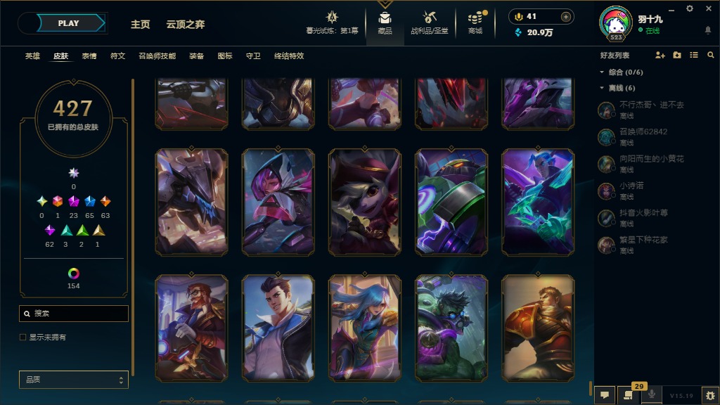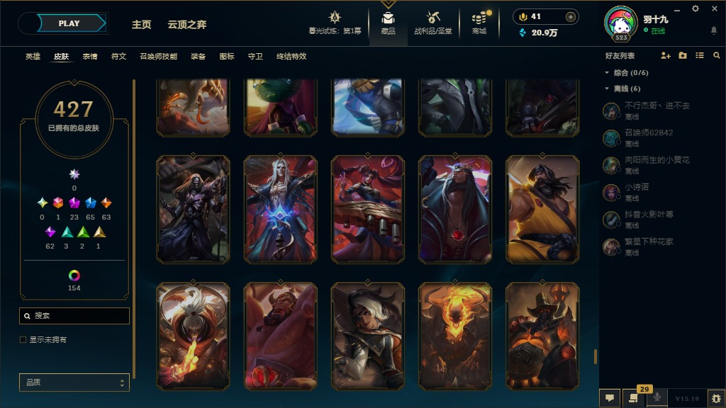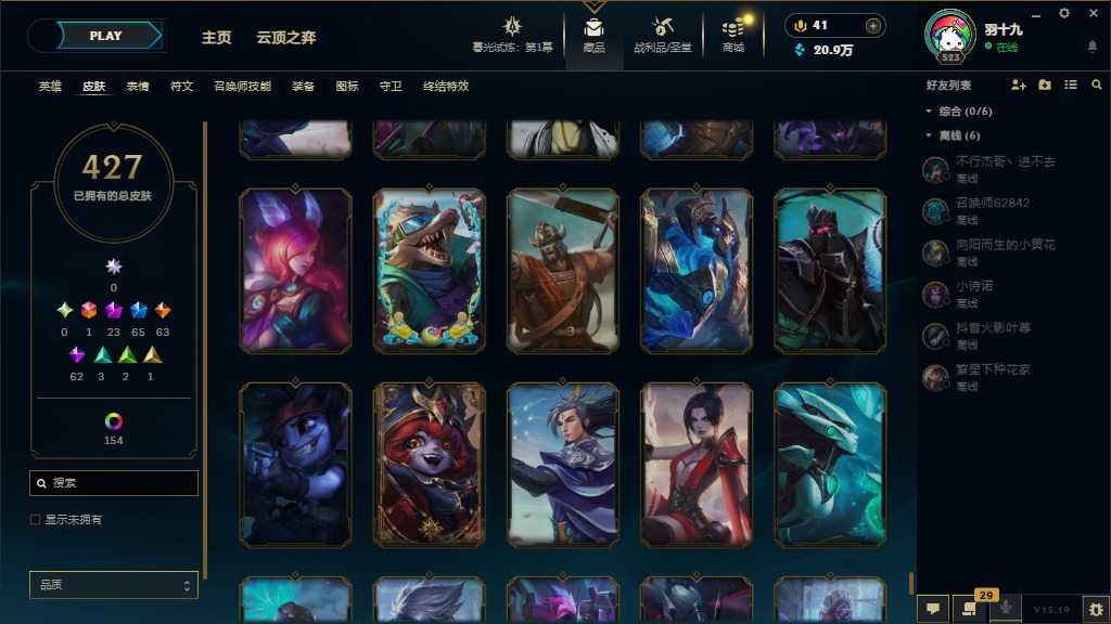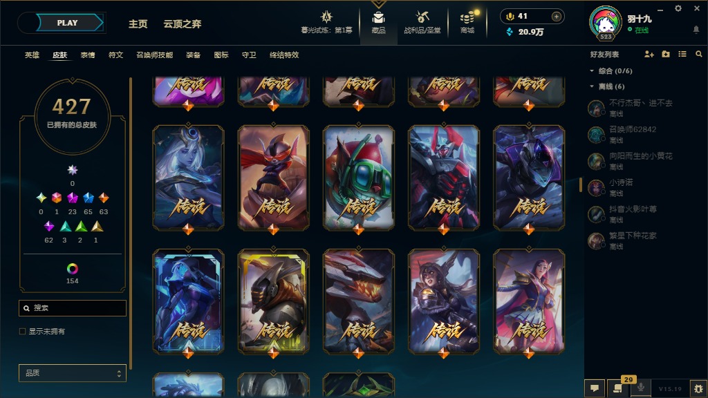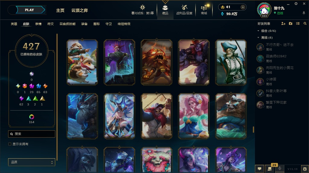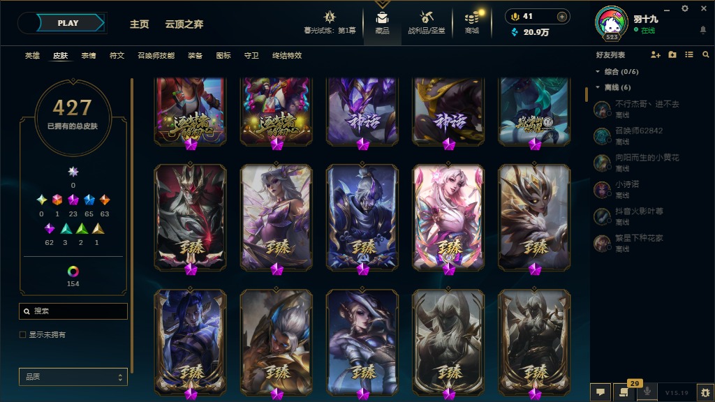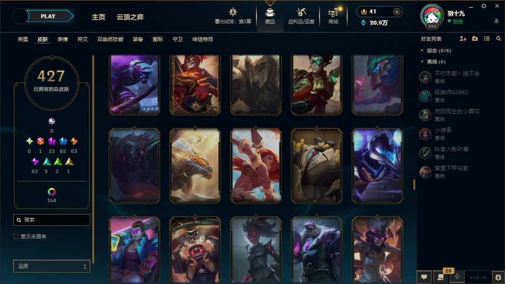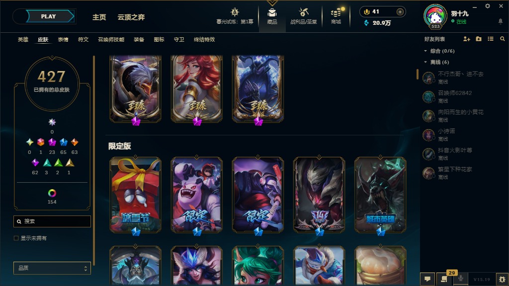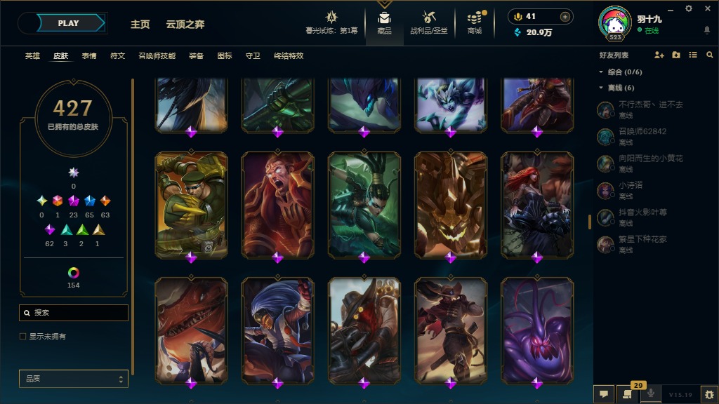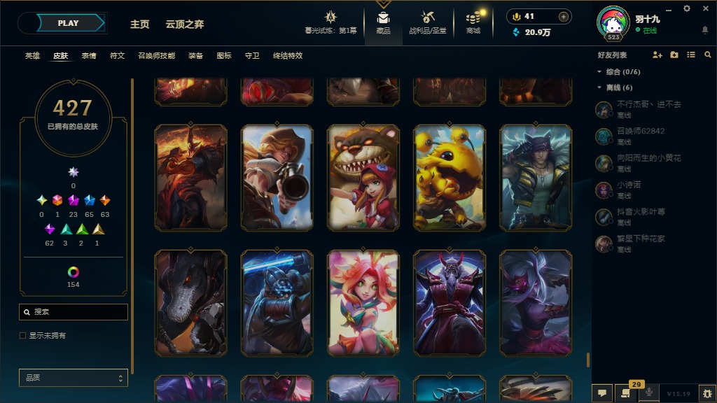 [12226256]1终极 23神话 65限定 63传说 62史诗 427皮肤 204炫彩 171英雄 可二次 可修改实名 优质装备:至臻 腥红之月 亚托克斯,至臻 战斗学院 拉克丝,至臻 魔女 婕拉,至臻 源计划:阴 劫,至臻 神龙尊者 炎龙瑟提,源代码 乐芙兰,暗影 沃里克,巧克力工坊 波比,都铎王朝 图奇,防爆士兵 炼金,冠军掠夺者 卡兹克,冠军之矛 滑板鞋,冠军之隐 劫,野兽猎人 德莱文,勇者 奈德丽,灰烬骑士 派克,大元素使,卧虎藏龙 贾克斯,至臻 花仙使者 卡特琳娜,至臻 墨之影武者 亚索,赵云 子龙 炫金将军,无畏骑士 瑟庄妮 赤子初心,新卧虎藏龙 贾克斯,至臻 DRX 亚托克斯,外星装甲 库奇,灵魂莲华 亚索 霜见之时,冠军之隐 劫 凯旋圣装,冠军之矛 卡莉丝塔 凯旋圣装,至臻 腥红之月 亚托克斯(2022),至臻 西部魔影 伊芙琳,净雪之月 莫甘娜 冬虹,墨之影武者 亚索 金墨耀影,魔女 阿狸 饕餮,海之歌 艾希 冰爽浪花,十五周年纪念 希维尔,水晶掠夺者 卡兹克,魔女 阿卡丽 虚荣,霸天异形 卡兹克 丛林灾厄,至臻 灵魂莲华 拉克丝,殿堂传奇 薇恩,至臻 灵魂莲华 劫,至臻 暗裔英雄 嘉文四世,暗裔英雄 盖伦,殿堂传奇 薇恩 登神 至臻:水晶掠夺者 卡兹克 海克斯:摄魂 薇恩,海克斯 雷克顿 情人节限定:觅心萝莉 金克丝,觅心之翼 奎因,甜心之翎 洛 赛季限定皮:胜利之运 崔斯特,胜利巨口 克格莫,胜利之王 泰达米尔 冠军限定系列:S1FNC 酒桶,S2 暗杀星 努努,S2 暗杀星 慎,S3 SKT T1 劫,S3 SKT T1 贾克斯,S5 SKT T1 阿利斯塔,S5 SKT T1 阿兹尔,S5 SKT T1 蜘蛛,S6 SKT T1 奥拉夫,S6 SKT T1 娜美,S7 SSG 伊泽瑞尔,S9 FPX 墨菲特,S12 DRX 千珏 冰雪节限定:“主人不要我了” 阿木木,冰雪风暴 希维尔,持胡萝卜的雪人 易,寒冬精灵 璐璐,平安夜女神 娑娜,魄罗骑士 瑟庄妮,圣诞捣蛋鬼 金克丝,圣诞开心鬼 提莫,圣诞精灵 崔丝塔娜,圣诞狂欢 时光,圣诞玩偶 波比,圣诞驯鹿 克格莫,邪恶圣诞老人 维迦,北极星圣贤 基兰 泳池派对:泳池派对 吉格斯,泳池派对 黑默丁格,泳池派对 雷克顿,泳池派对 瑟提,泳池派对 球女,海之歌 永恩,海之歌 奈德丽 万圣节限定:鬼影重重 魔腾,古拉