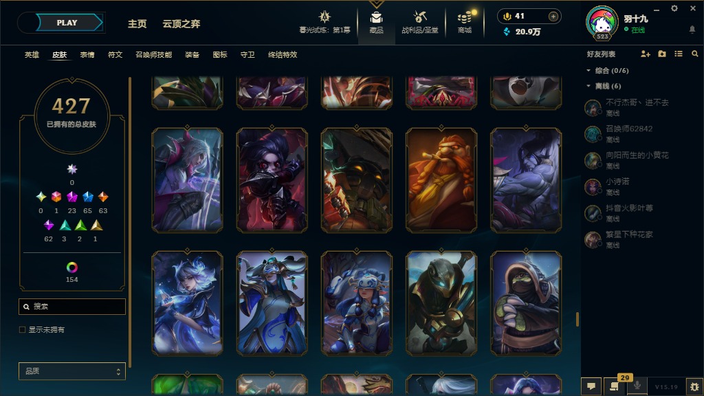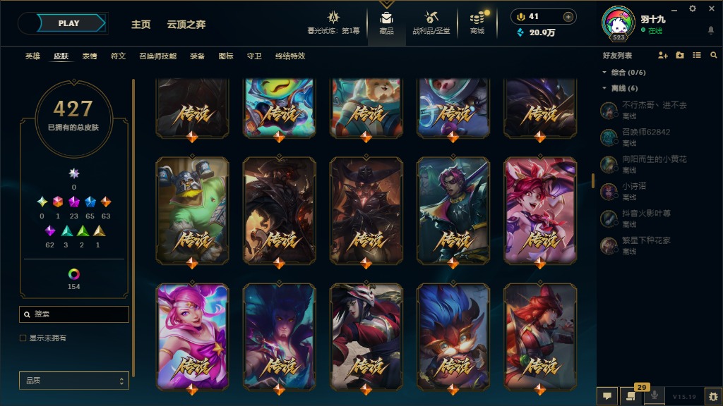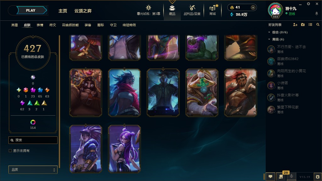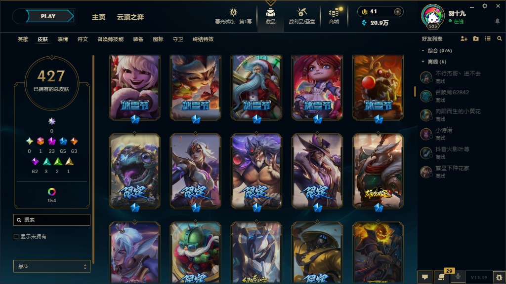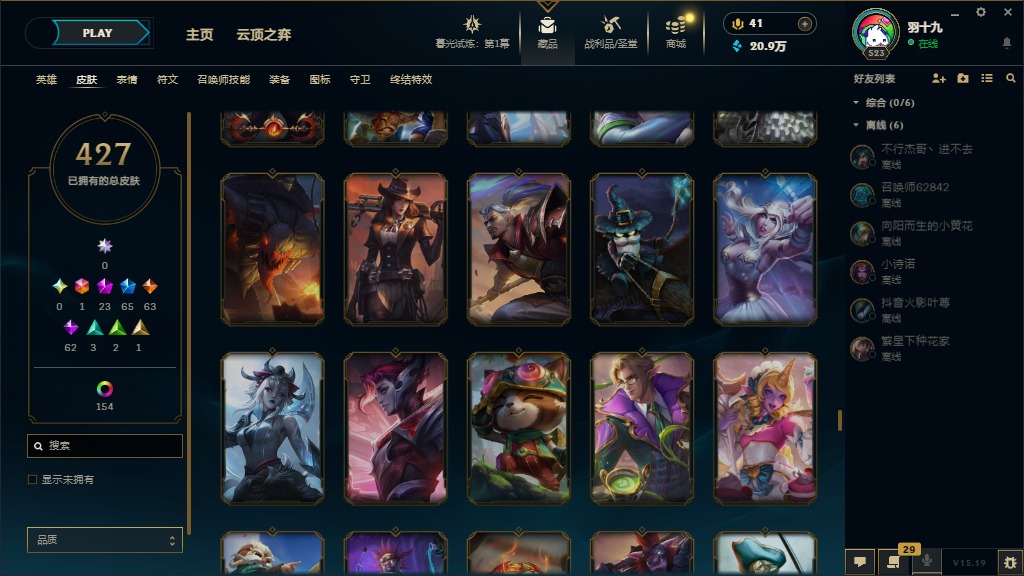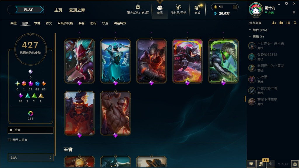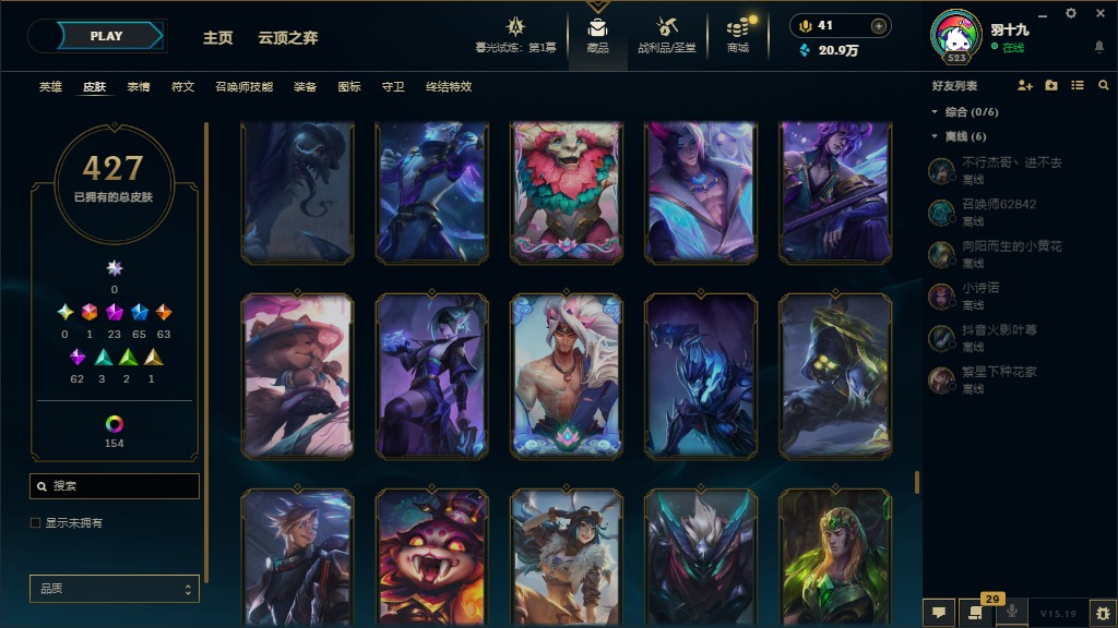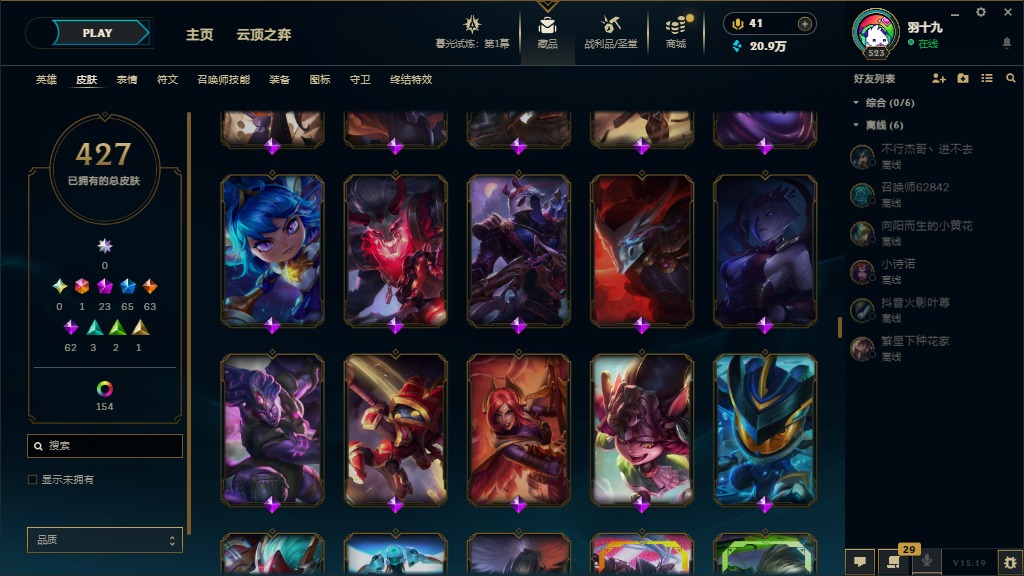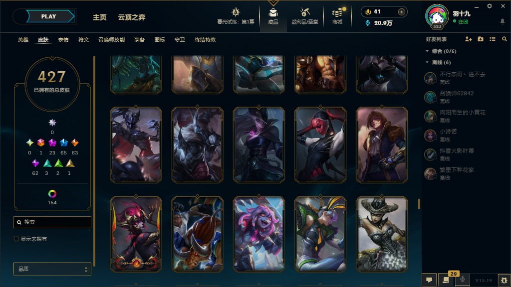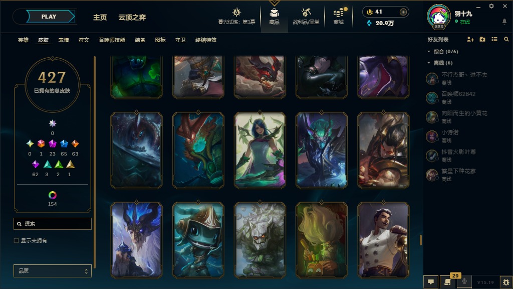 [12226256]1终极 23神话 65限定 63传说 62史诗 427皮肤 204炫彩 171英雄 可二次 可修改实名 优质装备:至臻 腥红之月 亚托克斯,至臻 战斗学院 拉克丝,至臻 魔女 婕拉,至臻 源计划:阴 劫,至臻 神龙尊者 炎龙瑟提,源代码 乐芙兰,暗影 沃里克,巧克力工坊 波比,都铎王朝 图奇,防爆士兵 炼金,冠军掠夺者 卡兹克,冠军之矛 滑板鞋,冠军之隐 劫,野兽猎人 德莱文,勇者 奈德丽,灰烬骑士 派克,大元素使,卧虎藏龙 贾克斯,至臻 花仙使者 卡特琳娜,至臻 墨之影武者 亚索,赵云 子龙 炫金将军,无畏骑士 瑟庄妮 赤子初心,新卧虎藏龙 贾克斯,至臻 DRX 亚托克斯,外星装甲 库奇,灵魂莲华 亚索 霜见之时,冠军之隐 劫 凯旋圣装,冠军之矛 卡莉丝塔 凯旋圣装,至臻 腥红之月 亚托克斯(2022),至臻 西部魔影 伊芙琳,净雪之月 莫甘娜 冬虹,墨之影武者 亚索 金墨耀影,魔女 阿狸 饕餮,海之歌 艾希 冰爽浪花,十五周年纪念 希维尔,水晶掠夺者 卡兹克,魔女 阿卡丽 虚荣,霸天异形 卡兹克 丛林灾厄,至臻 灵魂莲华 拉克丝,殿堂传奇 薇恩,至臻 灵魂莲华 劫,至臻 暗裔英雄 嘉文四世,暗裔英雄 盖伦,殿堂传奇 薇恩 登神 至臻:水晶掠夺者 卡兹克 海克斯:摄魂 薇恩,海克斯 雷克顿 情人节限定:觅心萝莉 金克丝,觅心之翼 奎因,甜心之翎 洛 赛季限定皮:胜利之运 崔斯特,胜利巨口 克格莫,胜利之王 泰达米尔 冠军限定系列:S1FNC 酒桶,S2 暗杀星 努努,S2 暗杀星 慎,S3 SKT T1 劫,S3 SKT T1 贾克斯,S5 SKT T1 阿利斯塔,S5 SKT T1 阿兹尔,S5 SKT T1 蜘蛛,S6 SKT T1 奥拉夫,S6 SKT T1 娜美,S7 SSG 伊泽瑞尔,S9 FPX 墨菲特,S12 DRX 千珏 冰雪节限定:“主人不要我了” 阿木木,冰雪风暴 希维尔,持胡萝卜的雪人 易,寒冬精灵 璐璐,平安夜女神 娑娜,魄罗骑士 瑟庄妮,圣诞捣蛋鬼 金克丝,圣诞开心鬼 提莫,圣诞精灵 崔丝塔娜,圣诞狂欢 时光,圣诞玩偶 波比,圣诞驯鹿 克格莫,邪恶圣诞老人 维迦,北极星圣贤 基兰 泳池派对:泳池派对 吉格斯,泳池派对 黑默丁格,泳池派对 雷克顿,泳池派对 瑟提,泳池派对 球女,海之歌 永恩,海之歌 奈德丽 万圣节限定:鬼影重重 魔腾,古拉