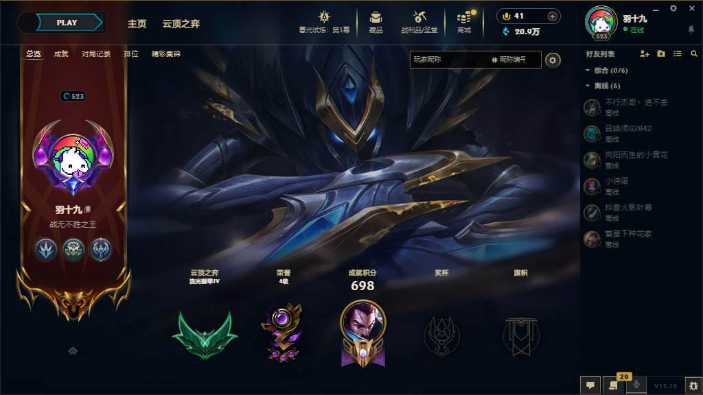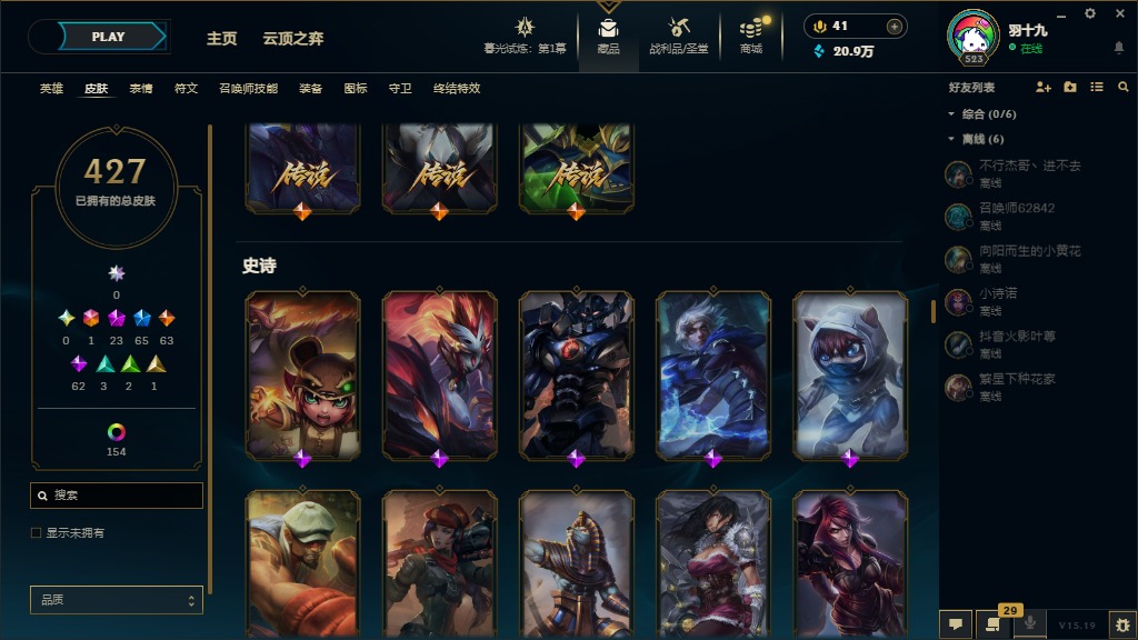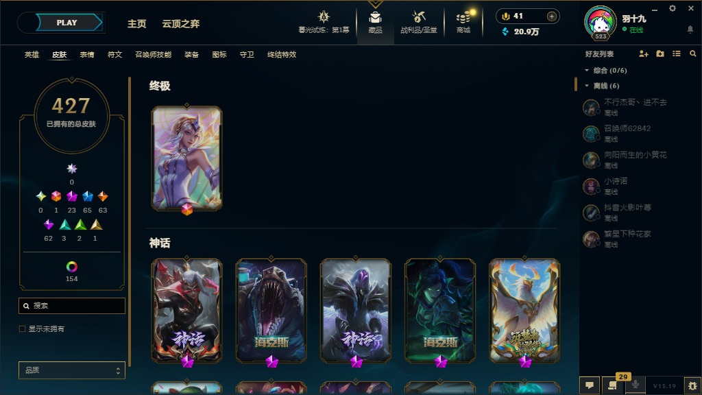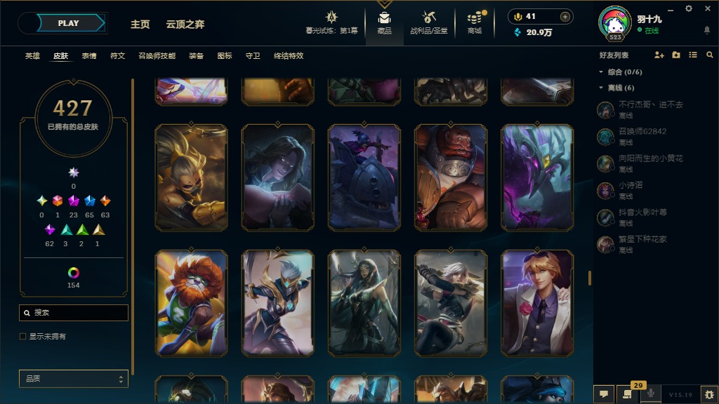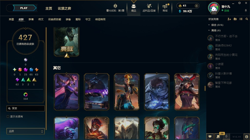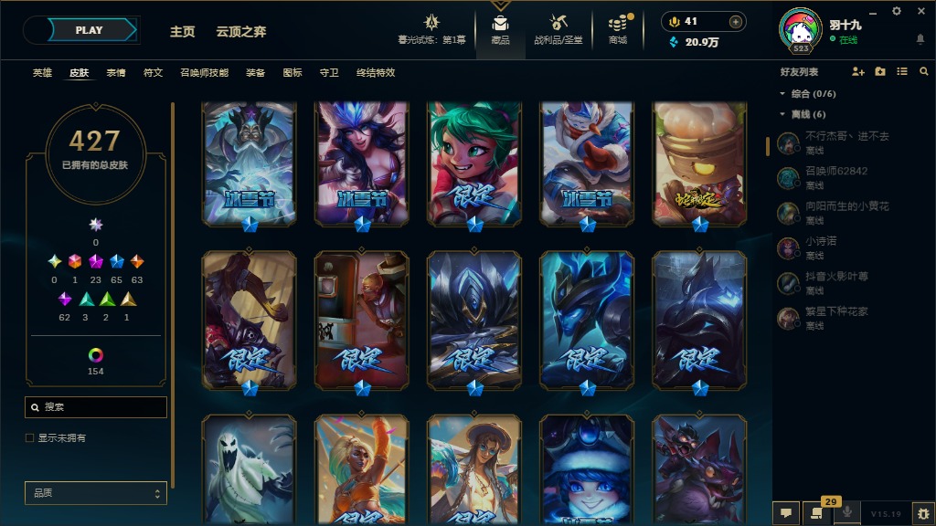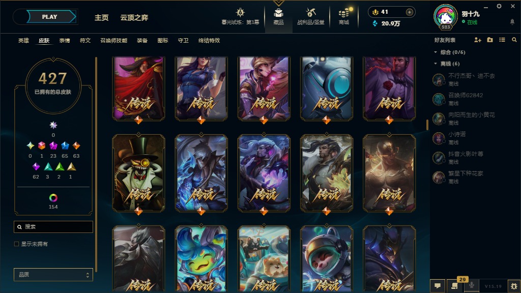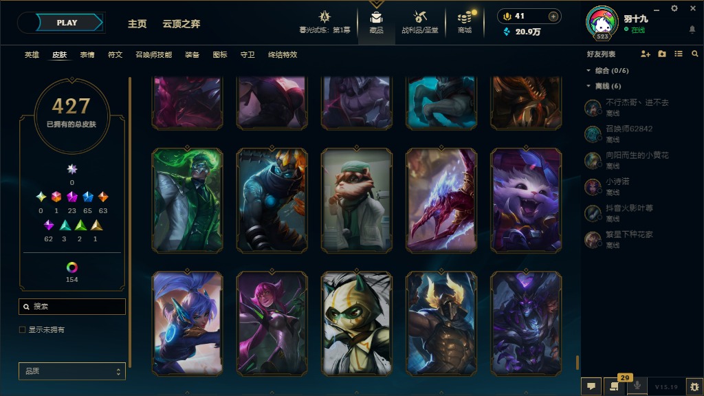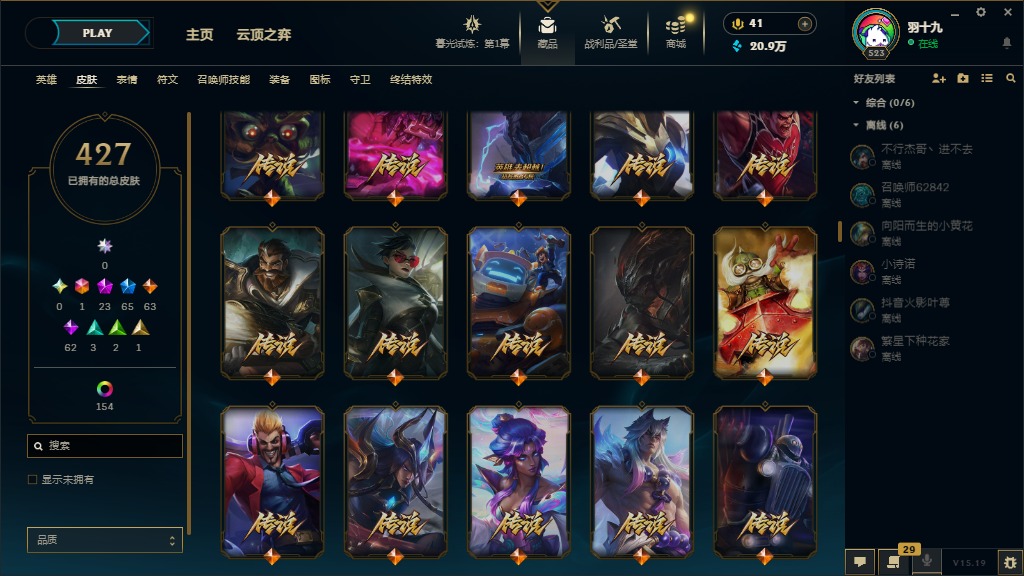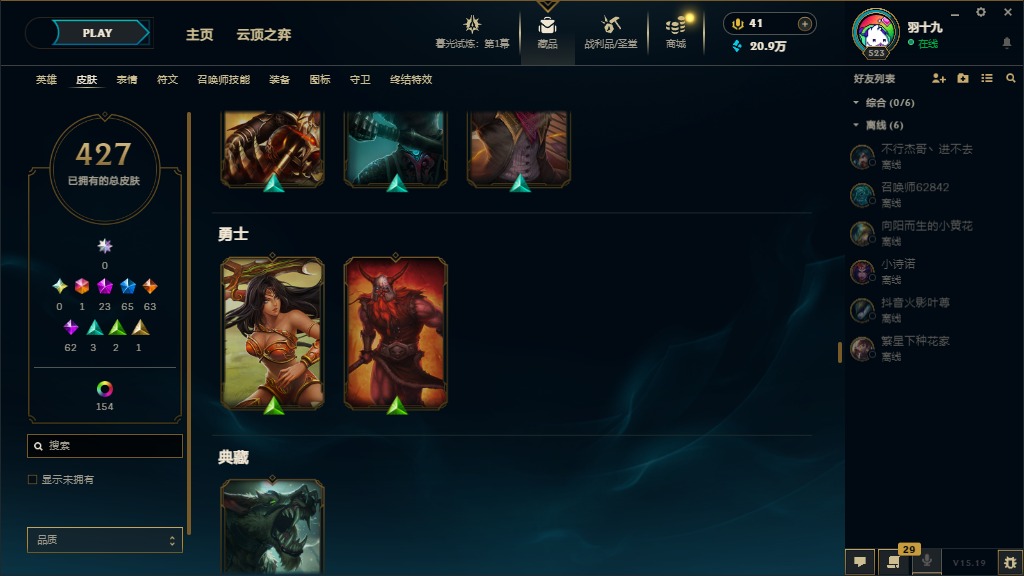 [12226256]1终极 23神话 65限定 63传说 62史诗 427皮肤 204炫彩 171英雄 可二次 可修改实名 优质装备:至臻 腥红之月 亚托克斯,至臻 战斗学院 拉克丝,至臻 魔女 婕拉,至臻 源计划:阴 劫,至臻 神龙尊者 炎龙瑟提,源代码 乐芙兰,暗影 沃里克,巧克力工坊 波比,都铎王朝 图奇,防爆士兵 炼金,冠军掠夺者 卡兹克,冠军之矛 滑板鞋,冠军之隐 劫,野兽猎人 德莱文,勇者 奈德丽,灰烬骑士 派克,大元素使,卧虎藏龙 贾克斯,至臻 花仙使者 卡特琳娜,至臻 墨之影武者 亚索,赵云 子龙 炫金将军,无畏骑士 瑟庄妮 赤子初心,新卧虎藏龙 贾克斯,至臻 DRX 亚托克斯,外星装甲 库奇,灵魂莲华 亚索 霜见之时,冠军之隐 劫 凯旋圣装,冠军之矛 卡莉丝塔 凯旋圣装,至臻 腥红之月 亚托克斯(2022),至臻 西部魔影 伊芙琳,净雪之月 莫甘娜 冬虹,墨之影武者 亚索 金墨耀影,魔女 阿狸 饕餮,海之歌 艾希 冰爽浪花,十五周年纪念 希维尔,水晶掠夺者 卡兹克,魔女 阿卡丽 虚荣,霸天异形 卡兹克 丛林灾厄,至臻 灵魂莲华 拉克丝,殿堂传奇 薇恩,至臻 灵魂莲华 劫,至臻 暗裔英雄 嘉文四世,暗裔英雄 盖伦,殿堂传奇 薇恩 登神 至臻:水晶掠夺者 卡兹克 海克斯:摄魂 薇恩,海克斯 雷克顿 情人节限定:觅心萝莉 金克丝,觅心之翼 奎因,甜心之翎 洛 赛季限定皮:胜利之运 崔斯特,胜利巨口 克格莫,胜利之王 泰达米尔 冠军限定系列:S1FNC 酒桶,S2 暗杀星 努努,S2 暗杀星 慎,S3 SKT T1 劫,S3 SKT T1 贾克斯,S5 SKT T1 阿利斯塔,S5 SKT T1 阿兹尔,S5 SKT T1 蜘蛛,S6 SKT T1 奥拉夫,S6 SKT T1 娜美,S7 SSG 伊泽瑞尔,S9 FPX 墨菲特,S12 DRX 千珏 冰雪节限定:“主人不要我了” 阿木木,冰雪风暴 希维尔,持胡萝卜的雪人 易,寒冬精灵 璐璐,平安夜女神 娑娜,魄罗骑士 瑟庄妮,圣诞捣蛋鬼 金克丝,圣诞开心鬼 提莫,圣诞精灵 崔丝塔娜,圣诞狂欢 时光,圣诞玩偶 波比,圣诞驯鹿 克格莫,邪恶圣诞老人 维迦,北极星圣贤 基兰 泳池派对:泳池派对 吉格斯,泳池派对 黑默丁格,泳池派对 雷克顿,泳池派对 瑟提,泳池派对 球女,海之歌 永恩,海之歌 奈德丽 万圣节限定:鬼影重重 魔腾,古拉