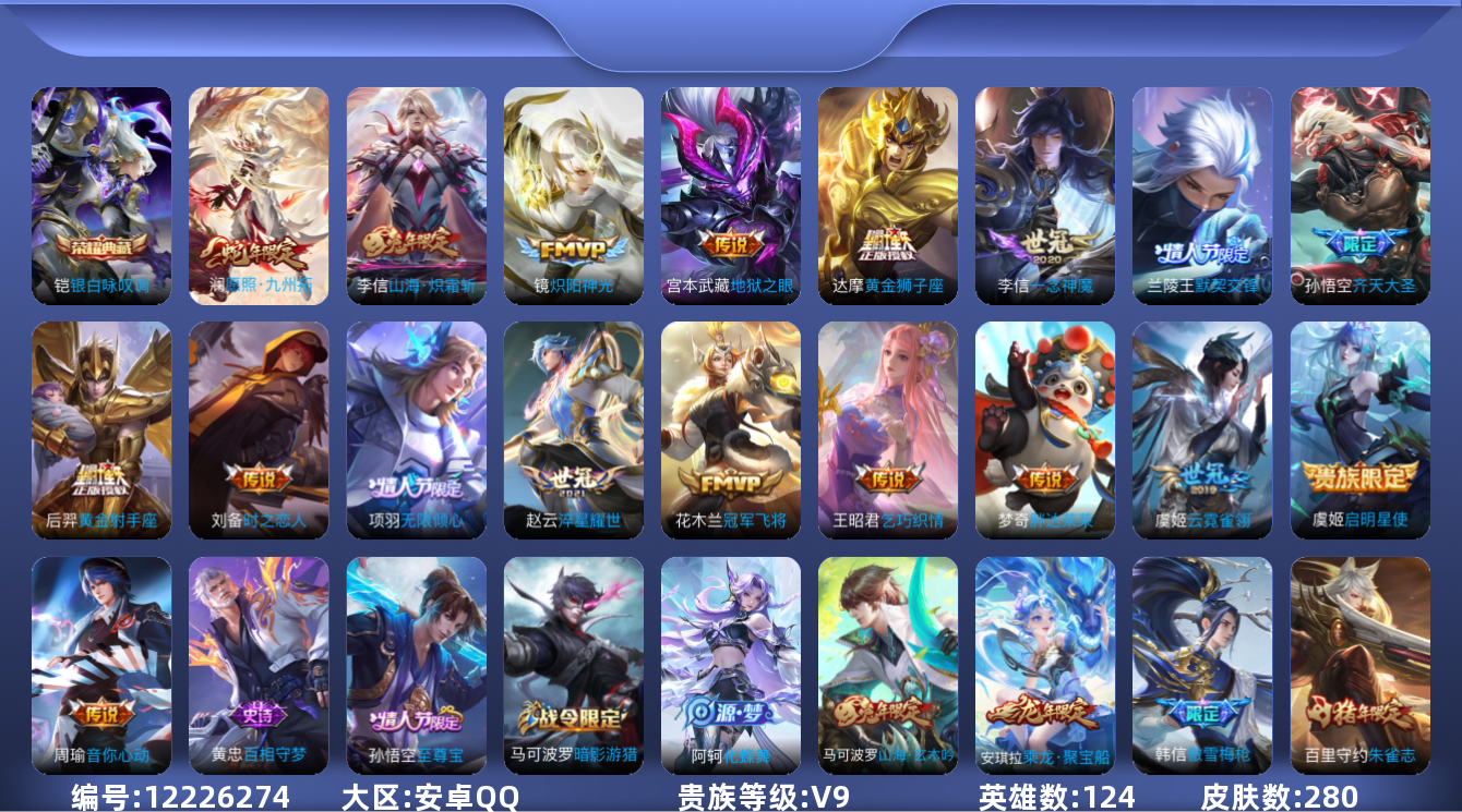 [12226274]V9 1典藏 18传说 124英雄 280皮肤 可修改实名 优质装备:银白咏叹调(倪克斯侍卫),黄金狮子座,黄金射手座,冠军飞将,炽阳神光,一念神魔,云霓雀翎,地狱之眼,音你心动-周瑜,胖达荣荣,乞巧织情,时之恋人-刘备(电焊工),淬星耀世,山海·炽霜斩(李信年限) 珍宝阁皮:蔷薇恋人 限定皮:愿照·九州拓(澜年限),至尊宝,傲雪梅枪,无限倾心-项羽,齐天大圣,李小龙,朱雀志(守约年限),默契交锋-兰陵王,山海·玄木吟(马可年限) 史诗皮:器灵·浮梦炉,化蝶舞,蔬乡物语(鲁班七号),乘龙·聚宝船(安琪拉年限),百相守梦-黄忠,紫霞仙子,苍穹之光,电玩小子(小书包),白龙吟,黄金分割率,特工魅影,千年之狐,江河有灵,匿光侦查者,魅语,无限星赏官,冰冠公主,青蛇,偶像歌手,白蛇,晚萤,电玩·爆裂旋风,暗夜猫娘,龙骑士(小龙虾),末日机甲-吕布,猫狗日记-孙策,猫狗日记-大乔,时之恋人-孙尚香,乱世虎臣,节奏热浪,修罗,女仆咖啡,摇滚巨星,水果甜心,绅士熊喵,天才门将,星夜王子,心灵骇客,功夫厨神,德古拉伯爵,暗隐猎兽者,幽灵船长,鬼剑武藏,心灵战警,天秀·启明,舞动绿茵,地狱岩魂,诗语江南,繁星吟游(呼啦呼啦),缤纷独角兽,乘风破浪,逐浪之夏,龙鼓争鸣,水晶猎龙者,曙光守护者,热力回旋,箭羽风息,金属风暴,圣诞狂欢,圣诞恋歌,鹰眼统帅,暗夜贵公子,魅力维加斯,赏金猎手,未来纪元-赵云