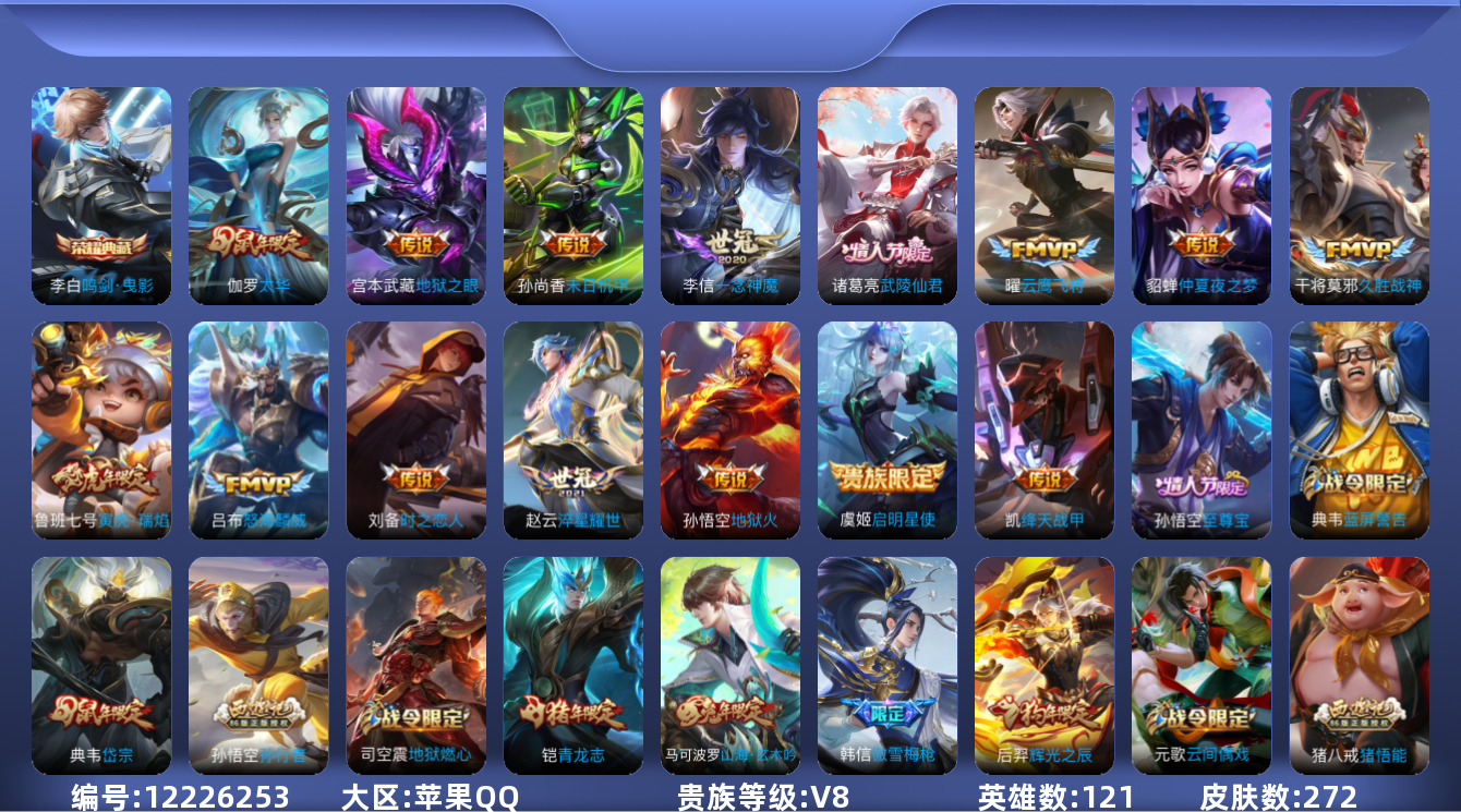 [12226253]V8 1典藏 15传说 121英雄 272皮肤 可修改实名 优质装备:鸣剑·曳影,云鹰飞将(小将军),绛天战甲(鸡嘴战神),久胜战神,一念神魔,末日机甲-孙尚香(绿蚂蚱),地狱火,仲夏夜之梦(大飞蛾),地狱之眼,时之恋人-刘备(电焊工),淬星耀世 珍宝阁皮:蔷薇恋人,玩趣恶龙 限定皮:至尊宝,太华(伽罗年限),武陵仙君(小桃花),傲雪梅枪,高山流水,怒海麟威,五谷丰年,青龙志(铠年限),御风骁将(吕布年限),岱宗(典韦年限),天狼征服者,李小龙,辉光之辰,孙行者,猪悟能,匿光追影者,寅虎·瑞焰(虎皮蛋子),山海·玄木吟(马可年限) 史诗皮:电玩小子(小书包),白龙吟,黄金分割率,特工魅影,千年之狐,冰冠公主,百解令(蒙犽),魅语,电玩·爆裂旋风,无限星赏官,晚萤,偶像歌手,电玩·兔顽号,暗夜猫娘,猫狗日记-孙策,时之恋人-孙尚香,乱世虎臣,节奏热浪,修罗,女仆咖啡,摇滚巨星,水果甜心,星夜王子,心灵骇客,时之奇旅-安琪拉,功夫厨神,德古拉伯爵,暗隐猎兽者,幽灵船长,鬼剑武藏,暗渊魔法,心灵战警,地狱岩魂,纤云弄巧,拒霜思,缤纷独角兽,乘风破浪,逐浪之夏,热力回旋,金属风暴,鹰眼统帅,魅力维加斯,天秀·音浪,无心,未来纪元-赵云