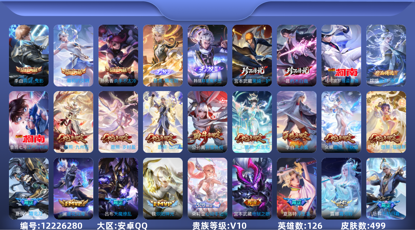 [12226280]V10 3典藏 2无双 5珍品传说 46传说 126英雄 499皮肤 典藏英雄武则天 可修改实名 优质装备:杀手不太冷,鸣剑·曳影,韩信群星魔术团(韩信无双),器灵·螭龙剑,最初的交响(伽罗典藏),江户川柯南,怪盗基德,器灵·落星盏,朽木白哉,黑崎一护,云鹰飞将(小将军),黄金白羊座,炽阳神光,云霓雀翎,地狱火,仲夏夜之梦(大飞蛾),零号·赤焰,海洋之心,地狱之眼,胖达荣荣,乞巧织情,超时空战士-狄仁杰,末日机甲-孙策,炽翼辉光(娃娃菜牛角包),燃星之曲,浮生妄,鹤羽星尊,灼幽烈阳,妄想实况,妄想奇谈,鹤归松栖(云缨),霜月吟,澜逐花归海,艾琳觅芳踪,云中君群星魔术团,朵莉亚心动手记,千劫归真,涂山容容 传说皮:星之鸣奏,幻光神枪 珍宝阁皮:妄想食味,优雅恋人,蔷薇恋人 限定皮:愿照·九州拓(澜年限),愿照·福禄聚(蔡文姬年限),愿照·岁时盈(虞姬年限),愿照·山河定(司空震年限),愿照·众生和(妲己年限),愿照·千秋盛(女娲年限),逐霄战戟,陌上桑,鸣野蒿,夏侯惇霜北刀,至尊宝,凤求凰(白切鸡),凤凰于飞,武陵仙君(小桃花),傲雪梅枪,星穹之声,魔法小厨娘,白晶晶,神威(电光马子),飞衡(韩信年限),遇见飞天,高山流水,诗剑行,齐天大圣,降魔,五谷丰年,冰锋战神,天狼运算者,梁祝,逐梦之翼,逐梦之星,天狼溯光者,逐梦之音,祈雪灵祝(雪兔子),天狼绘梦者,李小龙,逐梦之影,霸王别姬-项羽,孙行者,猪悟能,一生所爱,大圣娶亲,引擎之心,天魔缭乱,青春决赛季,冰霜恋舞曲,云端筑梦师,蜜橘之夏,神奇女侠,美猴王,匿光追影者,女儿国国王,寅虎·御盾(廉颇年限),寅虎·心曲(虎婆),时之祈愿-云中君,百木心枪,启示之音,神器·万象笔,梦圆繁星,山海·玄木吟(马可年限),冰霜神祇 史诗皮:鸭鸭历险记-刘禅,器灵·浮梦炉,糖绘人间,狼魂孤将,绮世丹青,化蝶舞,灵蛊蚀心,星界战将,谪仙醉月,龙之律动,雪豹·霜爪,藏狐·褐绒,布丁狗之誓,石田雨龙,百相守梦-周瑜,戍鼓铭心,茶境仙,怒海争锋,炽弈燎原,破空之剑,战舞者,涂山红红,东方月初,蒙犽顽岩魄,埋骨钱,芈月浮光幕影,海诺心动手记,琥珀纪元伽罗,决胜骁骑,上官婉儿群星魔术团,蔬乡物语(鲁班七号),百相守梦-百里守约,百相守梦-黄忠,遇见神鹿,紫霞仙子,苍穹之光,电玩小子(小书包),白龙吟,黄金分割率,特工魅影,千年之狐,永昼